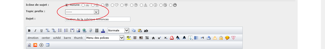 Afin d’apporter un peu de rigueur et d’améliorer la visibilité des annonces, cette section dispose d’une fonction : Topic préfixe (désolé le terme n’a pas été traduit par les concepteurs mais se comprend comme "préfixe du sujet").