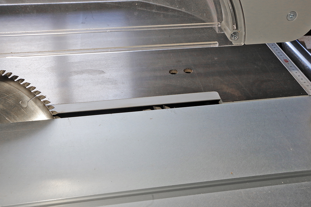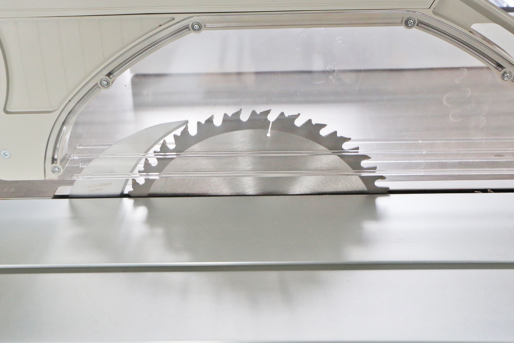 Les délignages (sciages dans le sens de la longueur) avec la lame à 90°(verticale). Le bois est positionné sur le chariot grâce aux butées réglées pour avoir des bandes de 150mm. Les tronçonnages (Sciages en travers) se font lame inclinée à 45°. Petit raffinement: l'inciseur. Cette petite lame dont on peu régler très finement la position (Y compris en épaisseur) par rapport à la lame principale, incise la surface du bois ou du revêtement (Mélaminé, plaquage...) sur quelques 1/10 et ainsi éviter les éclats qui pourraient être causé par la lame principale.
