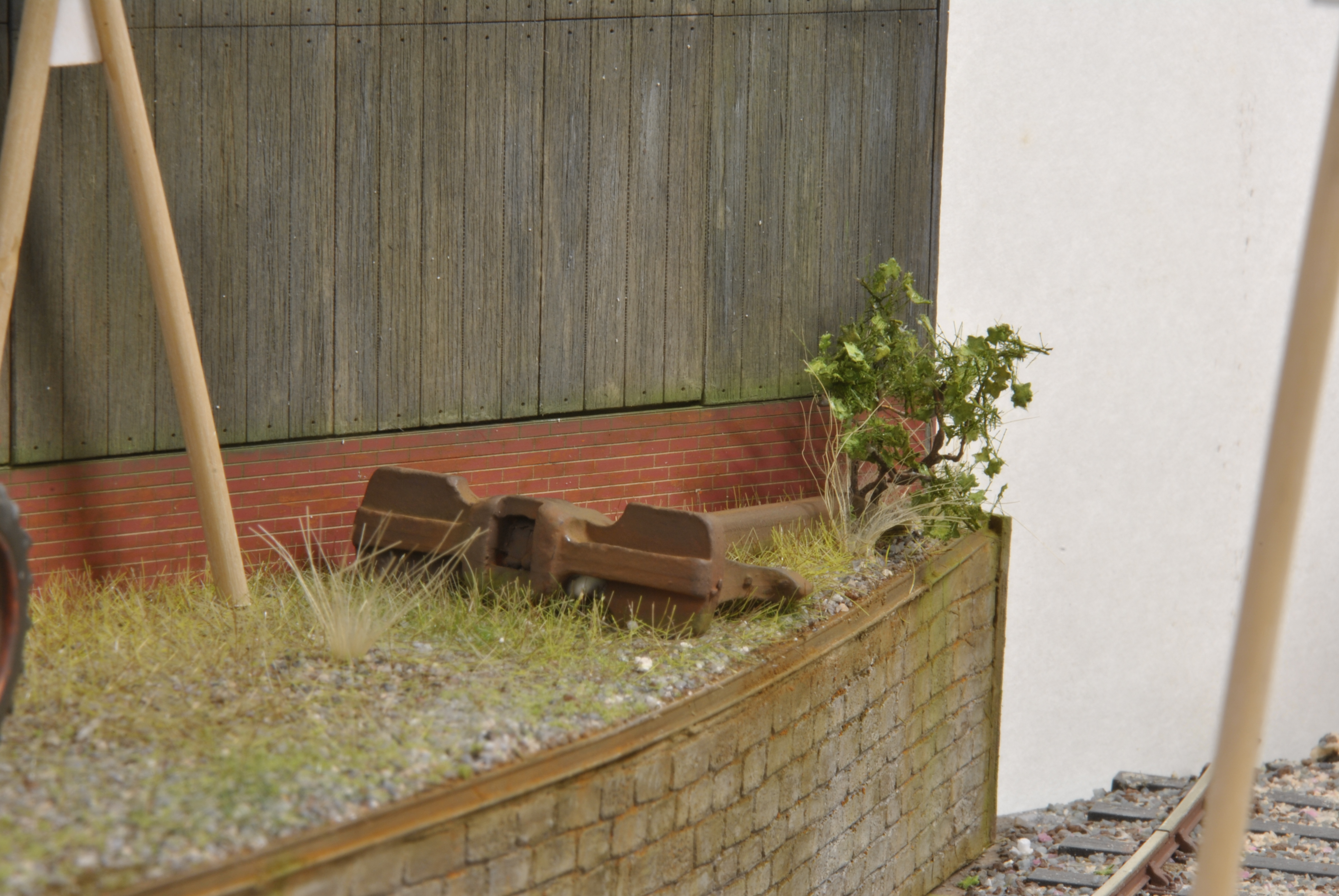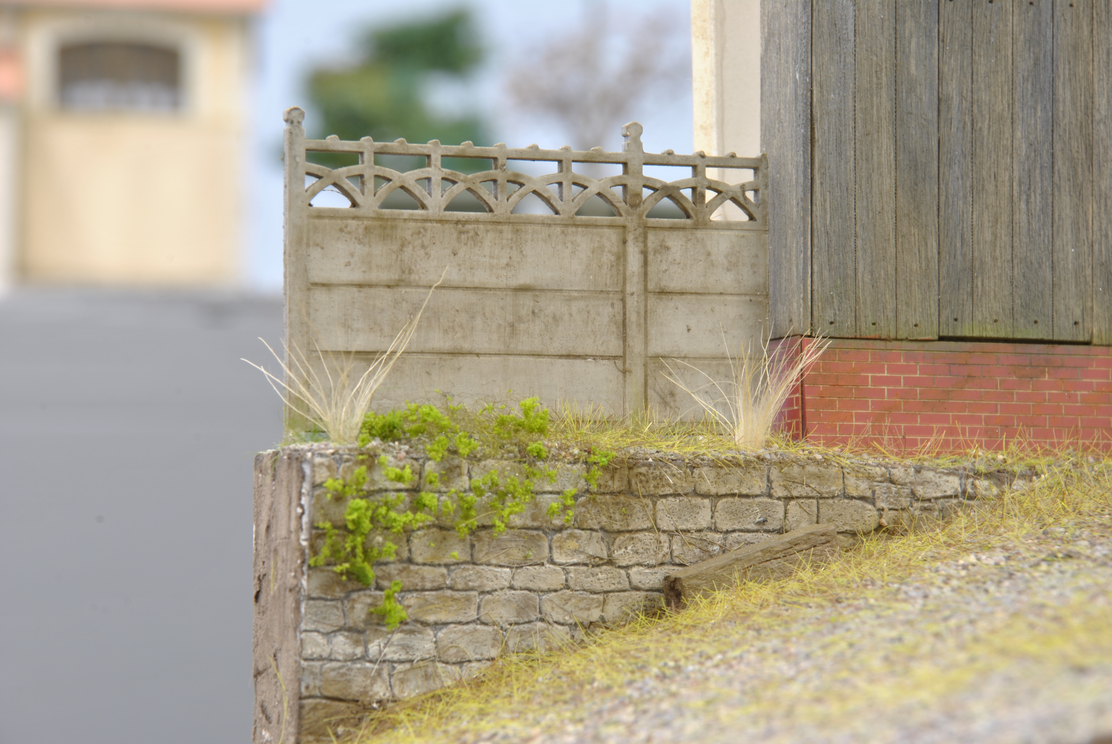 Ce soir c'était patine. Le muret et sa grille ont pris quelques embruns ce qui accélère le travail de la rouille... brossage de terres à décor pour la partie basse. Mini mousse imbibée de peinture Humbrol pour la grille, puis un brossage de terre à décor également.