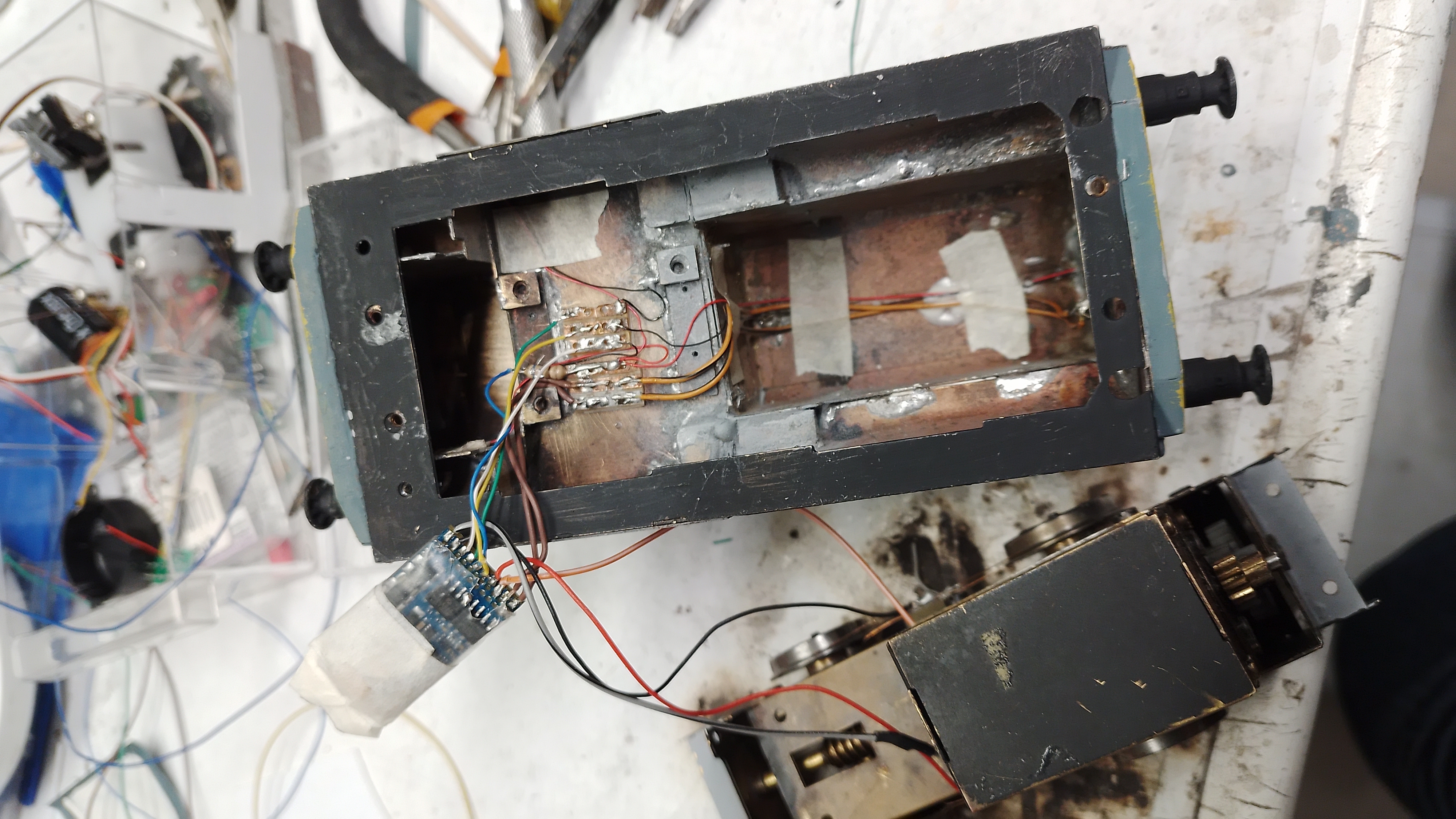 ) J'ai logé l'électronique, tout est noyé dans de la colle chaude en pistolet afin d'éviter les court-circuits.
