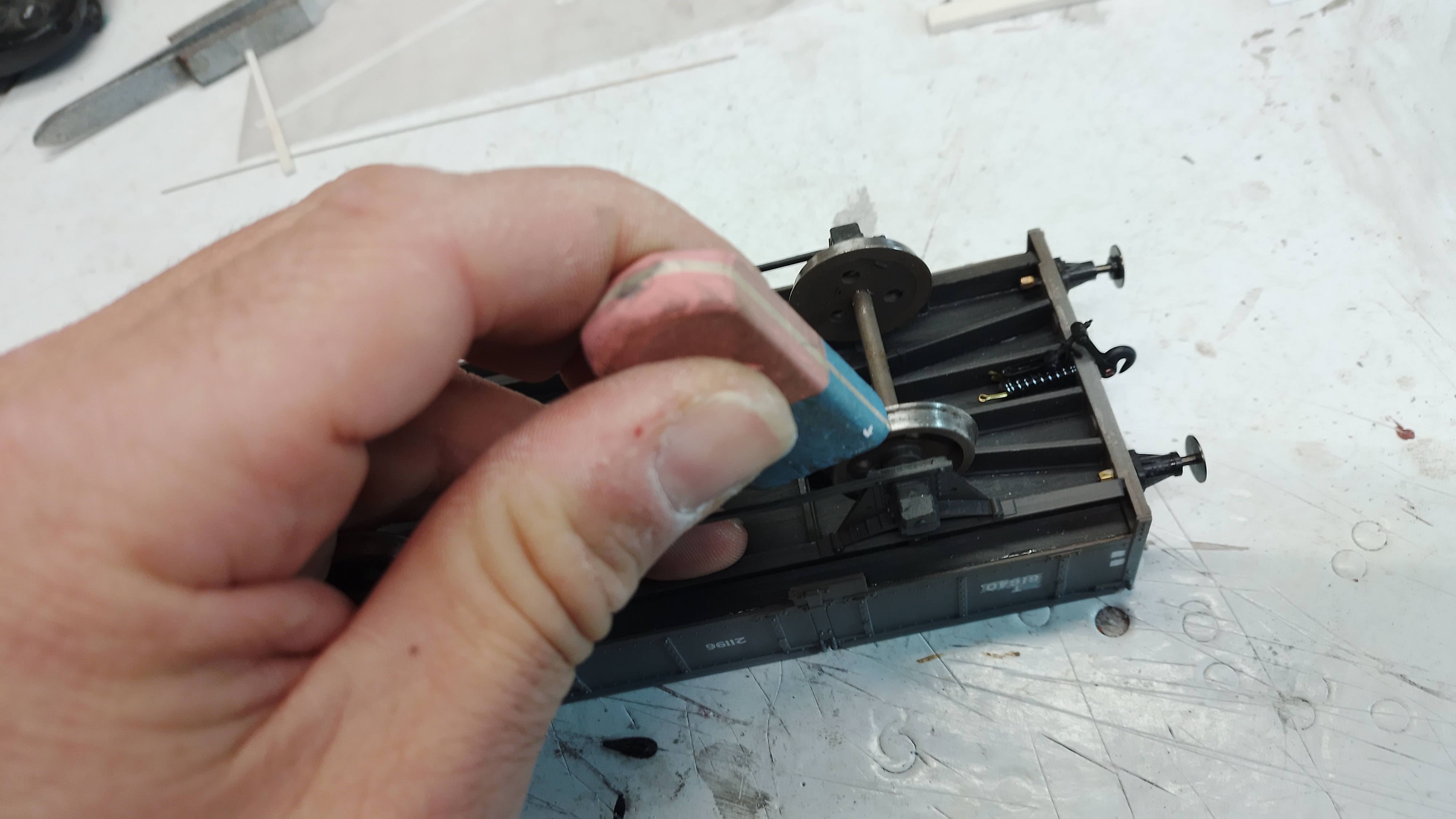Pour le matériel roulant, afin de ne pas rayer la bande de roulement, j'utilise la partie bleue d'une gomme d'écolier, bien moins agressive que la gomme Roco. Je l'utilise également pour les rails, lorsque qu'un peu de peinture ou de colle est fixée sur le rail.