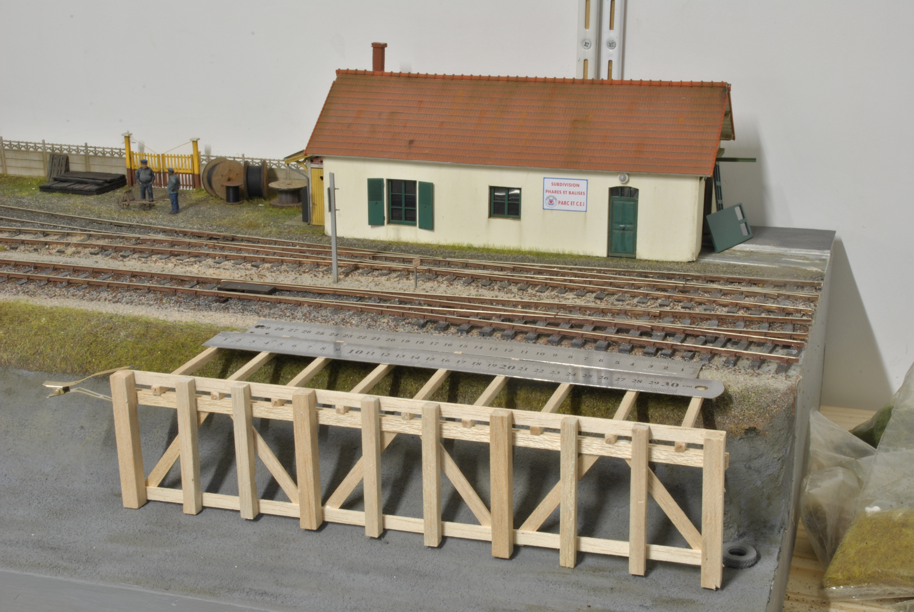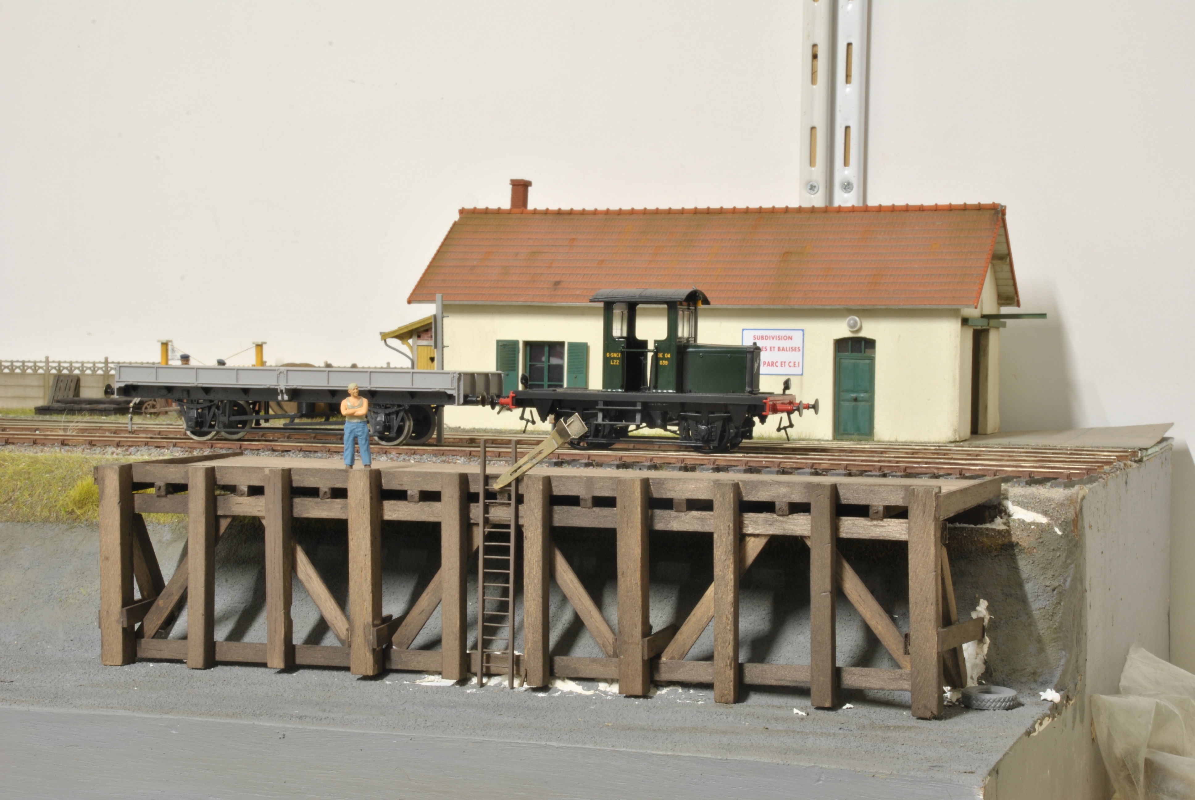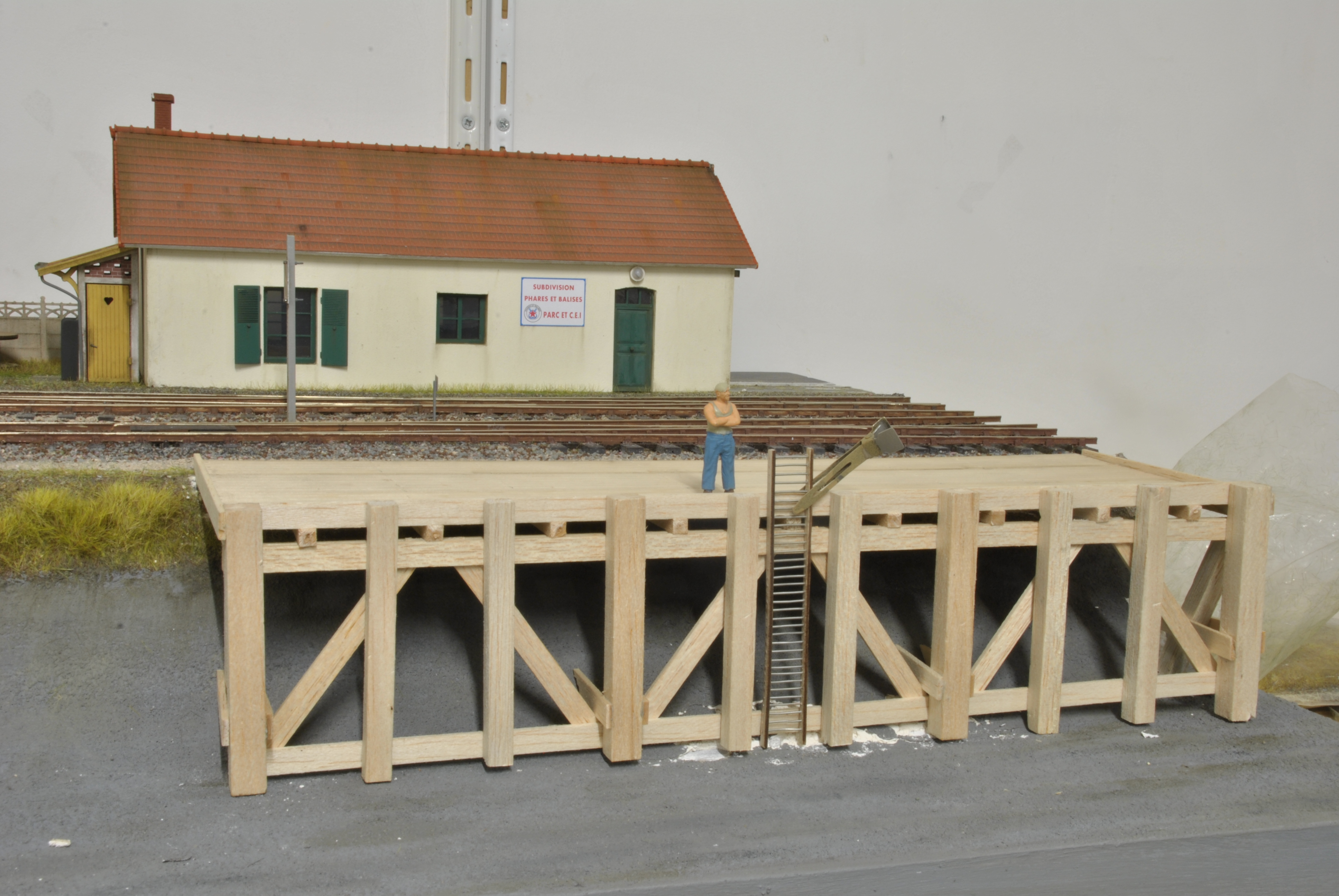 Pour l'échelle, c'est résolu, j'ai supprimé un échelon sur deux. Le ponton a une couche de peinture. Une photo du ponton réel. Et je continue à entasser du bazar dans la remise : des crics ou vérins (?), la brouette terminée. J'ai aussi fermé la fosse de visite par des planches. (La porte est déposée pour les photos).