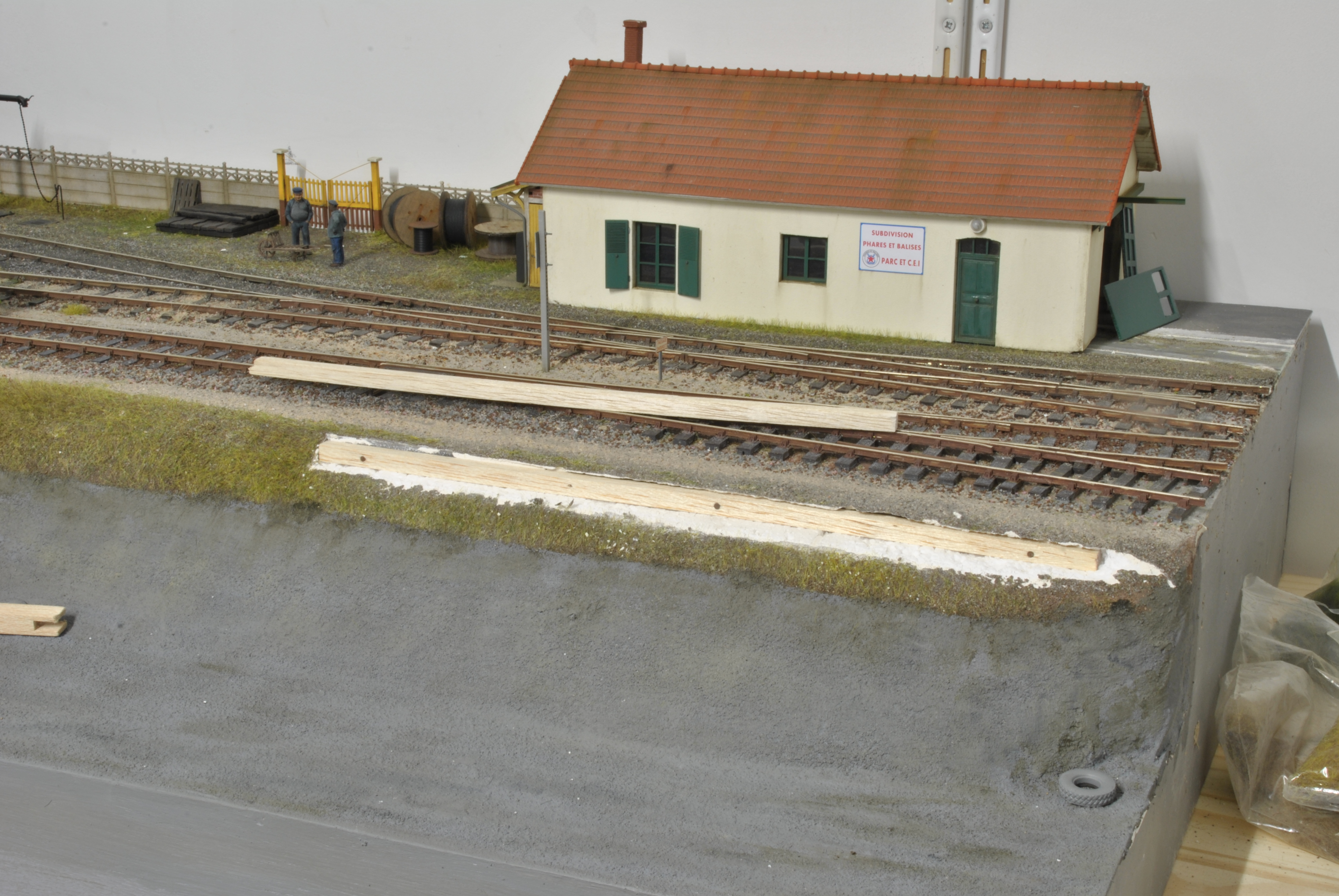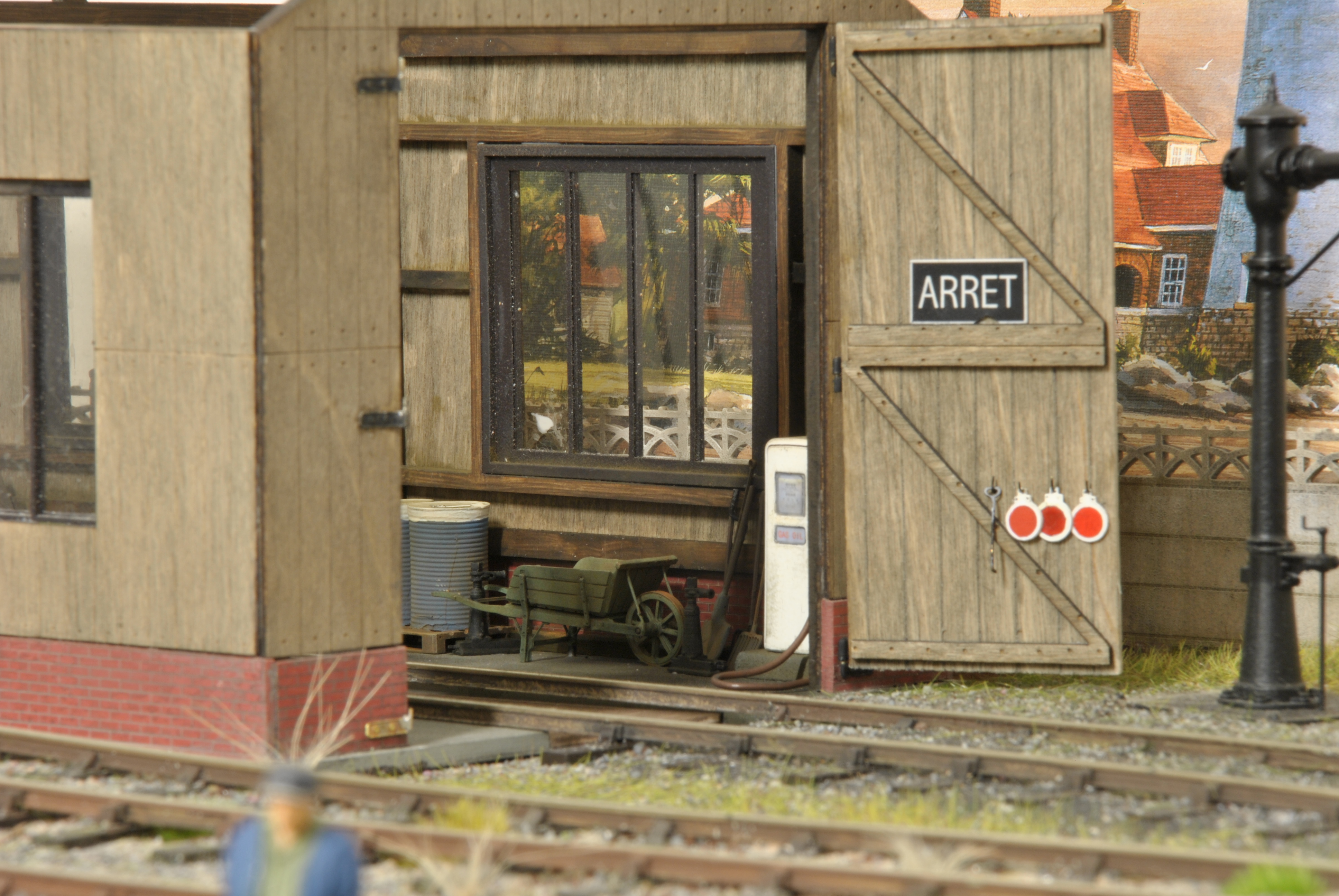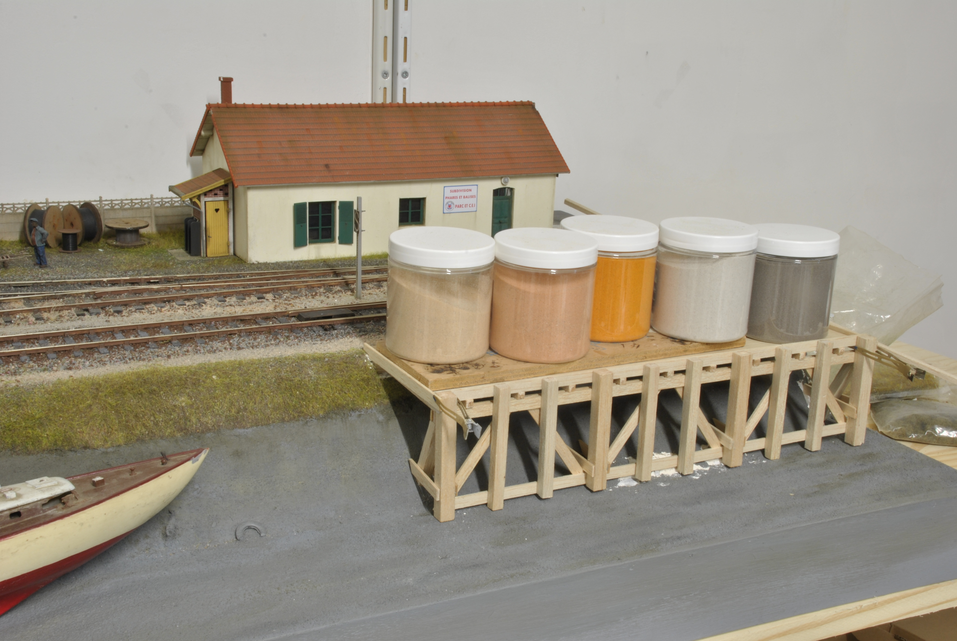 Pour l'échelle, c'est résolu, j'ai supprimé un échelon sur deux. Le ponton a une couche de peinture. Une photo du ponton réel. Et je continue à entasser du bazar dans la remise : des crics ou vérins (?), la brouette terminée. J'ai aussi fermé la fosse de visite par des planches. (La porte est déposée pour les photos).