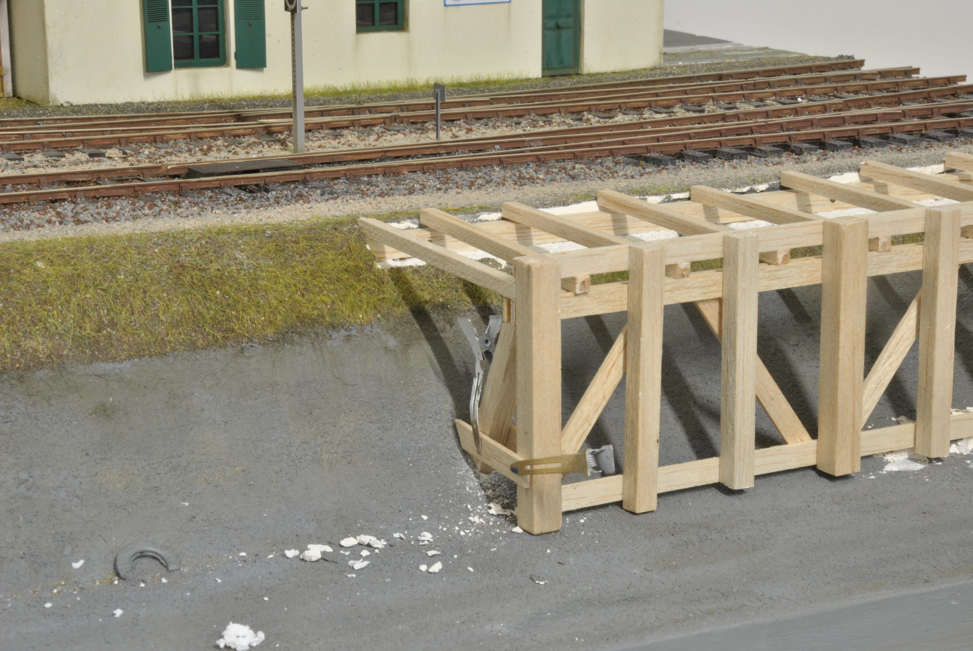 Une première poutre de maintien est posée au futur emplacement sur la berge. L'ossature est faite en balsa, j'en ai un grand stock. Les angles sont préparés Je termine par coller le plancher en contreplaqué, gravé avec une pointe à tracer. Il est fermement maintenu pendant le séchage. Pendant le séchage, j'ai préparé une échelle, mais les barreaux sont trop serrés