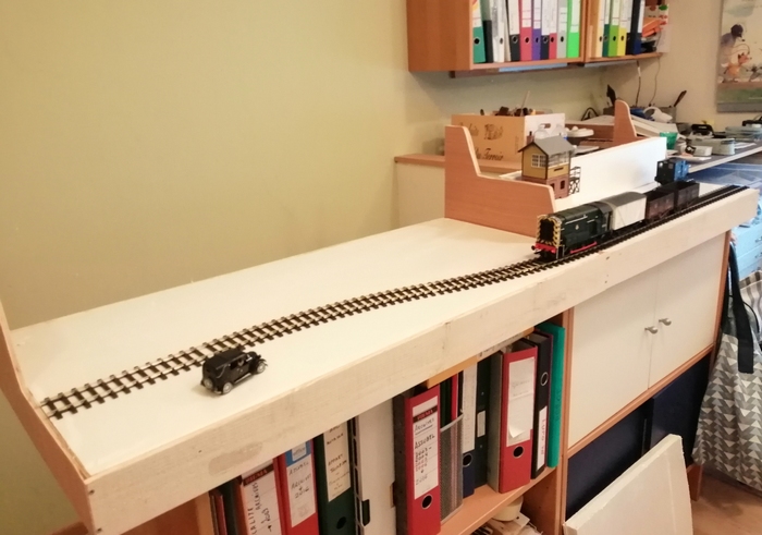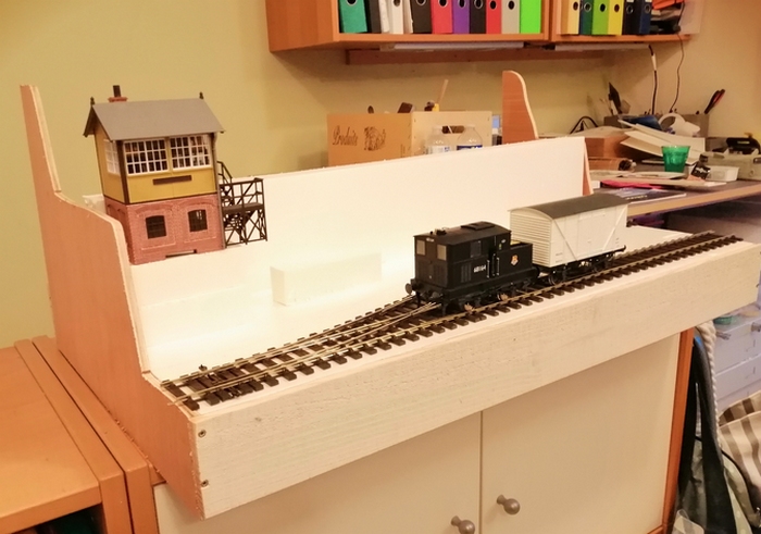 Cette idée de faire la table de roulement en polystyrène extrudé me semble excellente, je n'y aurais pas pensé. Bien sûr, ton matériel roulant est très léger, mais au pire, en glissant quelques renforts transversaux pour soutenir la plaque, on doit pouvoir faire rouler du lourd. L'épaisseur de la dalle et son collage continu sur l'encadrement bois assure de plus l'indéformabilité du caisson.