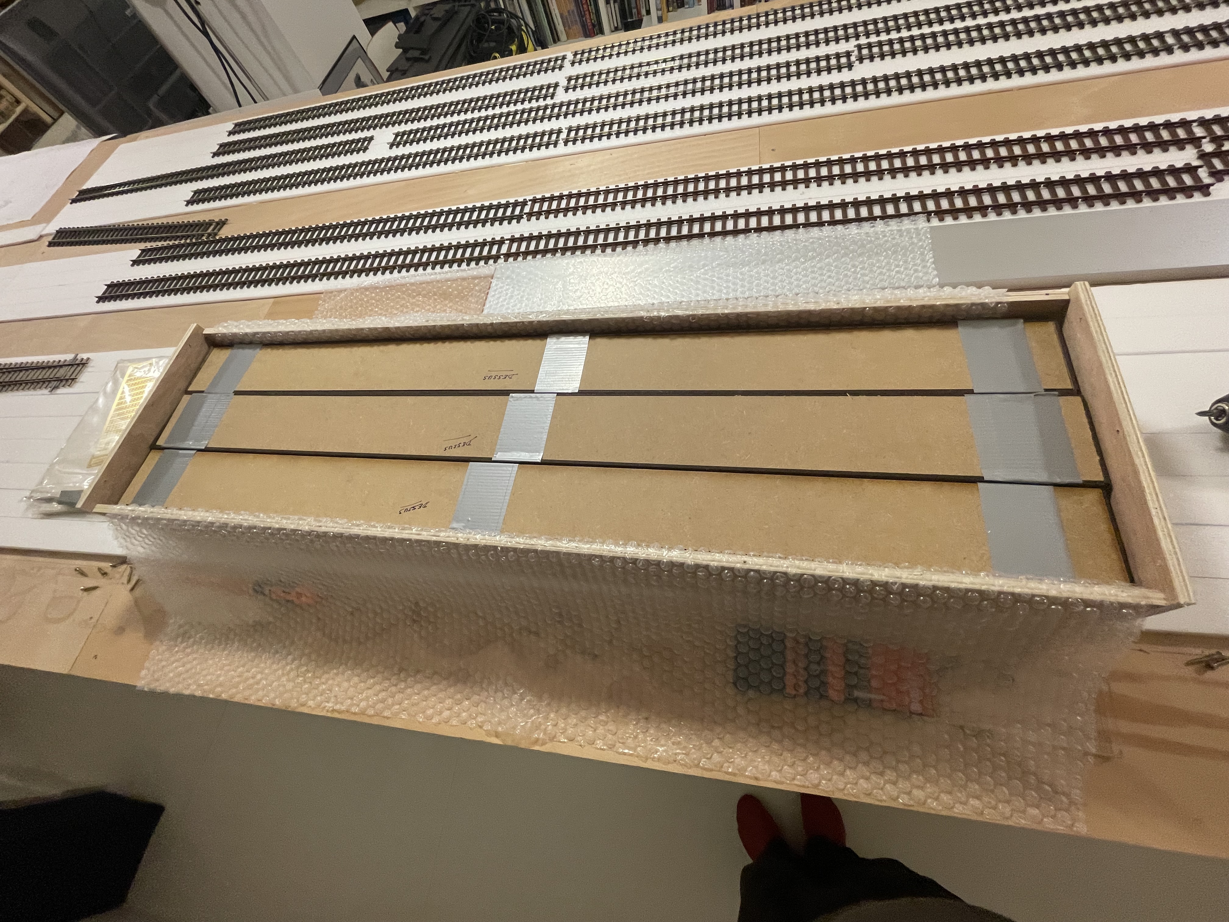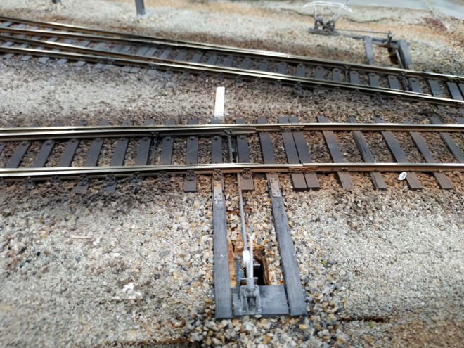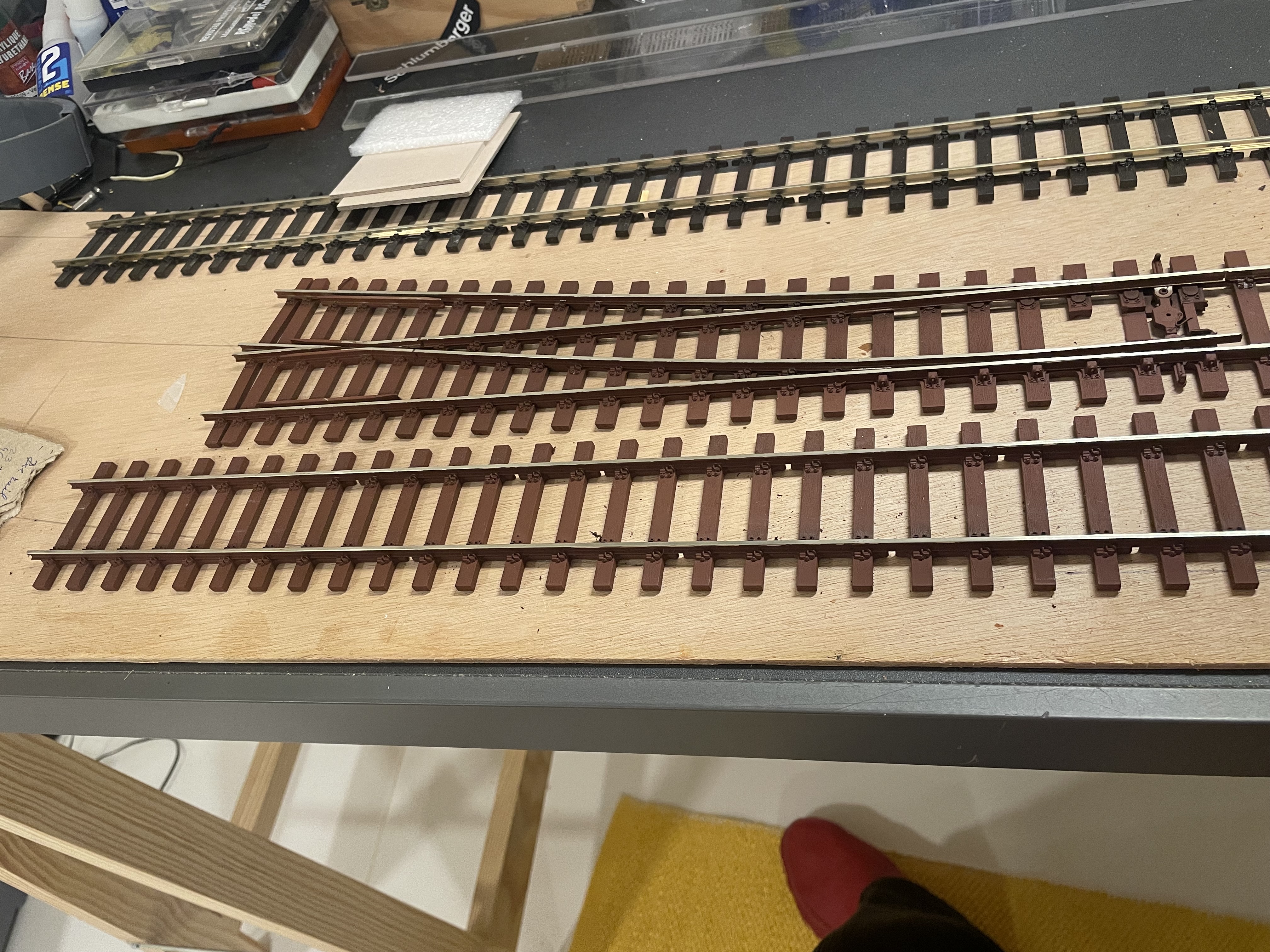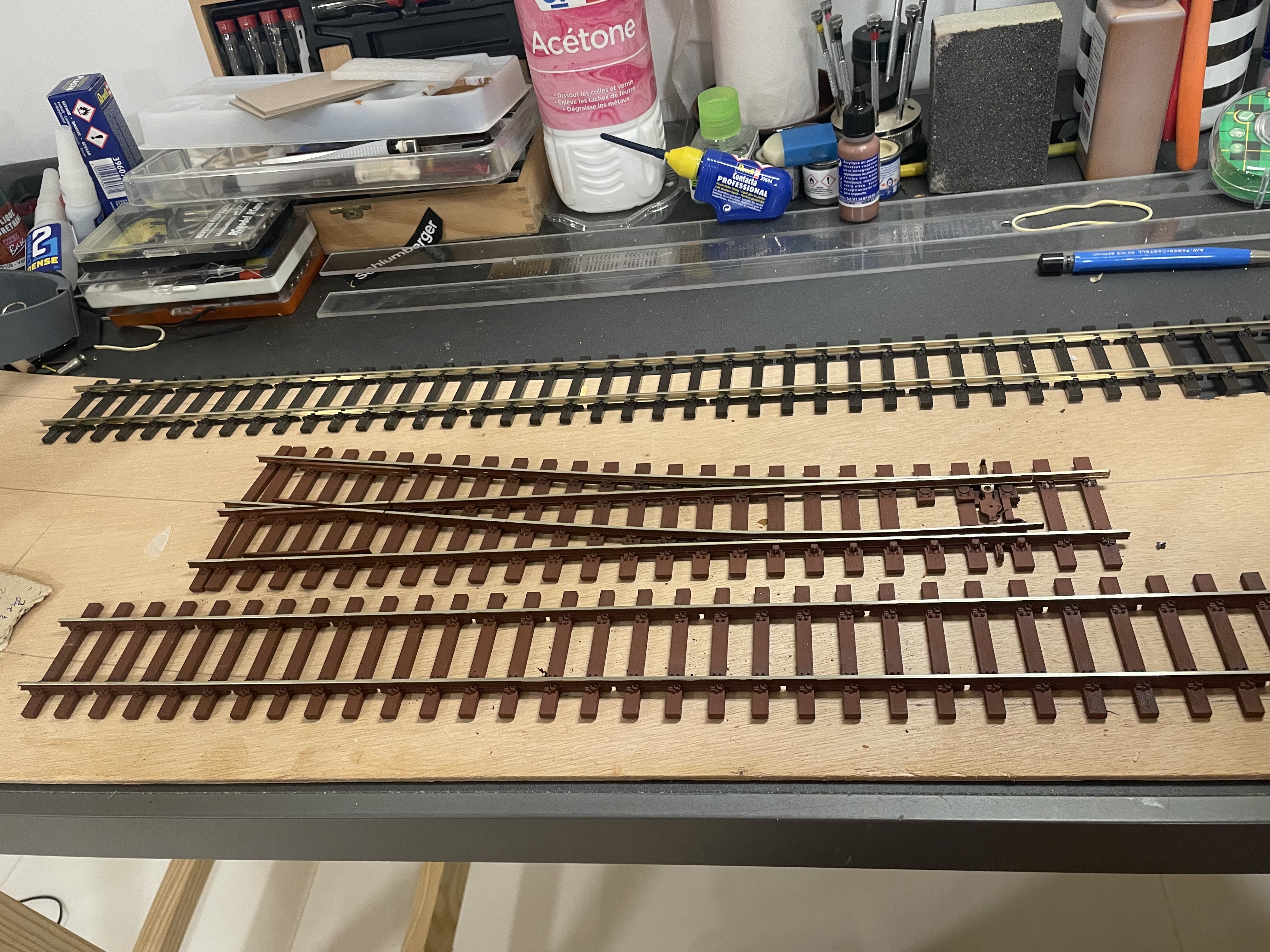 J'ai même passé une déviation Peco à la bombe après avoir enlevé l'affreux capot... Reste à réparer les traverses. Reçu aujourd'hui 60 mètres de travelages avec les selles correspondantes. Fabrication Bernard Lucas.