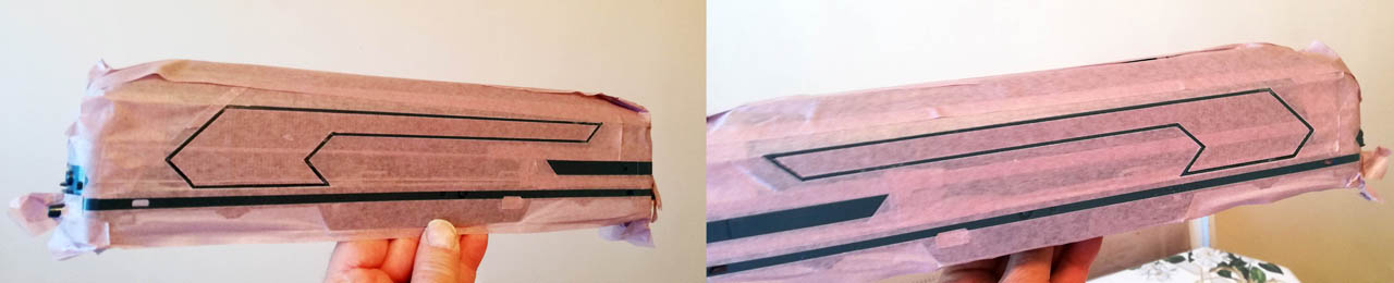 Je passe à la peinture blanche. J'ai pris du ruban de masquage force 2 sur 6, c'est-à-dire peu adhésif. Très long travail de masquage. .