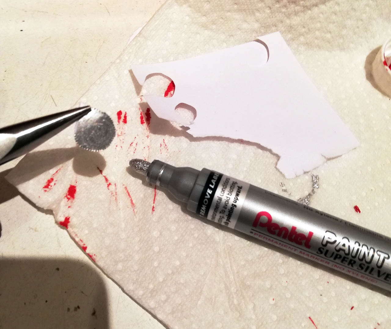 Une fois sèche, sur un bout de papier découpé, je passe du feutre argenté/chrome dessus. .