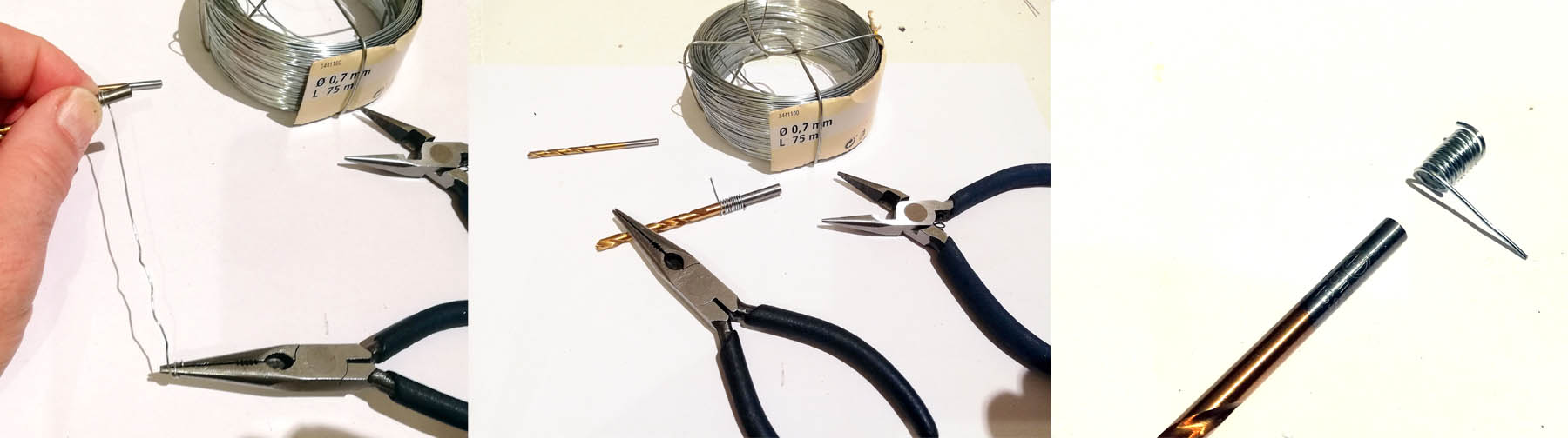 J'ai donc pris du fil de fer de 0,7 mm. On l'enroule sur un foret de 3 ou 4,5 mm, en tirant bien sur le fil. .