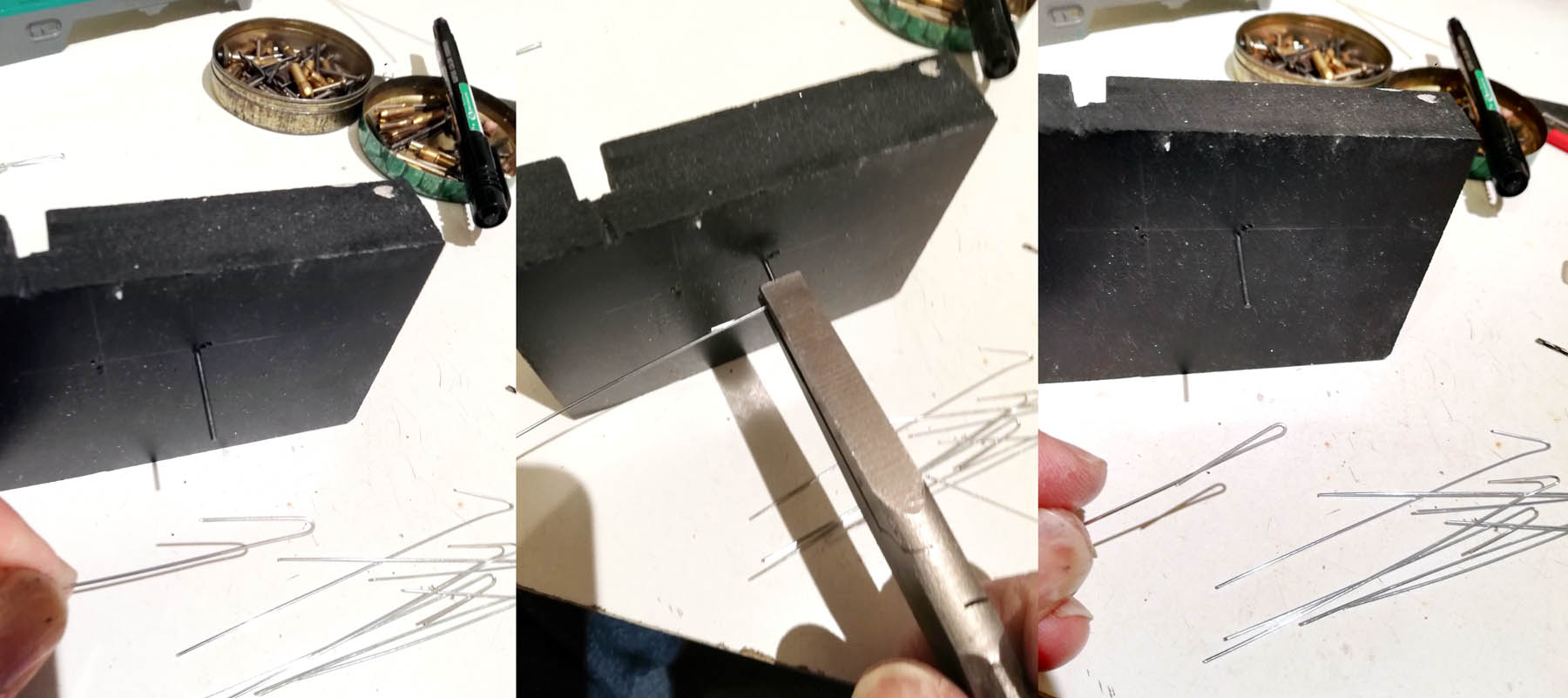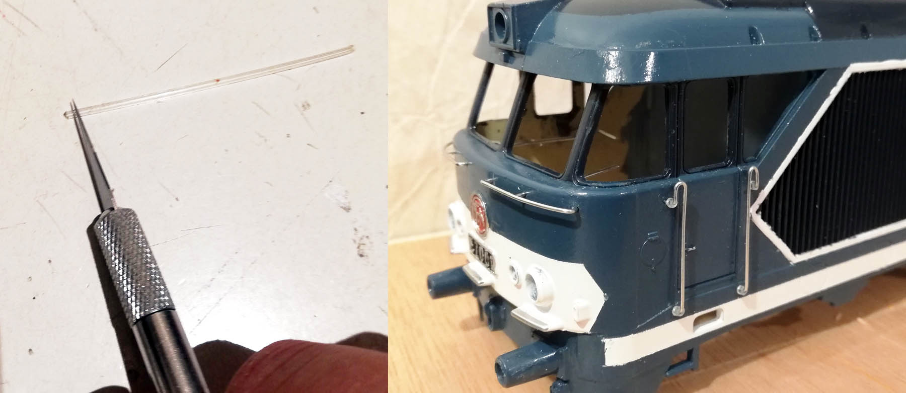 Pour mes locomotives, je voulais des mains montantes chromées, comme sur les CC72000. J'ai pris du fil de fer de 0,7 mm, bien qu'il soit très souple. La corde à piano ou des tiges d'inox auraient peut être été mieux ?