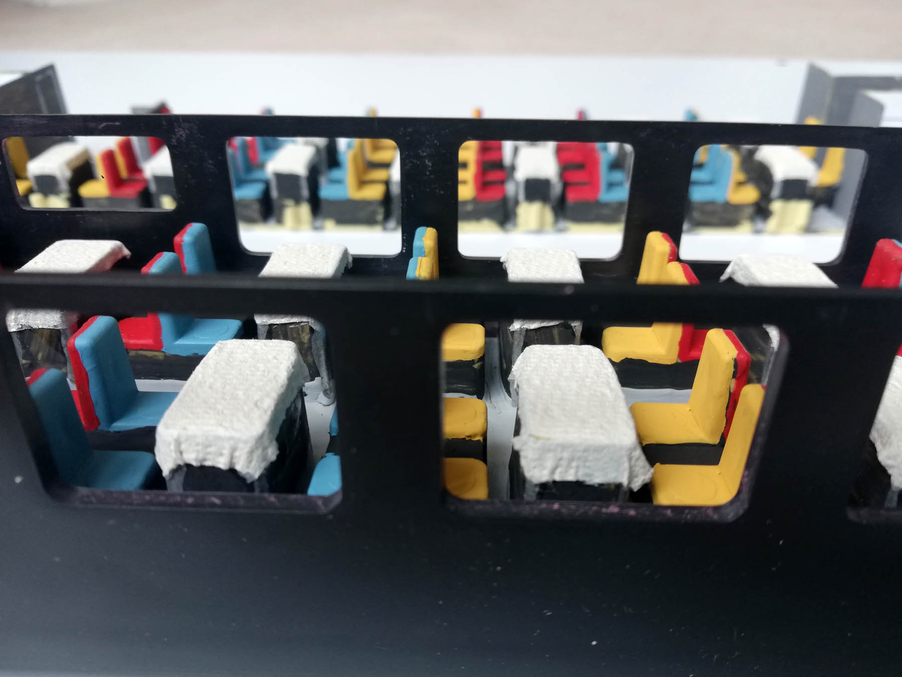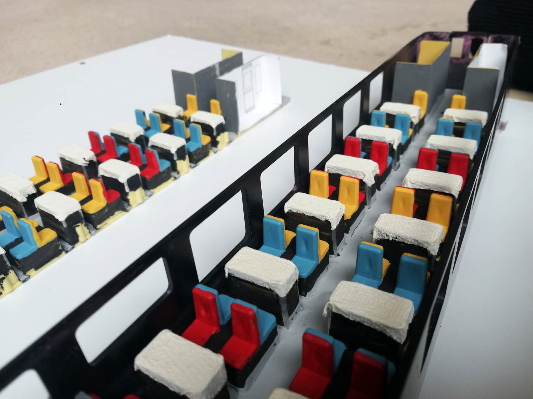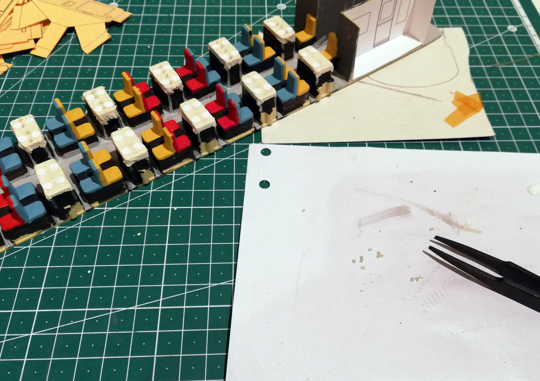 J'ai peint le sol en gris, puis les tables et les sièges en noir, avant de les mettre en couleur.