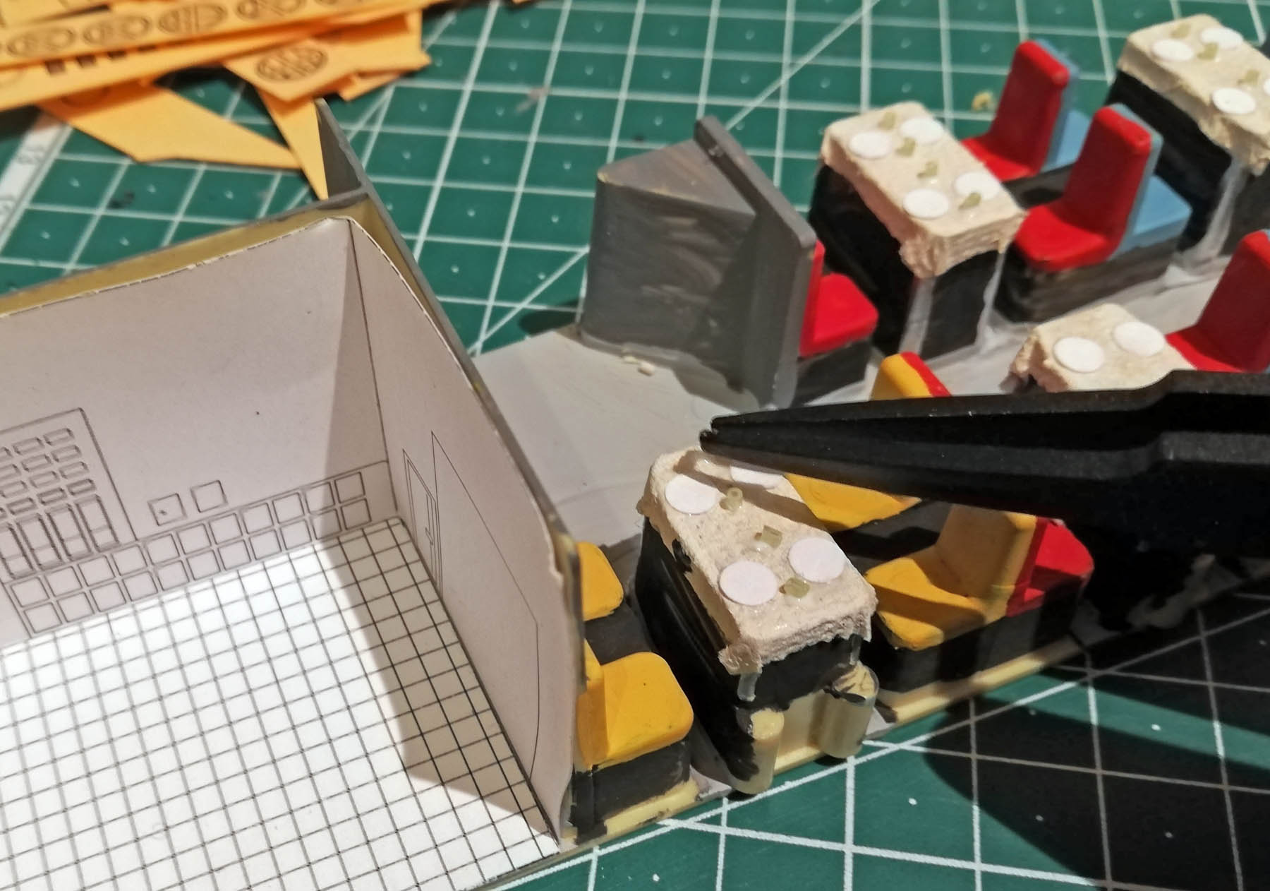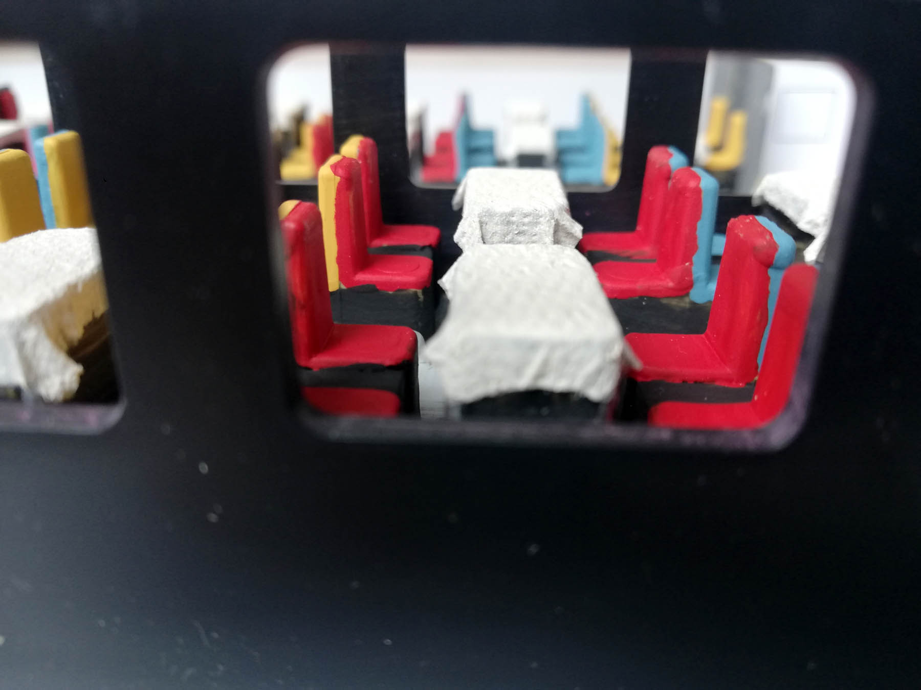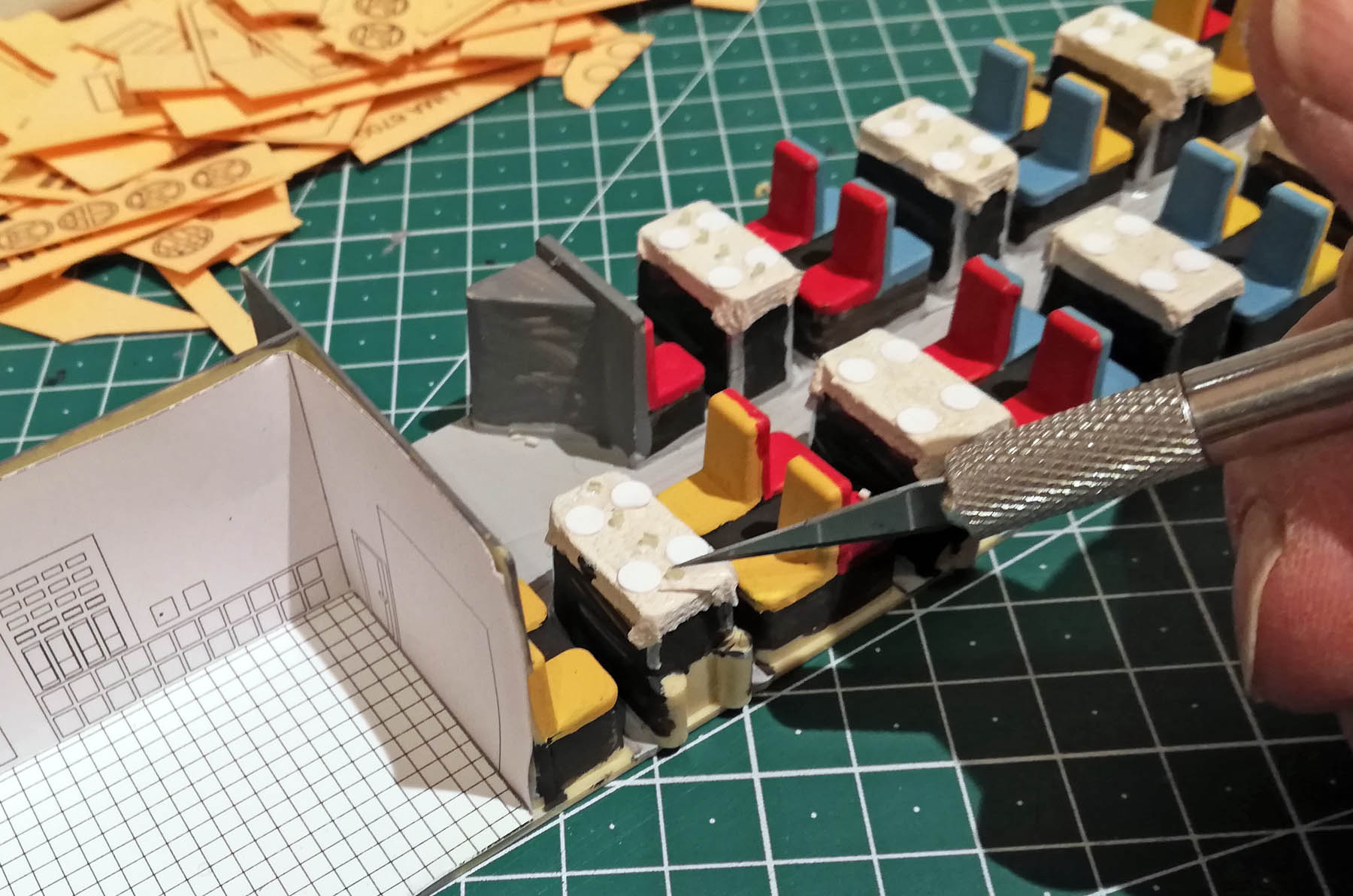 J'ai peint le sol en gris, puis les tables et les sièges en noir, avant de les mettre en couleur.