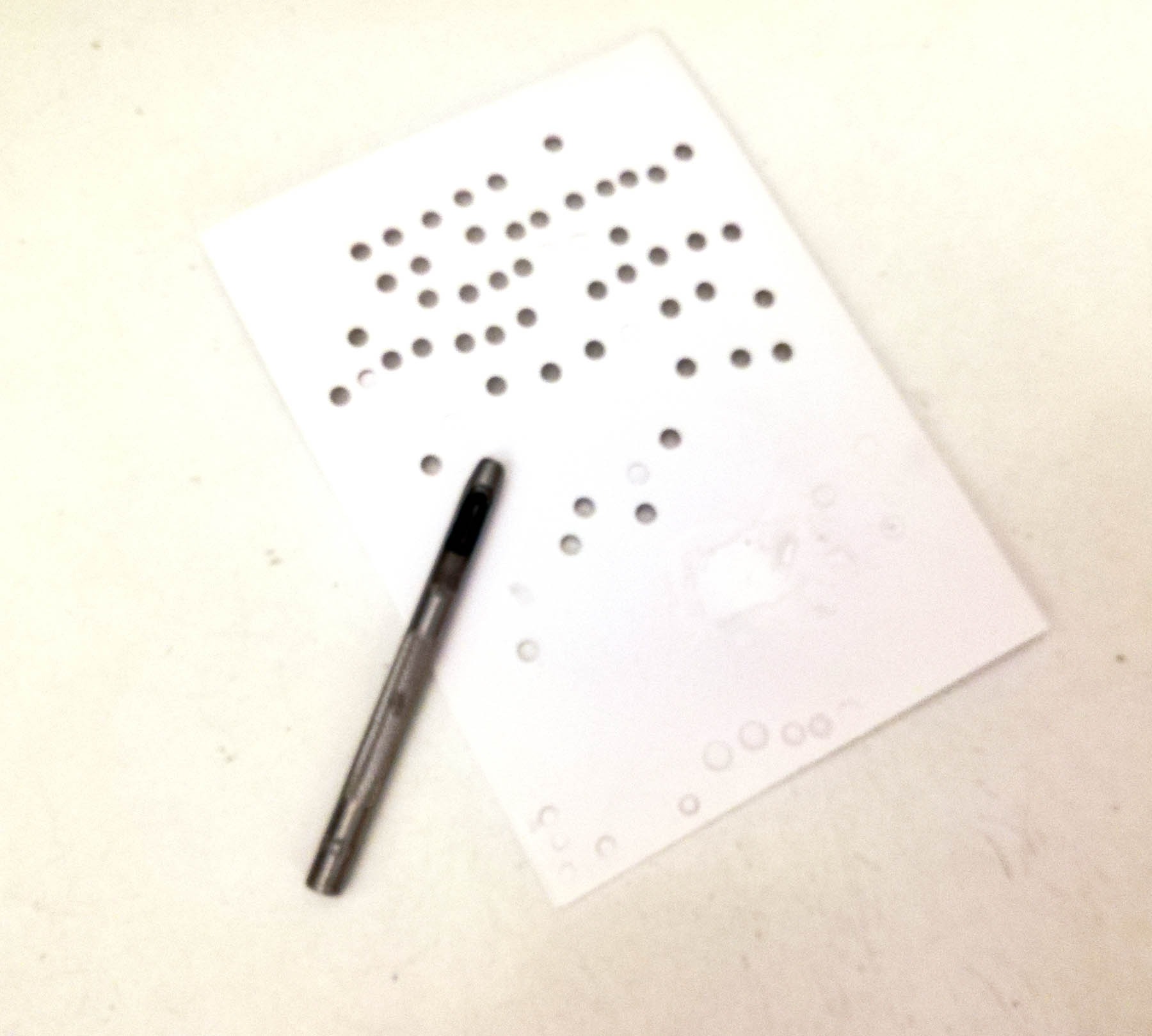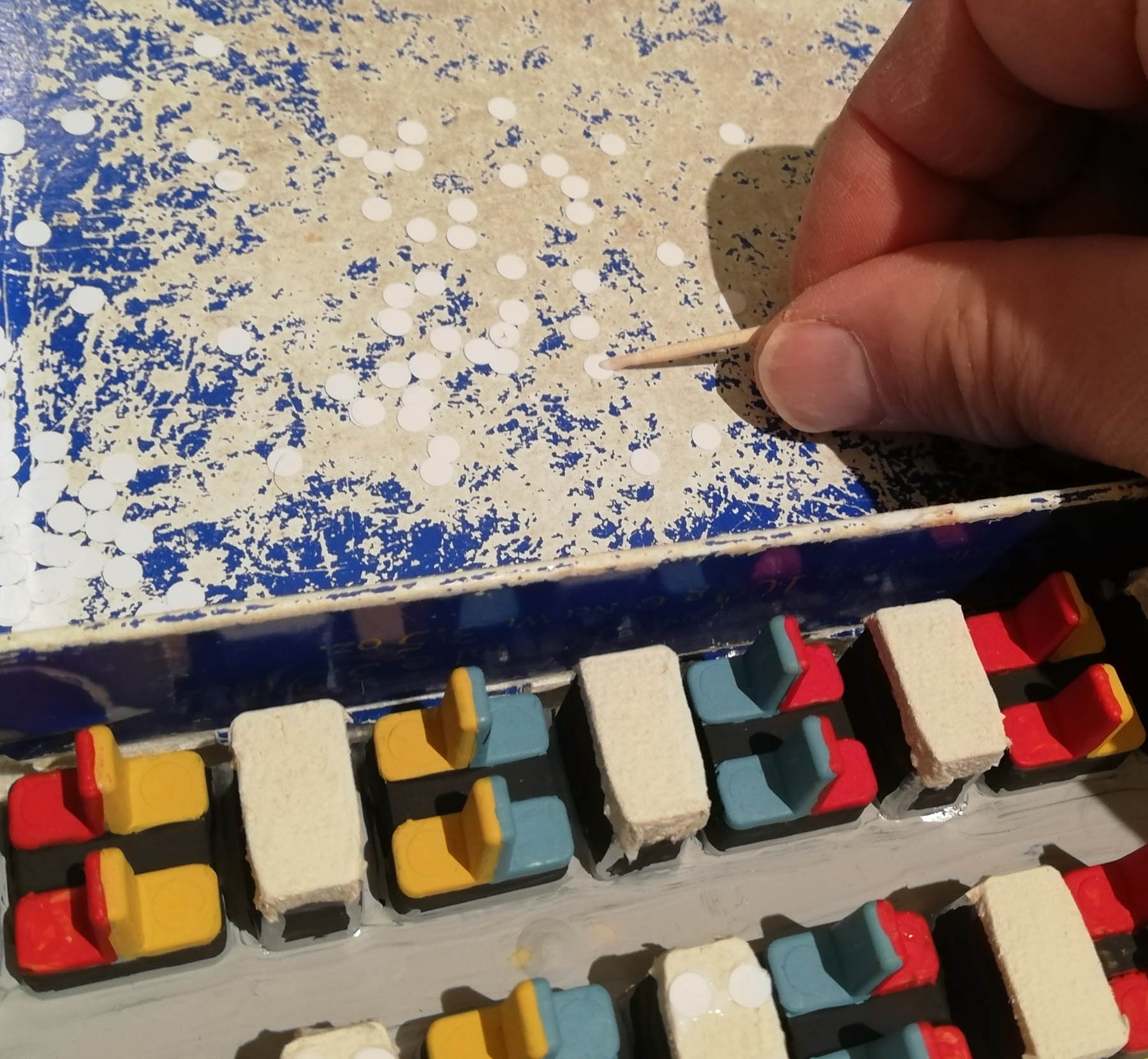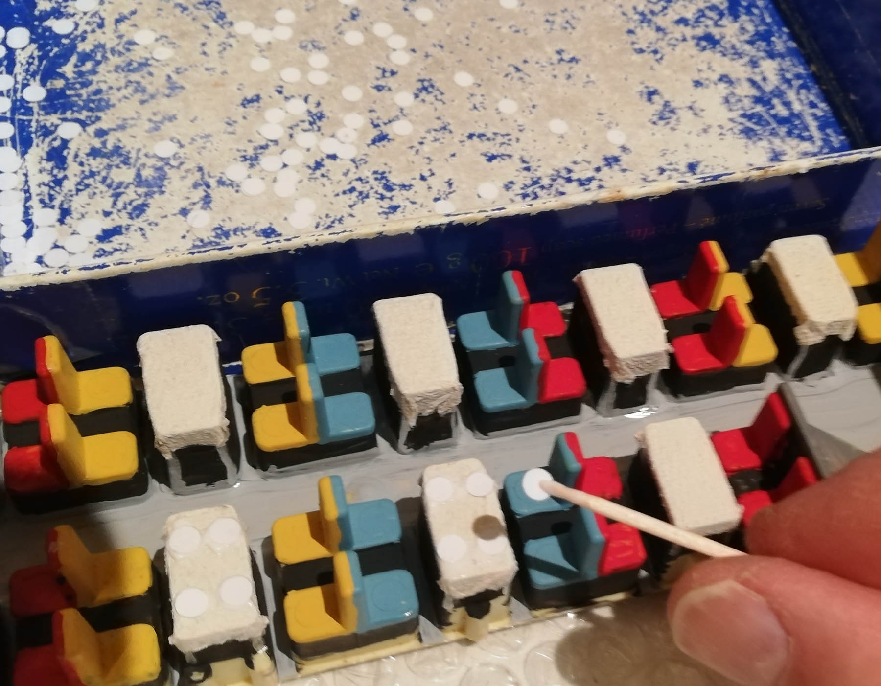 Avec un cure-dents, je dépose 4 mini-gouttes de colle blanche sur la table.