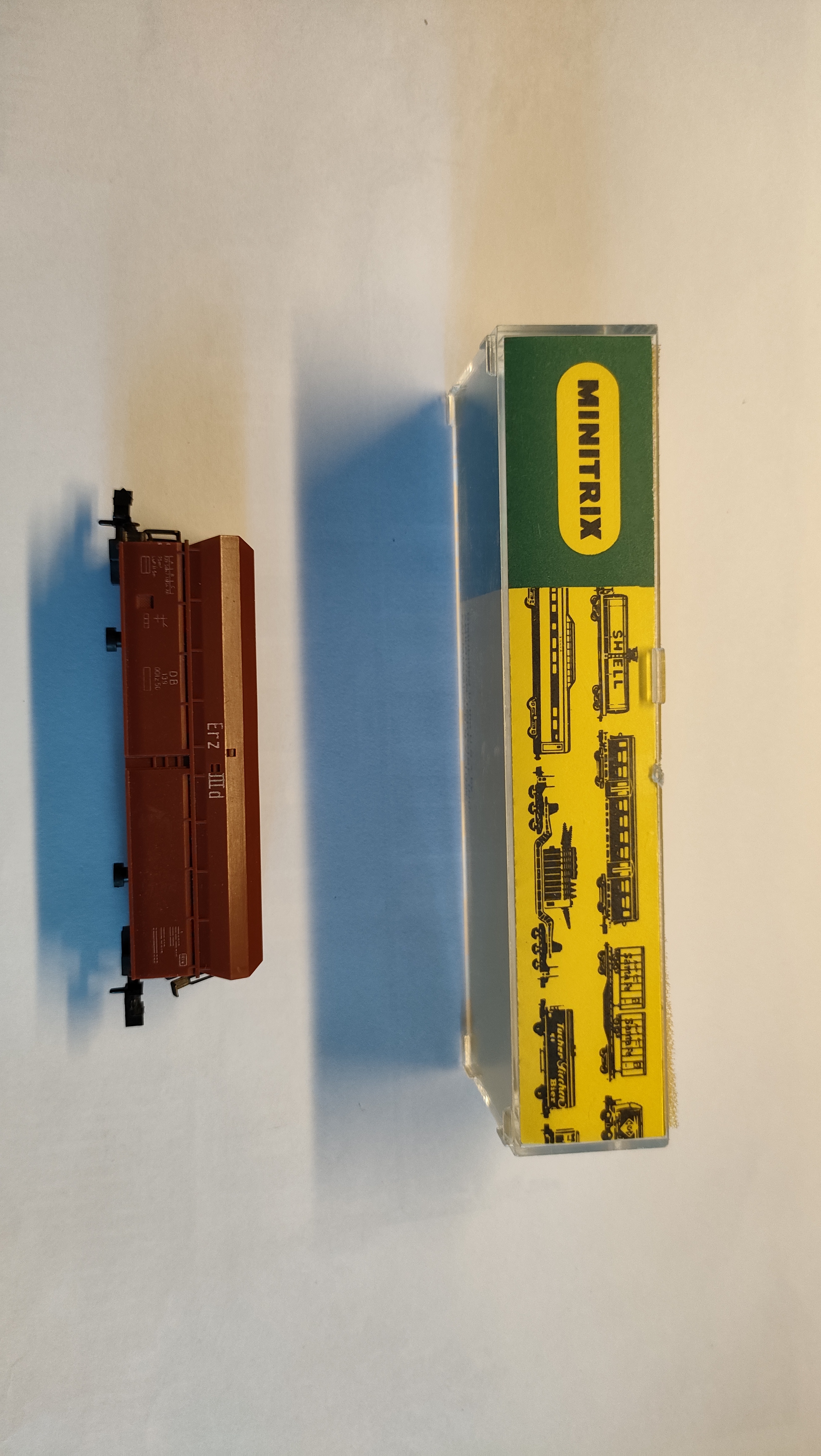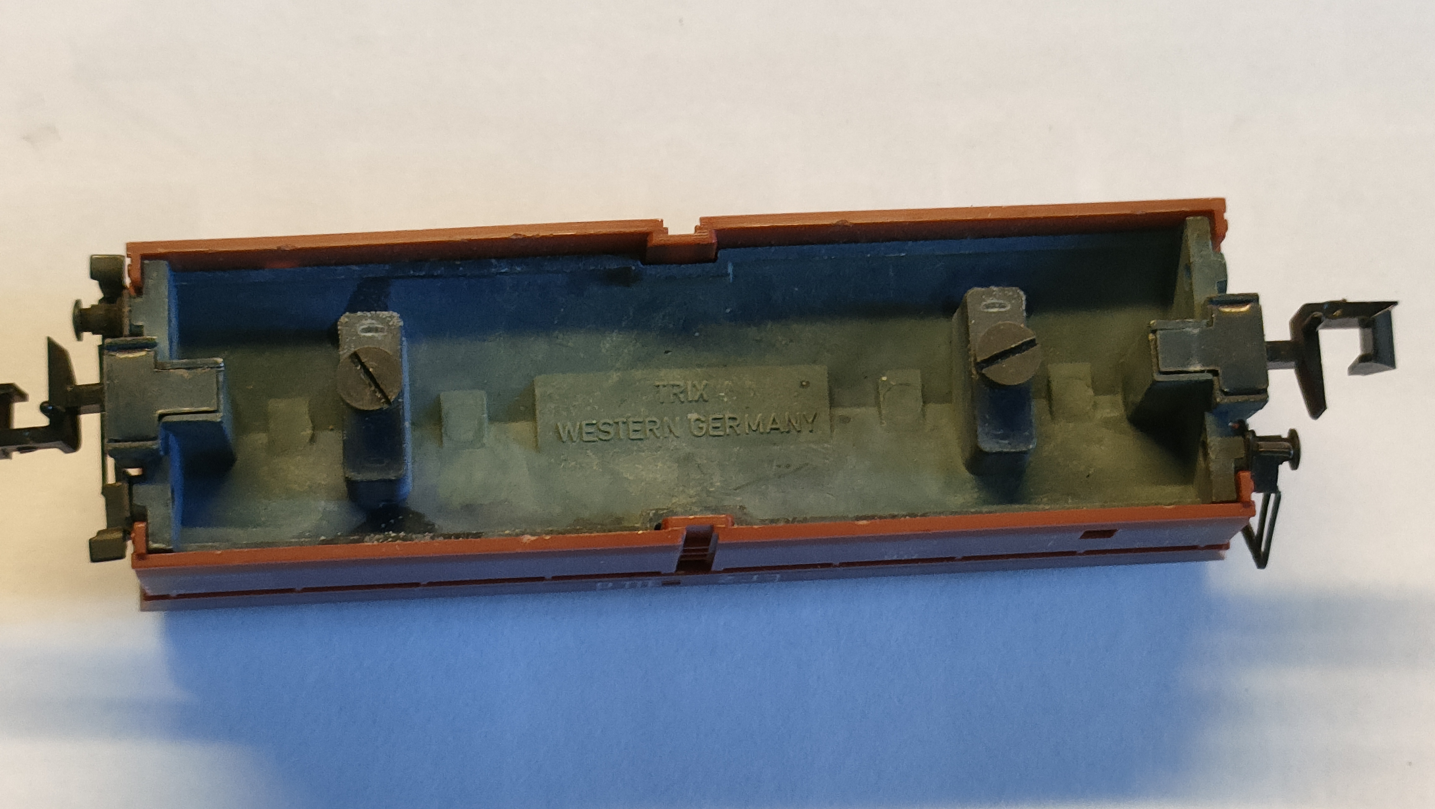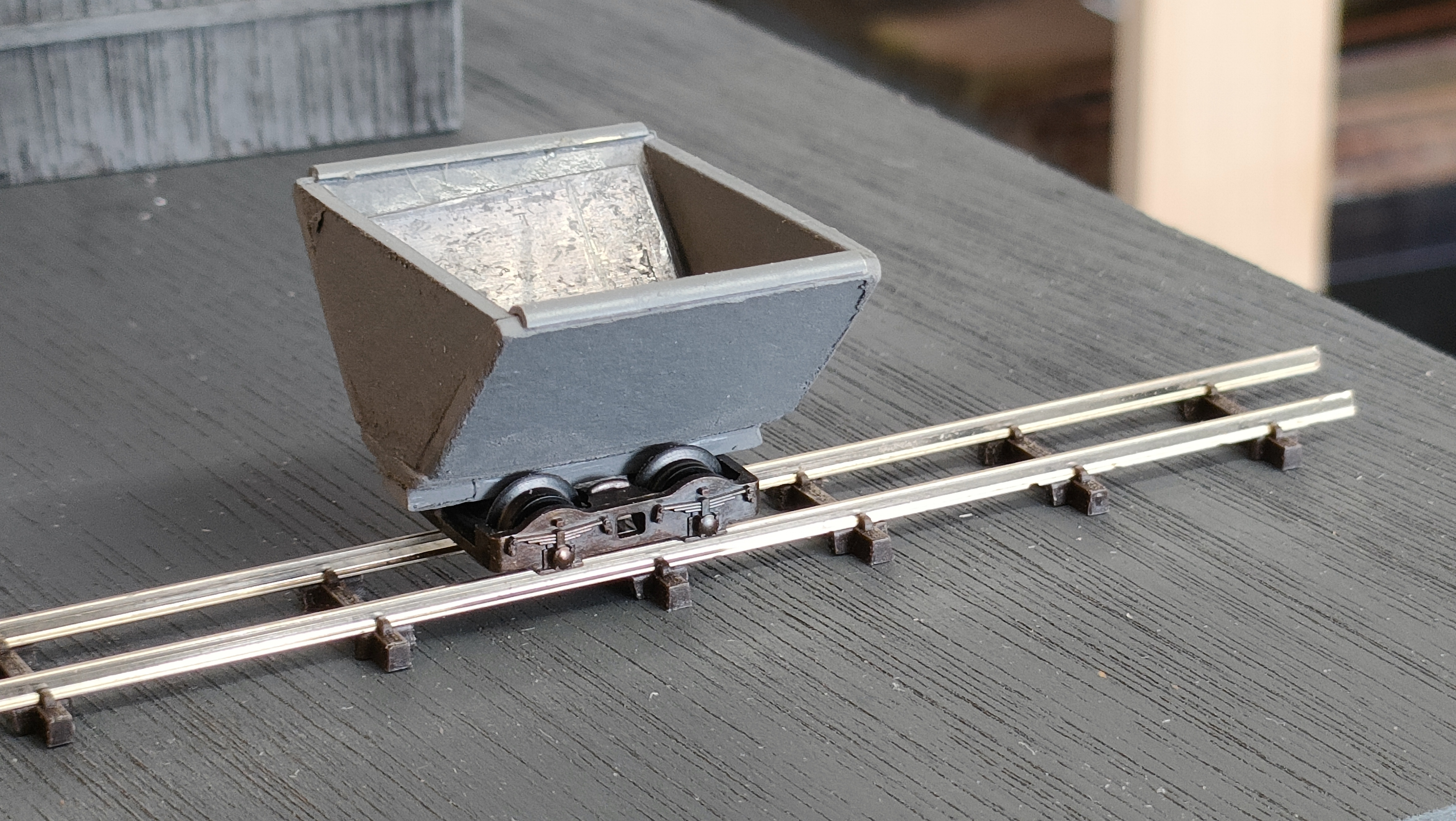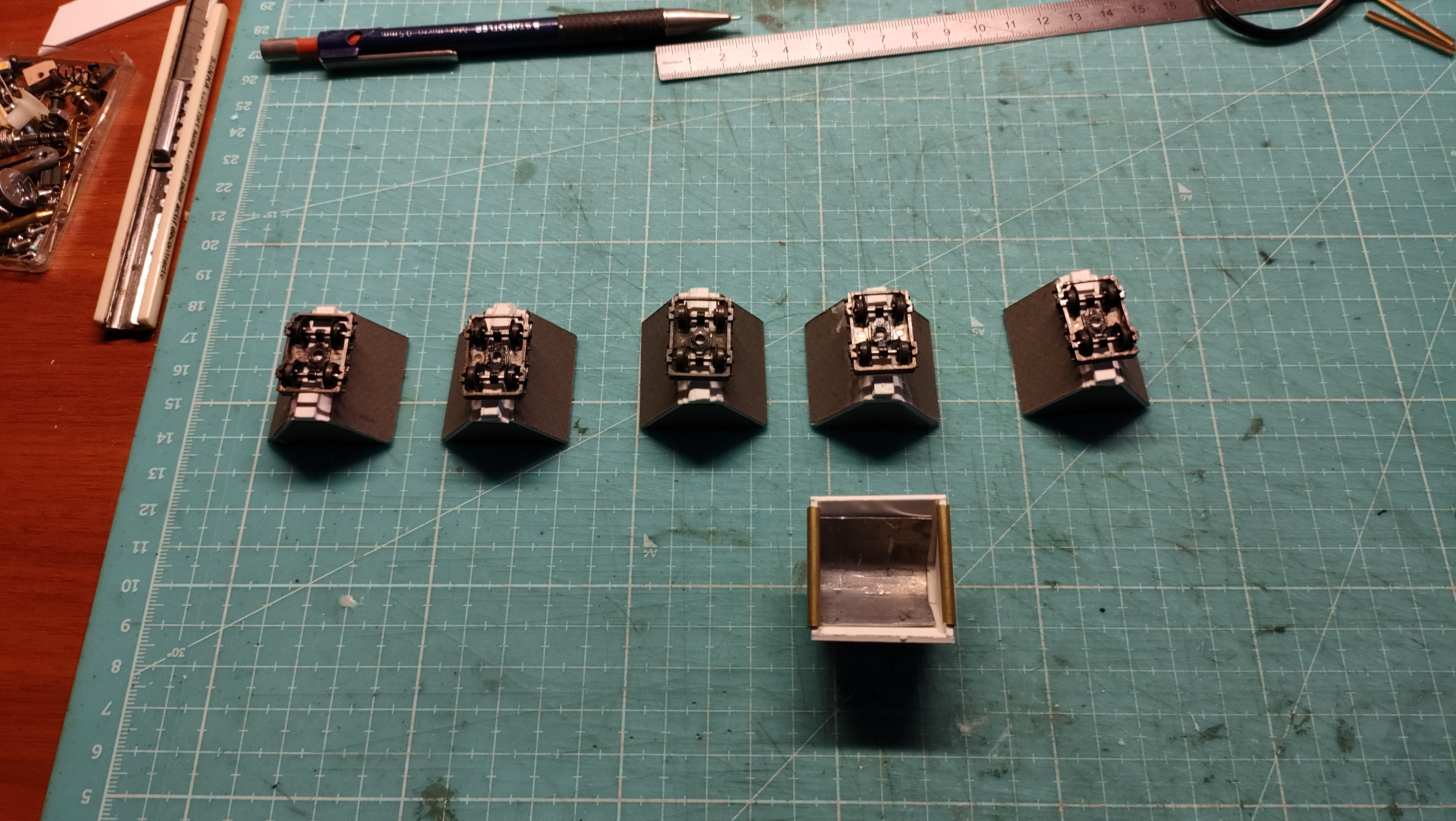Donc j’ai réalisé ces wagonnets en carton de 1 mm d’épaisseur, et lester avec de la feuille de plomb. Comme j’ai pratiqué l’échelle N (1/160ème) et qu’il me reste du matériel, j’ai prélevé des boggies sur des wagons de la marque Minitrix (ça va marcher beaucoup moins bien).
