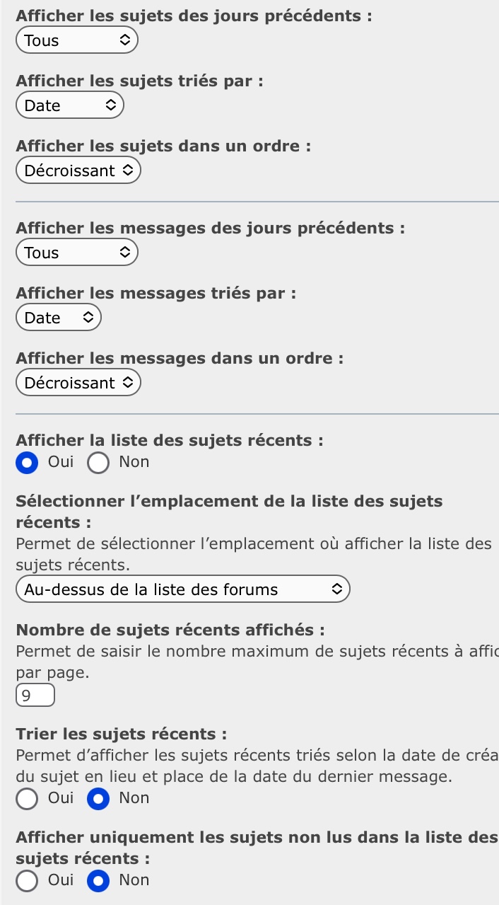 Pour l’affichage des sujets et messages du forum, voyez dans votre profil les choix possibles dans préférences du forum, qui s’appliquent quand vous êtes connectés.