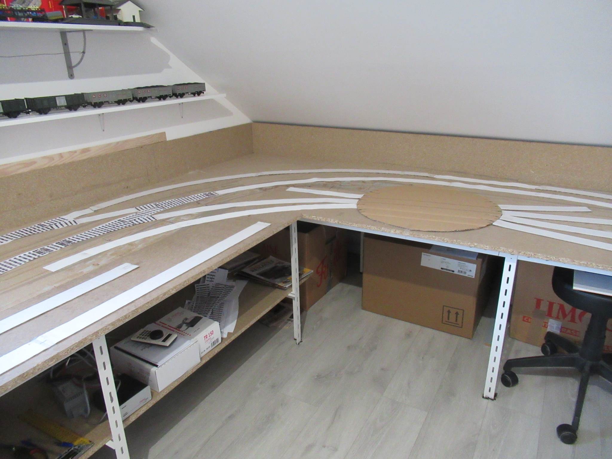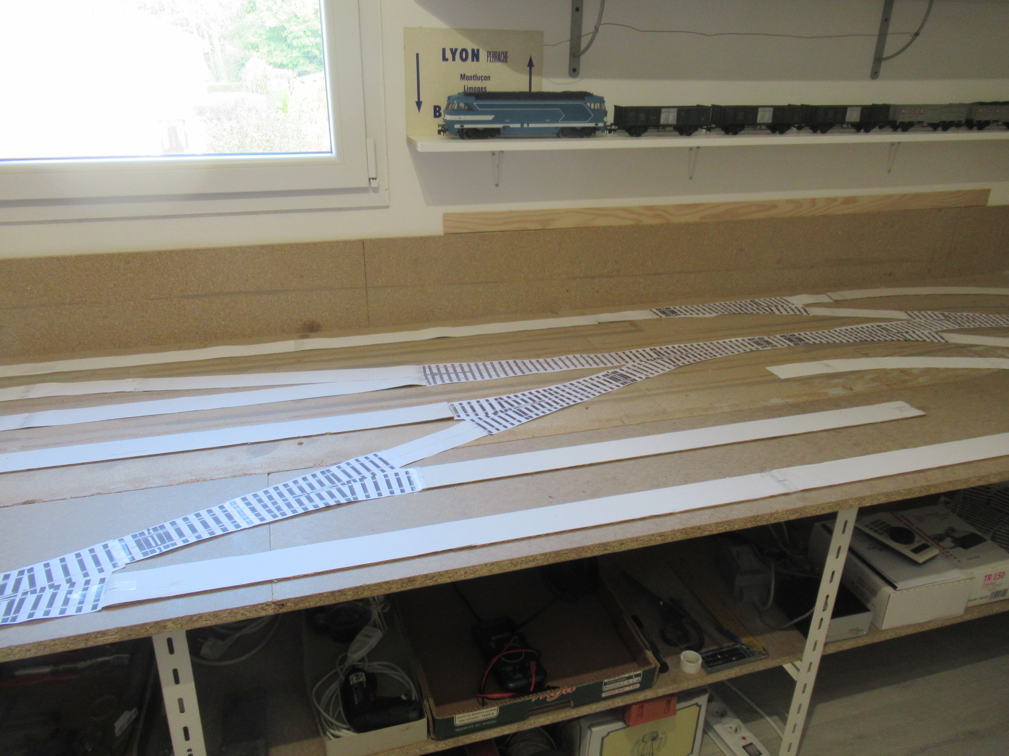 Dans un premier temps , plutôt que faire un simple tracé pour sur le plateau , j'ai découpé des bandes de carton et papier aux dimensions et rayons souhaités pour matérialiser les futurs éléments de voie ( pour les aiguillages , ce sont des gabarits papier que l'on peut télécharger sur le site de Peco ).