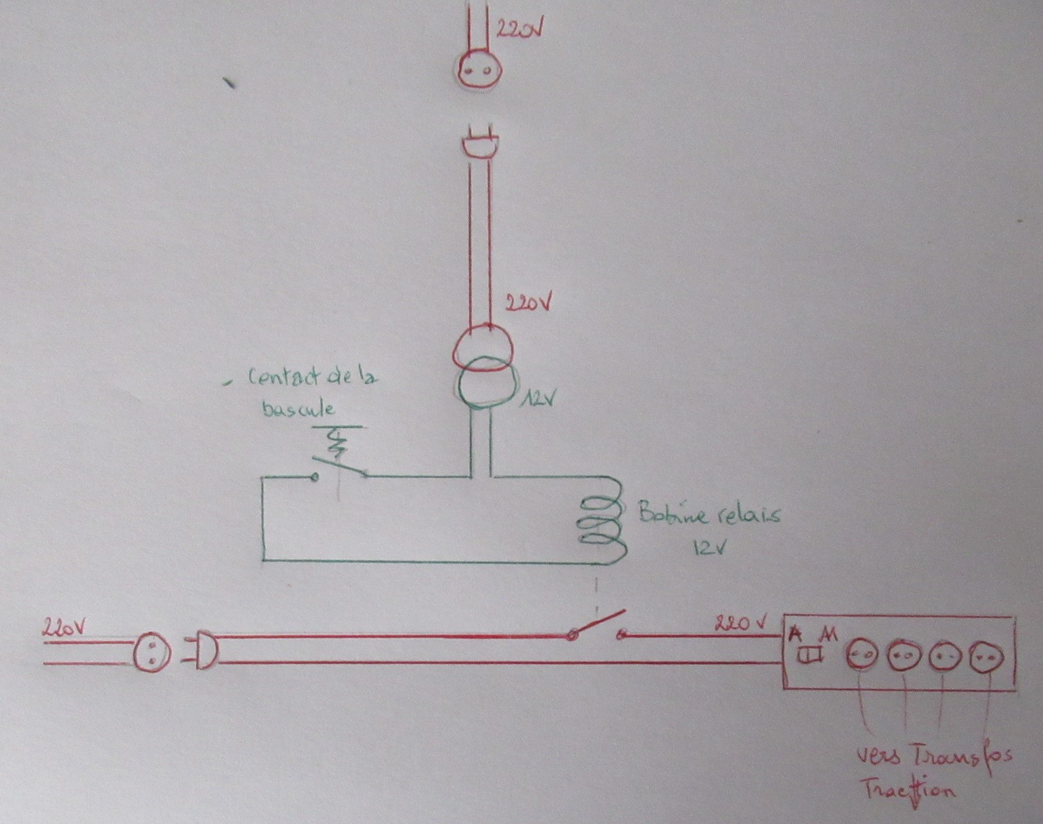 Après abaissement de la bascule , un micro contact permet l'alimentation d'un relais 12 volts par l’intermédiaire d'un transfo 220/12V .