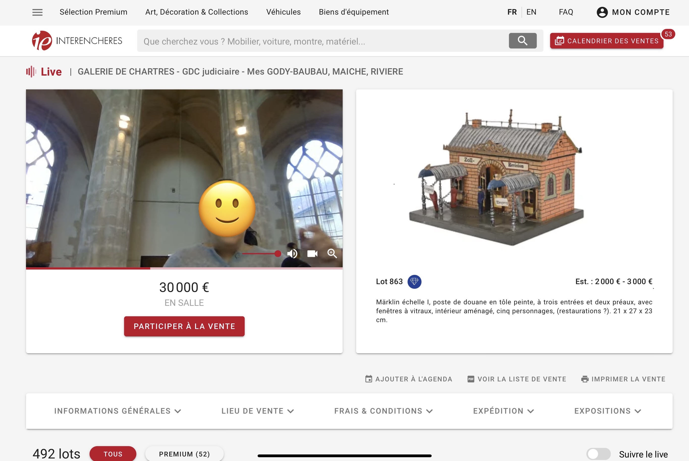 Et puis à certains moments, on se serait cru à « Affaire conclue » avec des joutes d’enchères délirantes (enfin, c’est mon point de vue d’inexpert) comme ce bâtiment Märklin en tôle à l’échelle 1 adjugé dix fois l’estimation… 30.000 €, capture d’écran pour preuve !!!