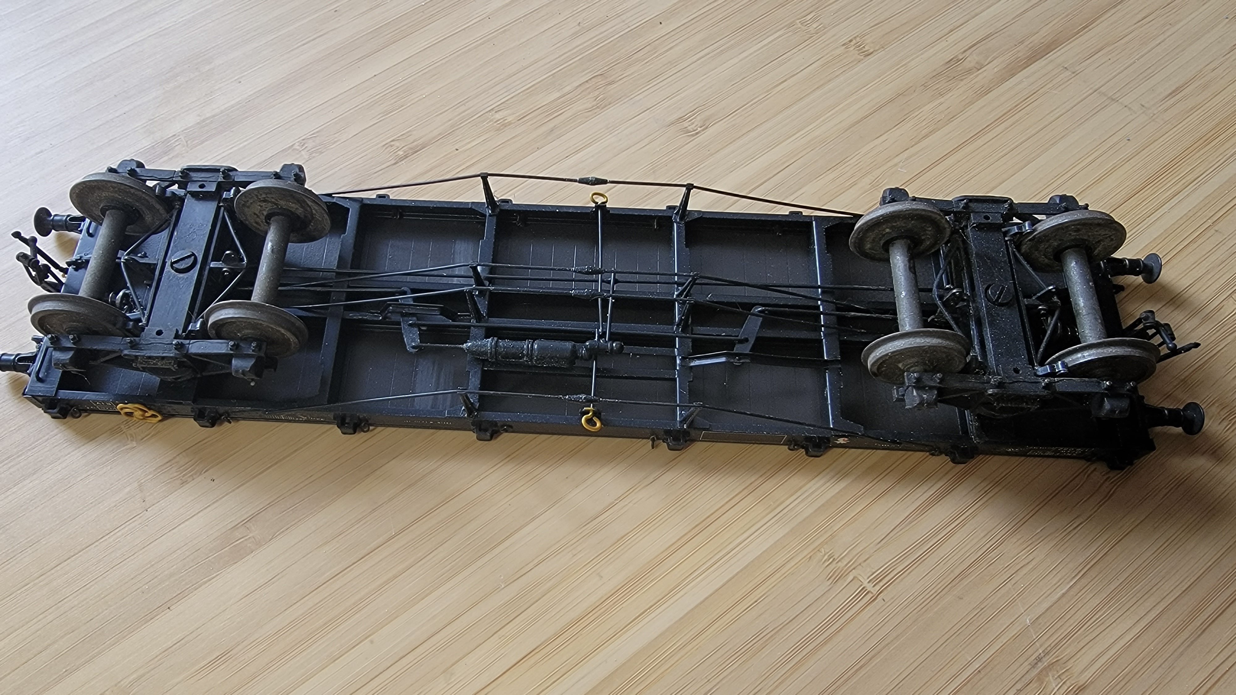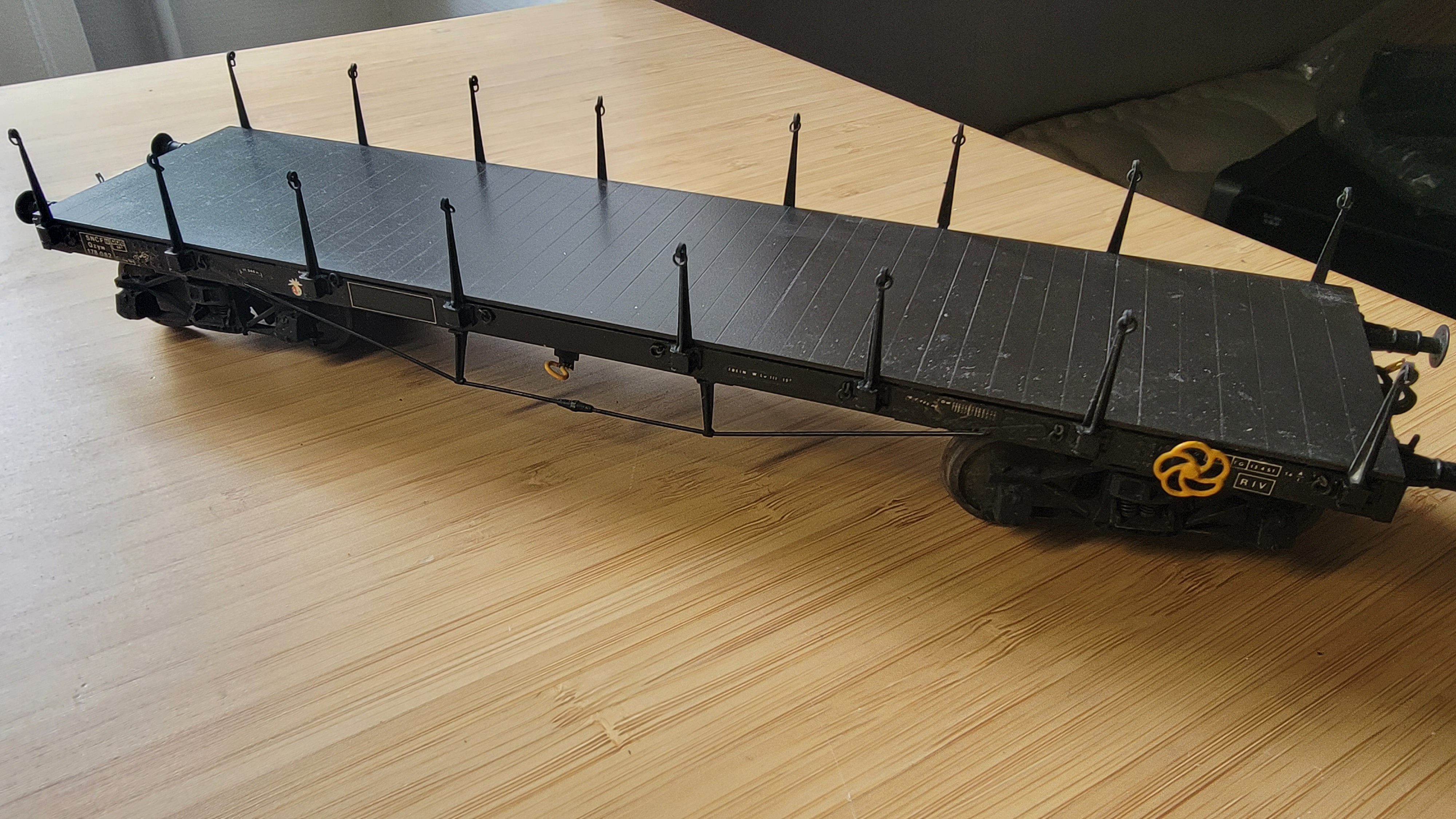 Je vends ce wagon plat TP à ranchers de chez GUILLERMET , tout laiton , bogies suspendus , tampons à ressorts , ranchers amovibles . Parfait état .