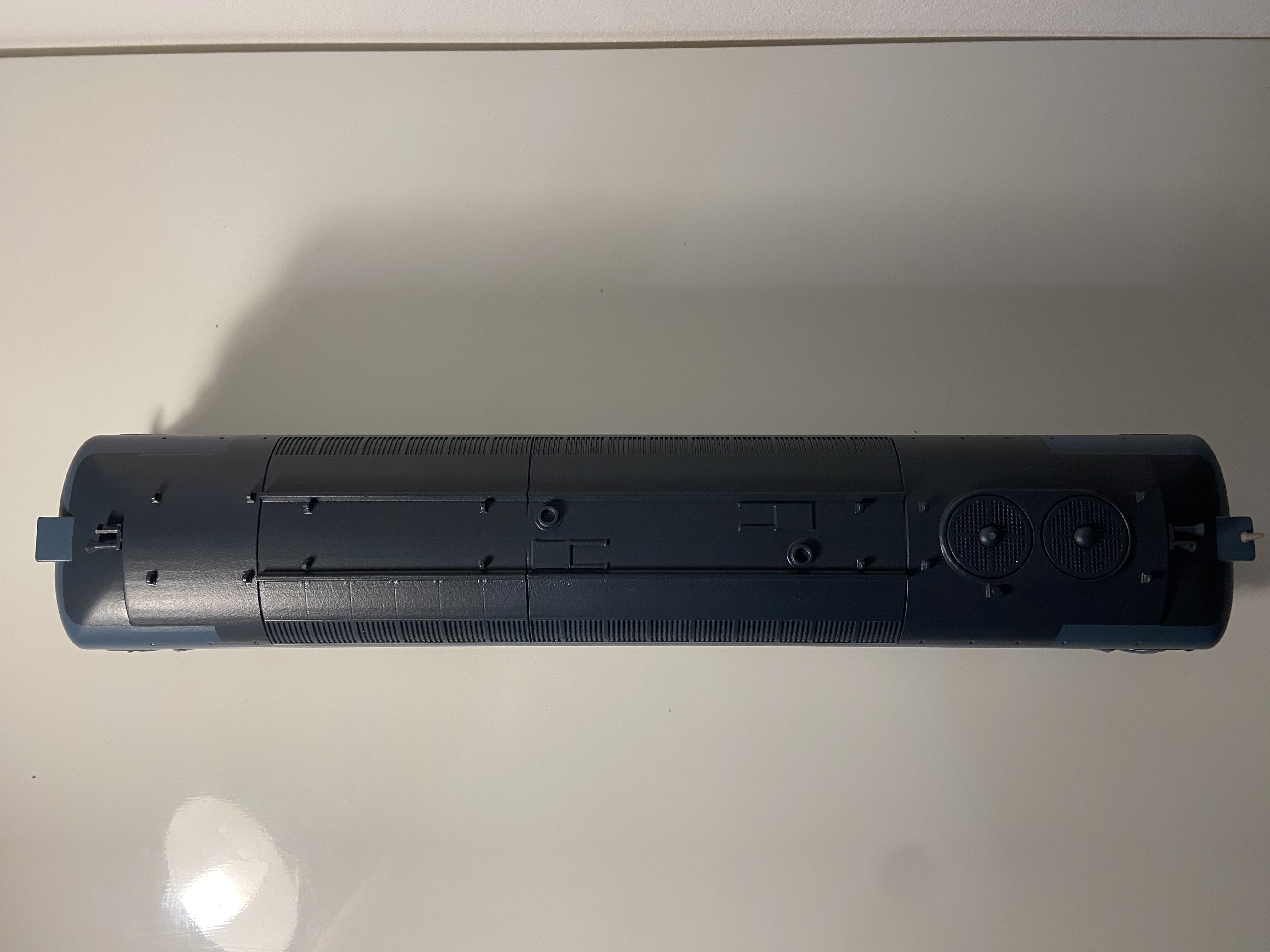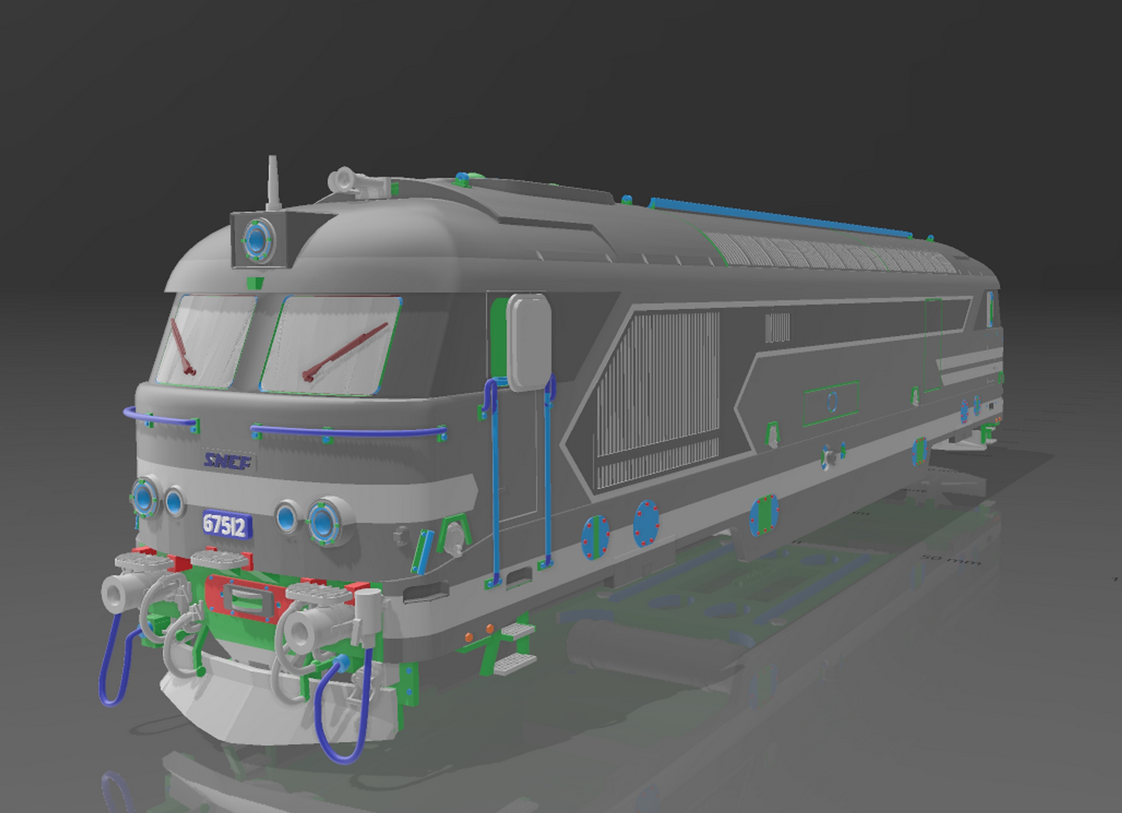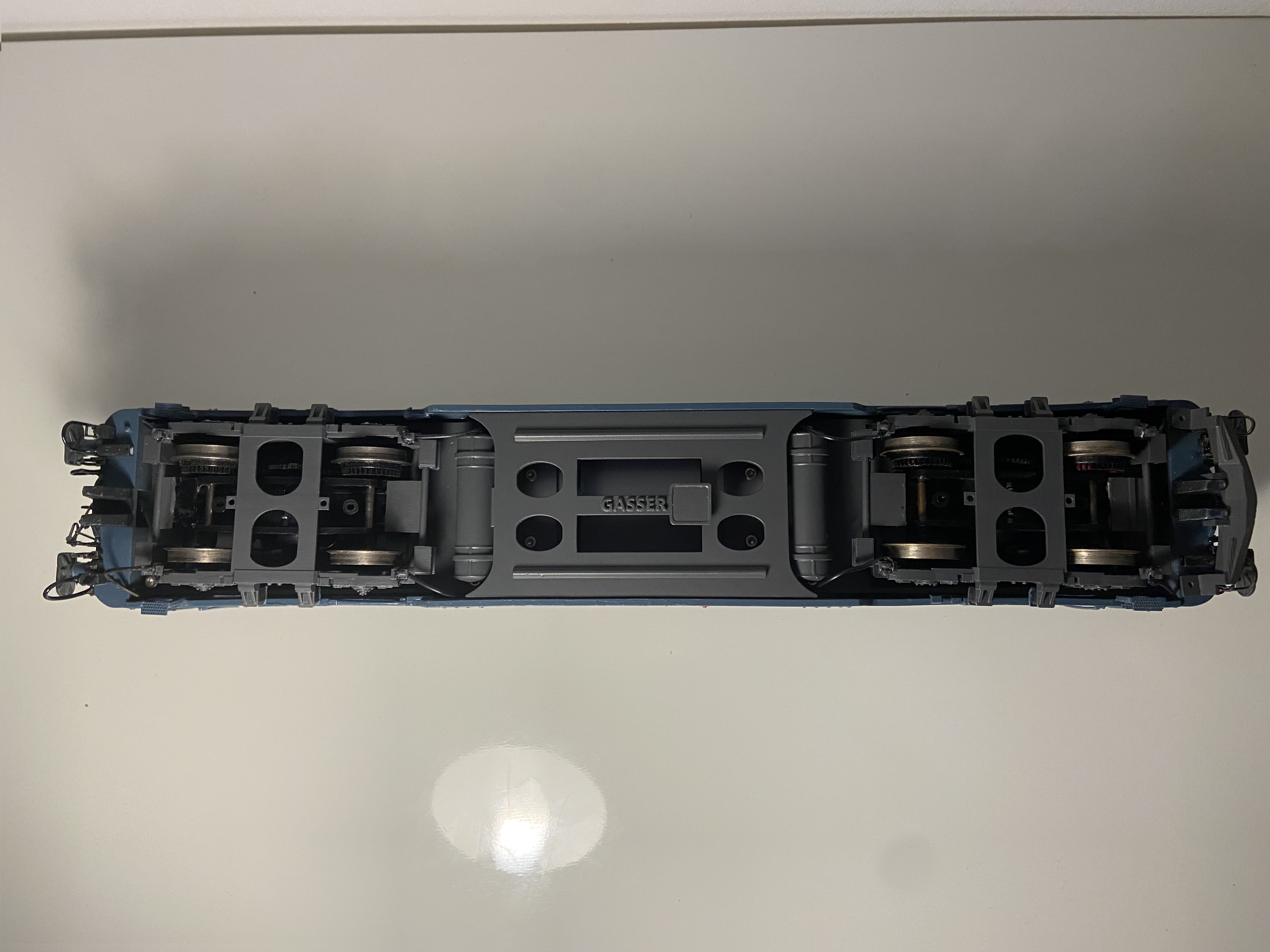 La machine est équipée de 2 bogies moteurs synchronisés, 8 vis maintiennent la caisse à son chassis et 4 vis maintiennent la structure avec les 2 RP et l'antenne KVB au chassis.