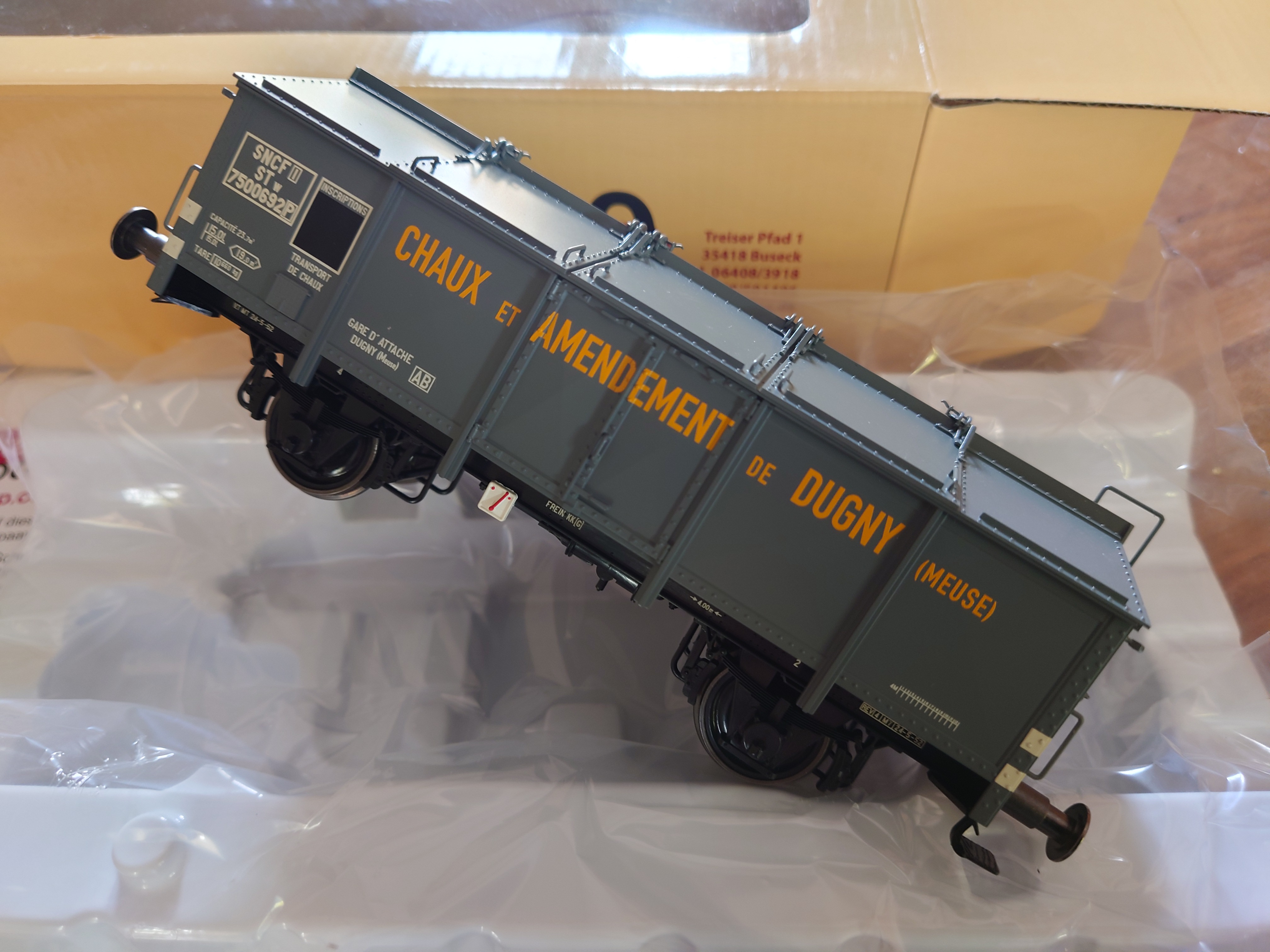 Vends un wagon tombereau neuf à capots (transport de chaux de Dugny) assez rare peu d'exemplaires produits.