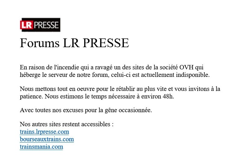 Il me semble avoir lu que l'hébergeur de LR Presse serait à Roubaix, donc non affecté par l'incendie (si toutefois mon info est bonne). Par contre, il y a surement des connexions entre tous ces sites, ce qui ne doit pas faciliter leur indépendance...