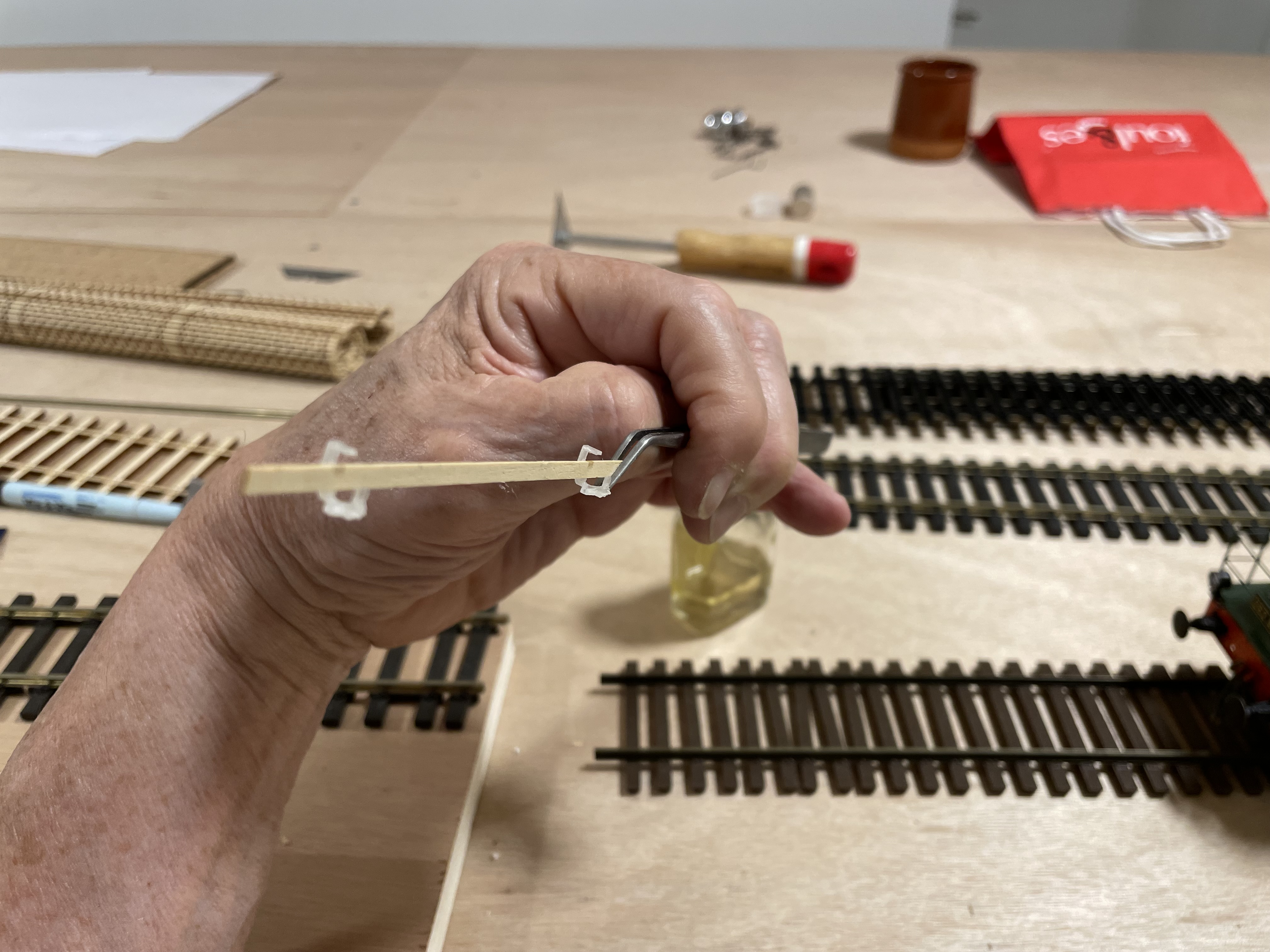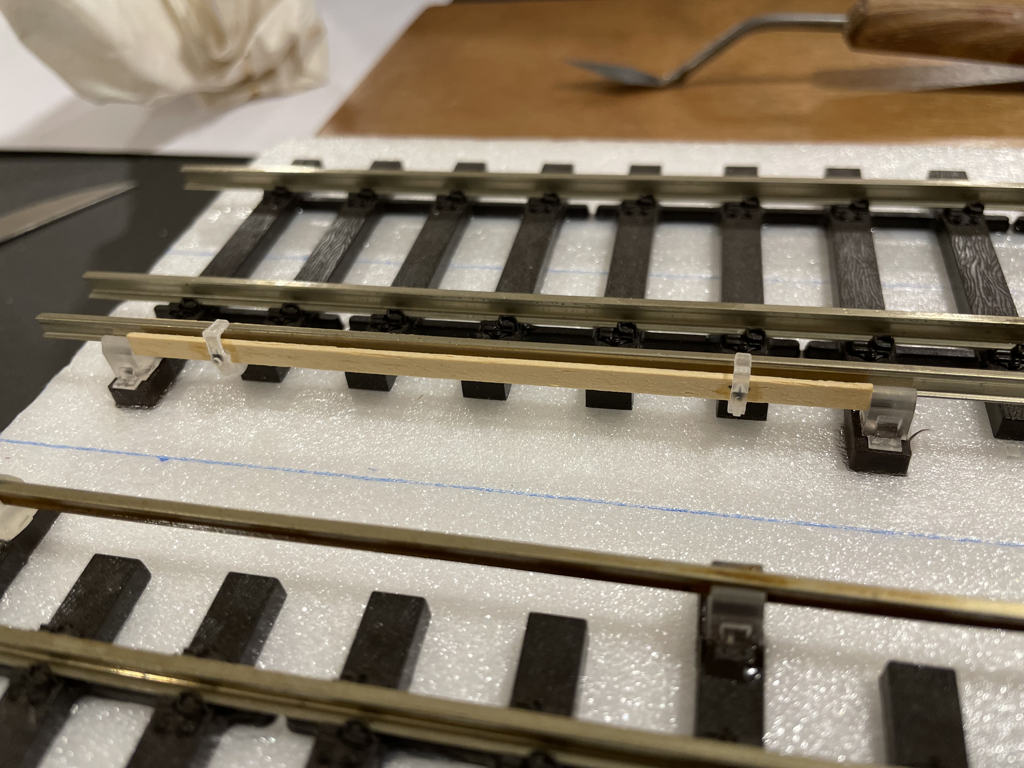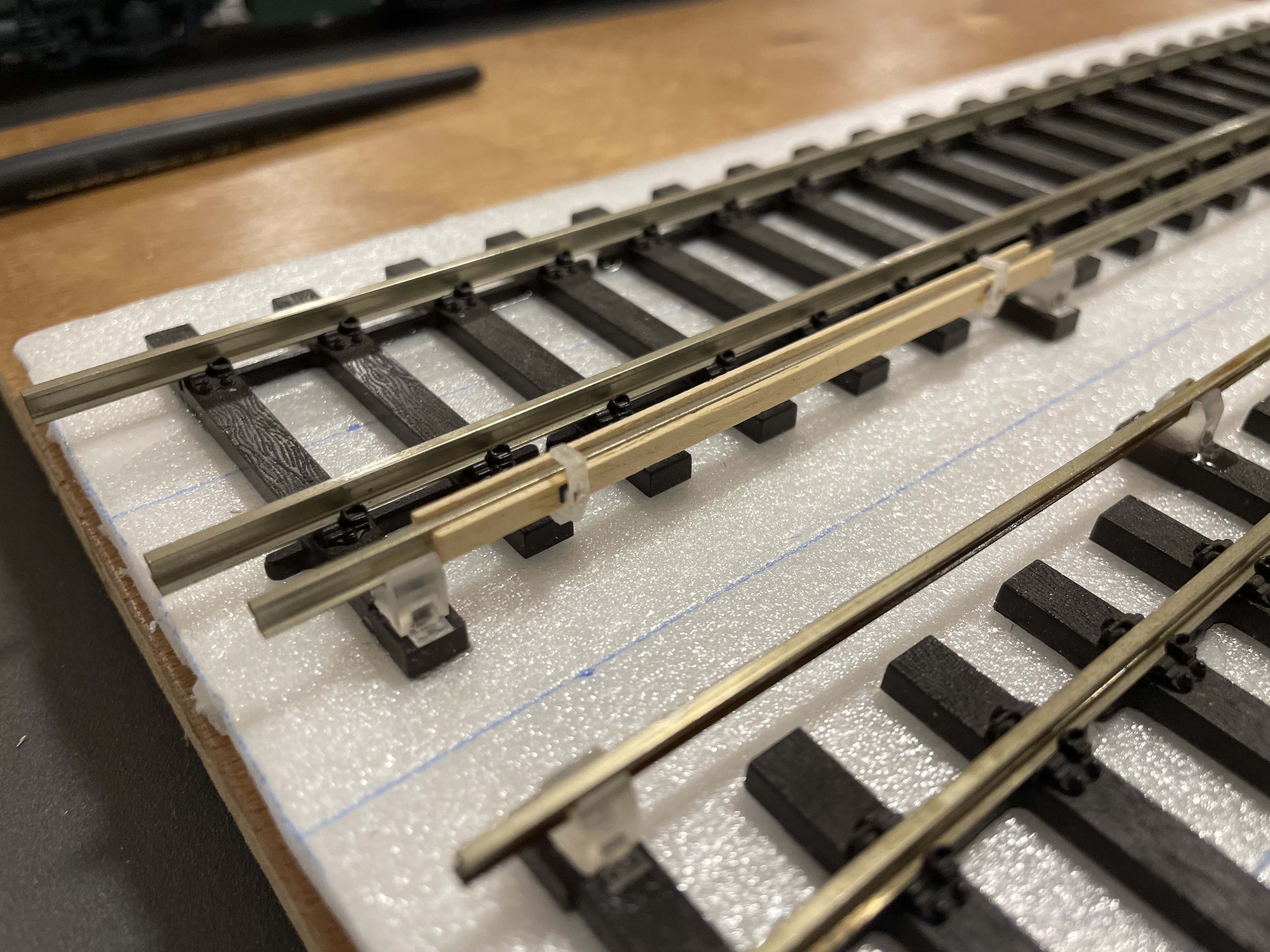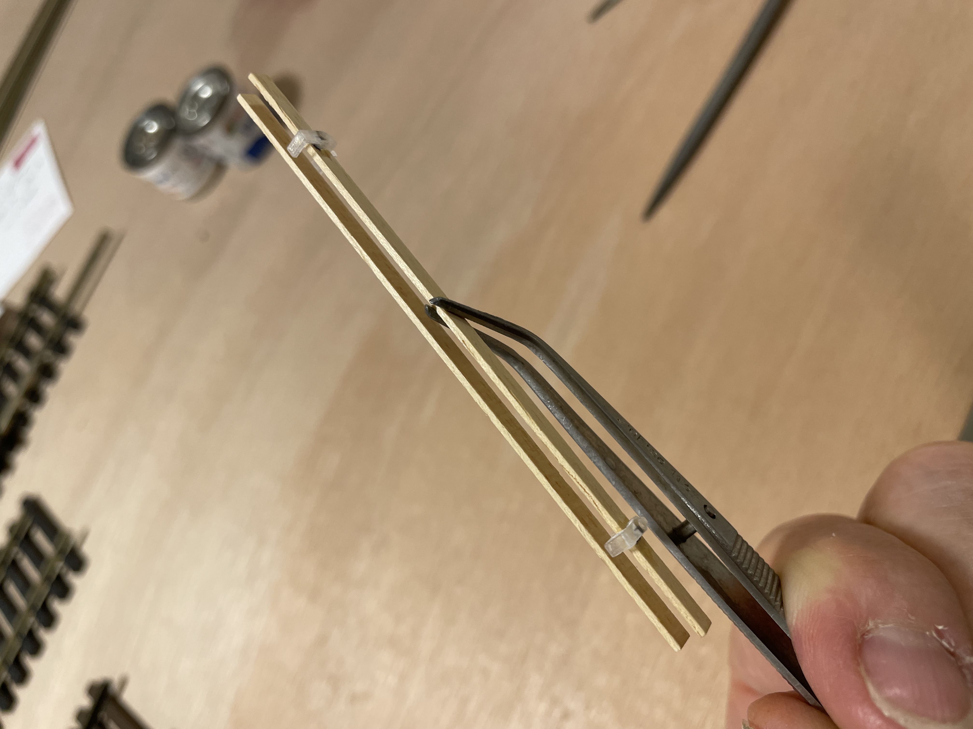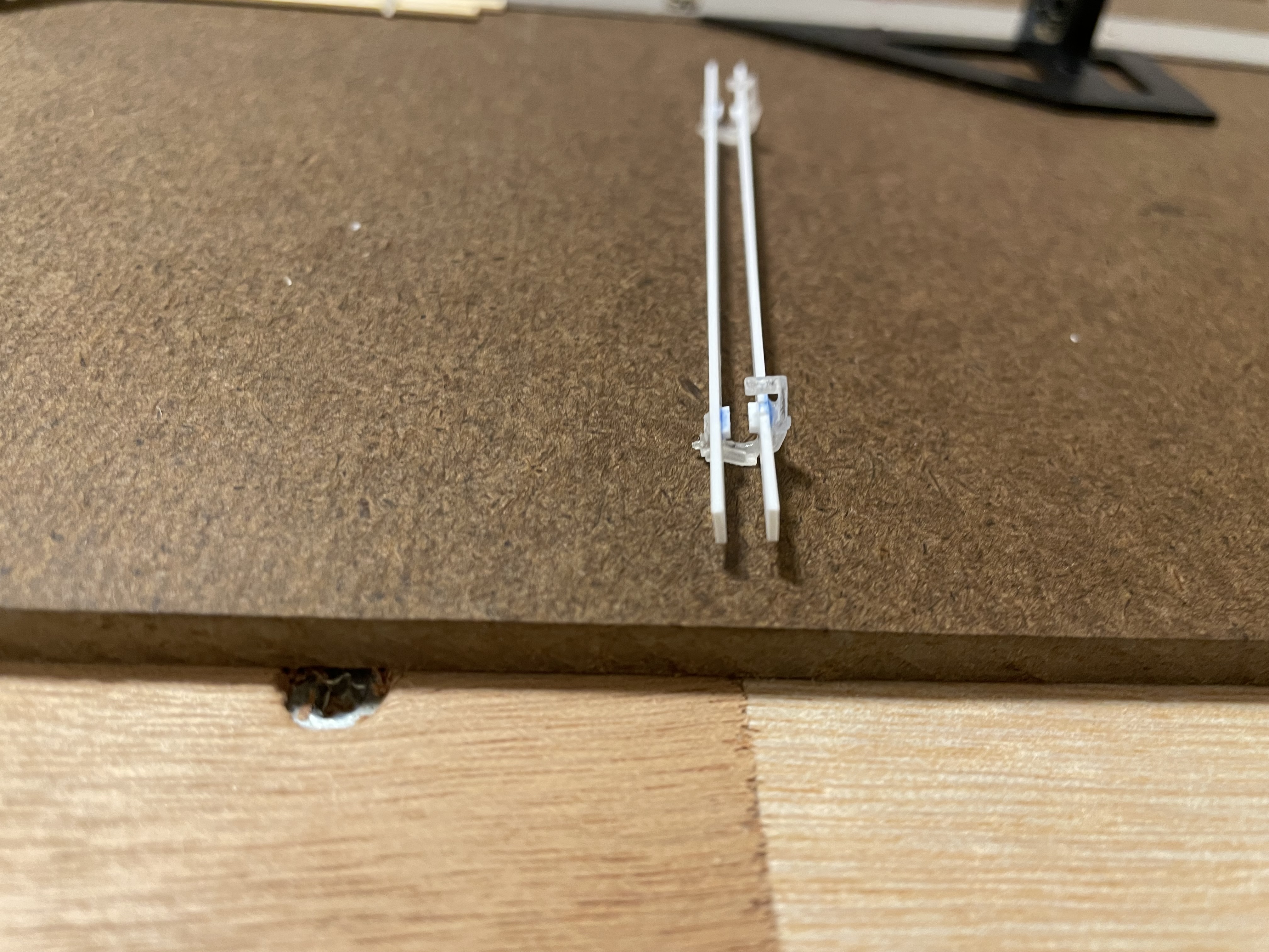 Les problèmes sont les mêmes au niveau du montage, les étriers sont minuscules et, de par leur forme, difficiles à caler pour le collage. À l'intérieur des planches des cales sont collées pour venir pincer l'âme du rail. Sur mon proto elles sont un peu trop minces (0,75 mm), je vais en faire un second avec cales de 1 mm et cela devrait suffire à pincer le rail.