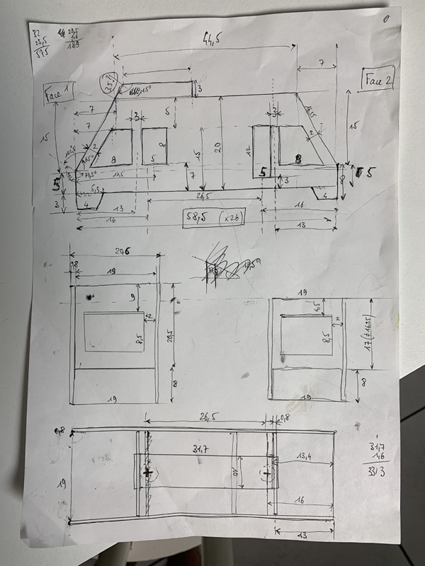 A l'inverse de toute logique, quand la maquette cartonnée a été terminée, j'ai dessiné des plans succincts pour faire correctement mes découpes de bois.