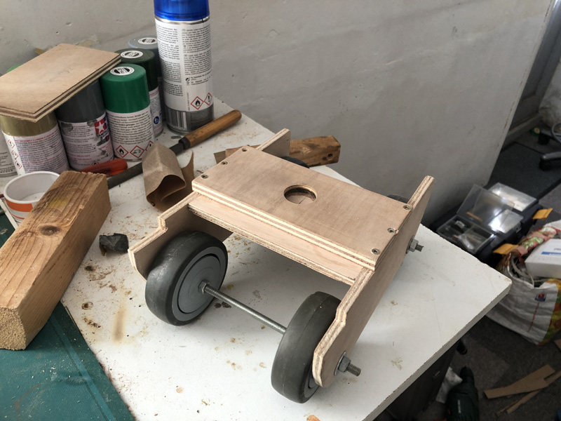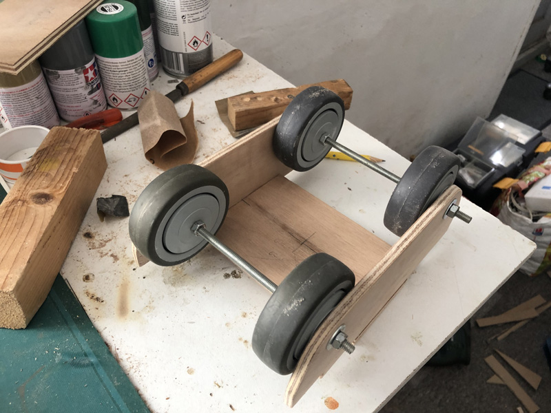 Les roues ont été achetées en GSB et démontées pour ne récupérer que les flasques, le moyeu et la roue s.s. Les bogies sont très simplistes en "berceau" et l'axe est un rond de bois (diam 24 mm) également collé et vissé (2 vis pour garantir l'absence de rotation).