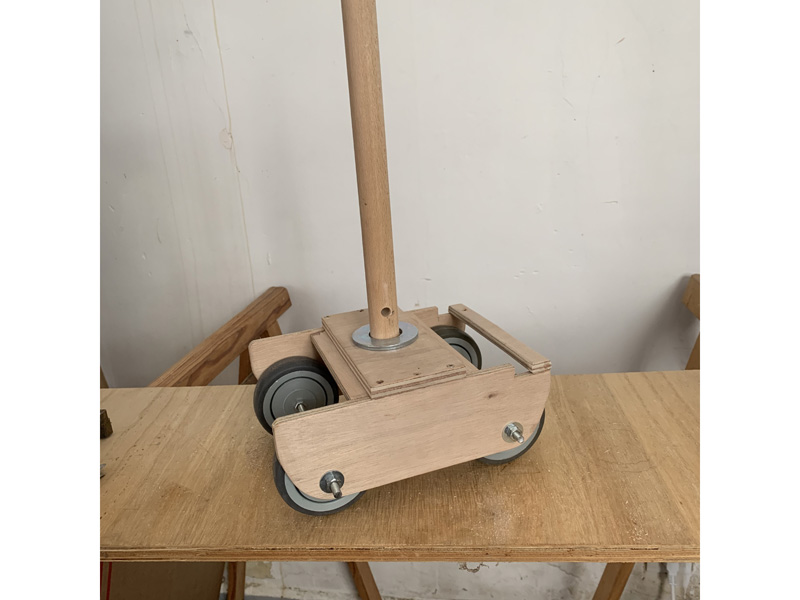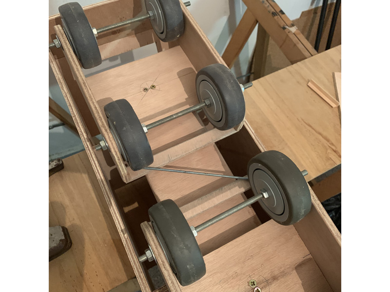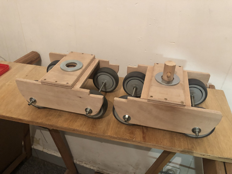 Vous verrez également plus tard que pour améliorer la rotation des bogies (par rapport aux photos ci-dessus), j'ai diminué le couple de résistance du frottement des roues sur le sol en les rapprochant sur leur axe en intercalant une petit tube de bois de 1,5 cm de part et d'autre.