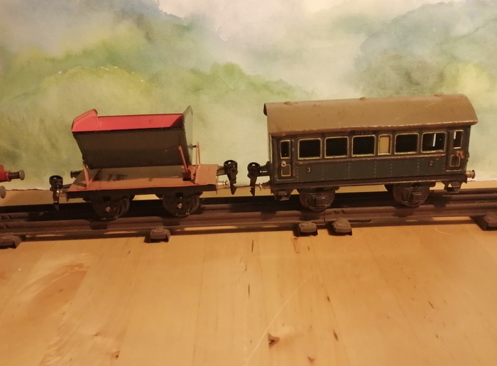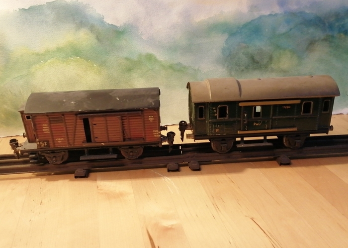 Trouvé 2 wagons Marklin négociés à pas cher ! La benne est impeccable, la voiture est un peu rouillée et il manque une poignée de porte !