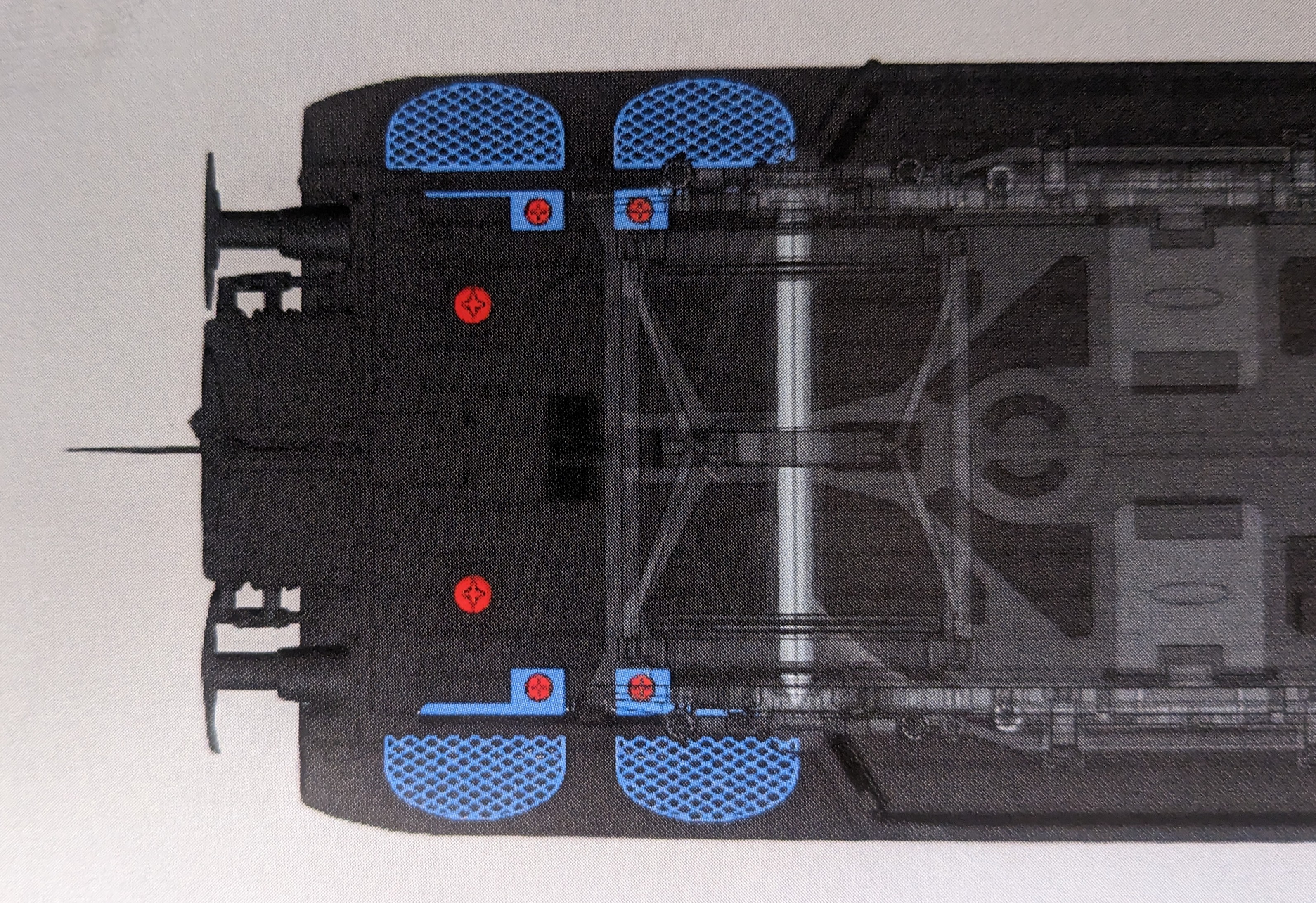 Outre les 6 grosses vis sous le châssis, il reste à dévisser les 8 petites vis qui maintiennent les marchepieds supérieurs.
