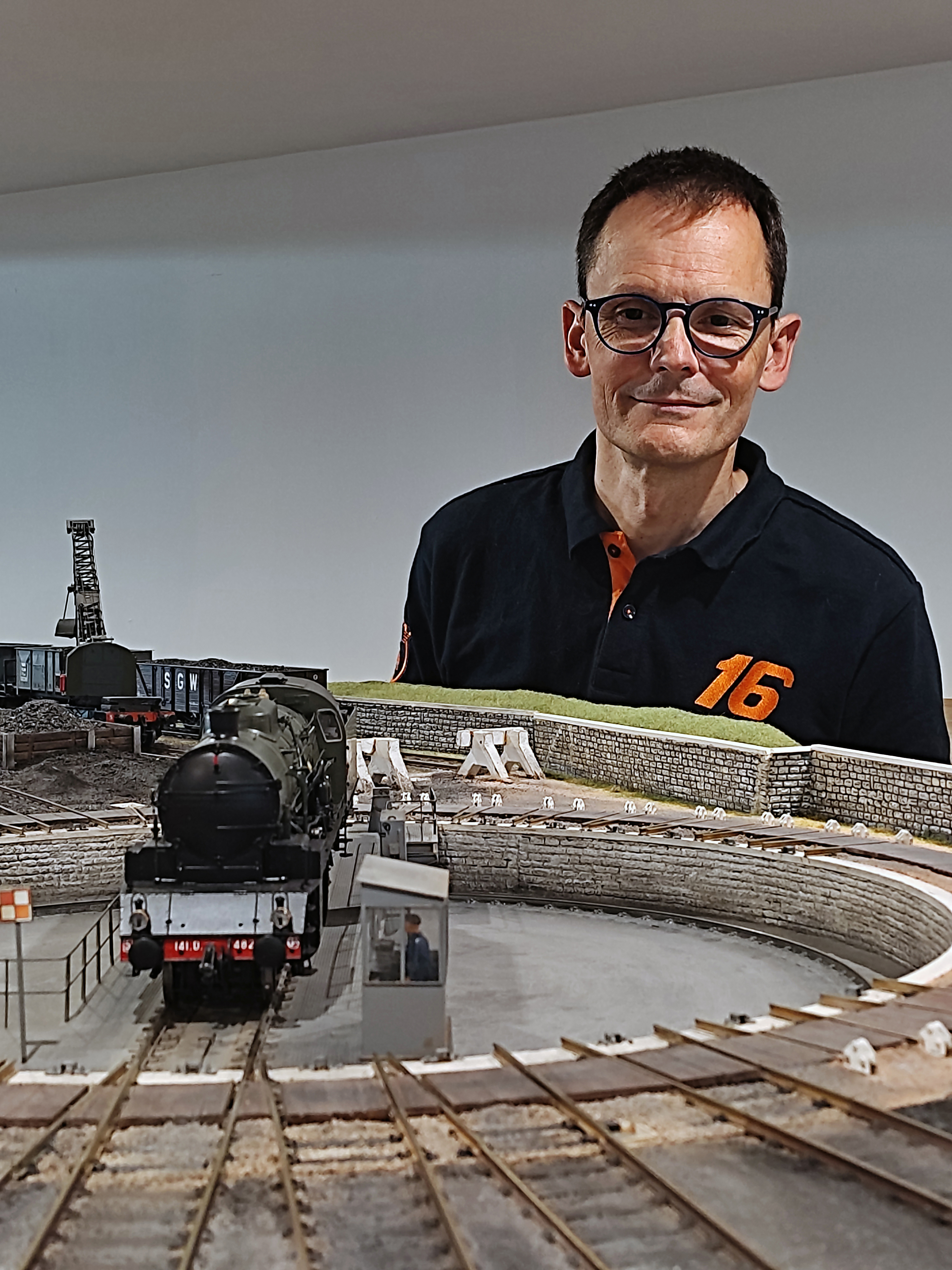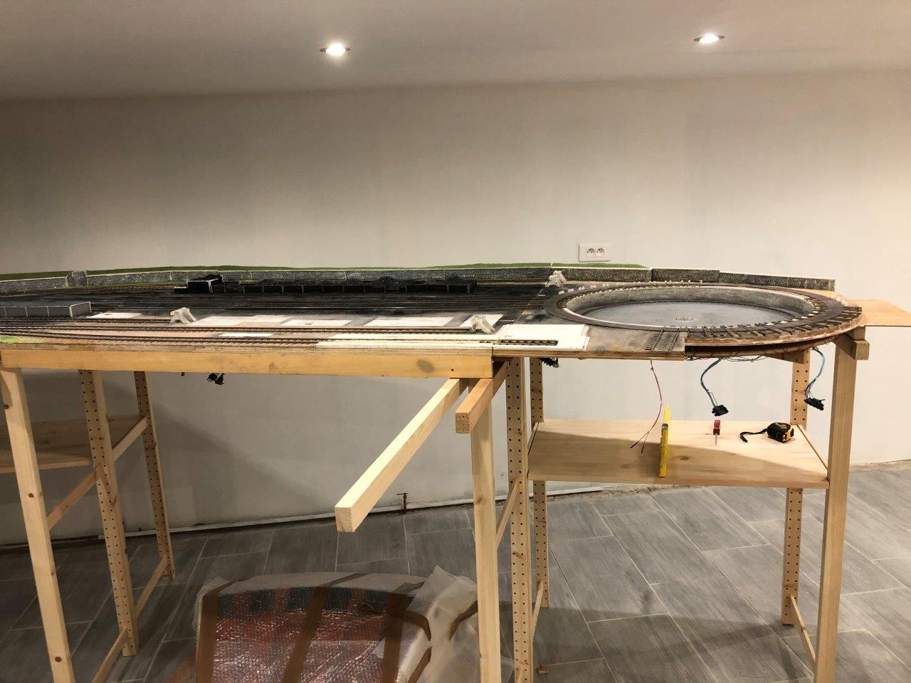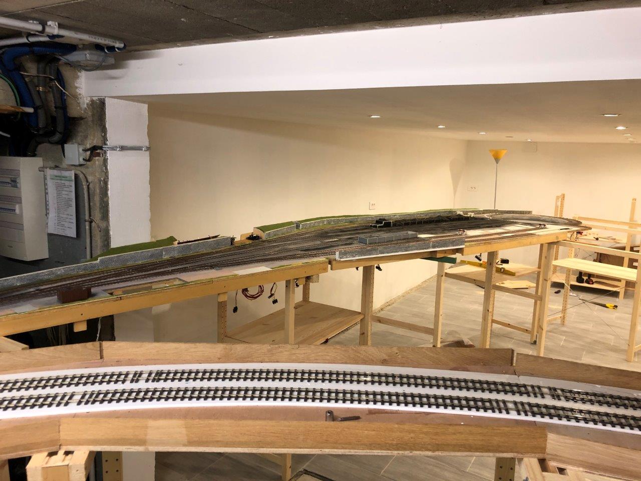 Les modules se remontent comme du Lego, Raymond a pris soin de réaliser toutes les connexions électrique avec des prises aux interfaces de chaque module. Le module d’entrée du dépôt est positionné sur un côté de la pièce et moyennant une aiguille va pouvoir être connecté au réseau. Les trois premiers modules sont en place en quelques heures.