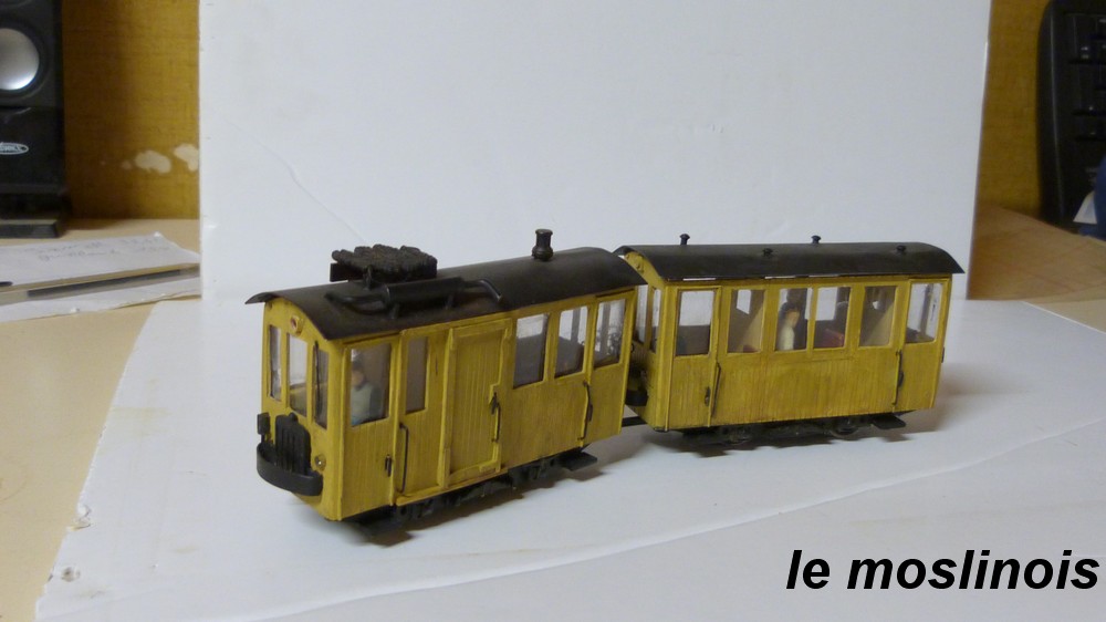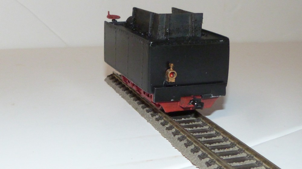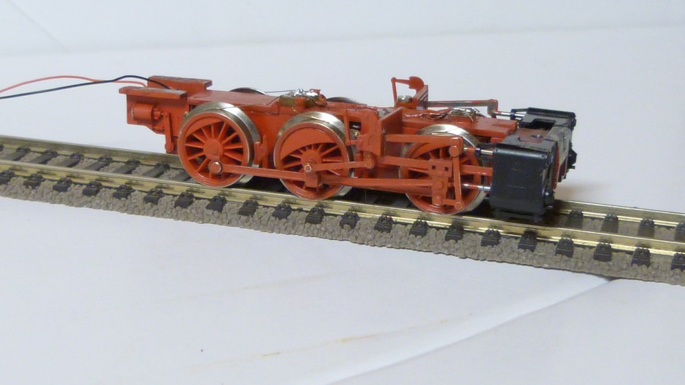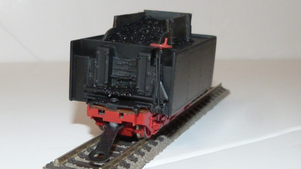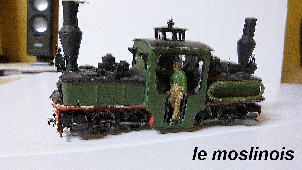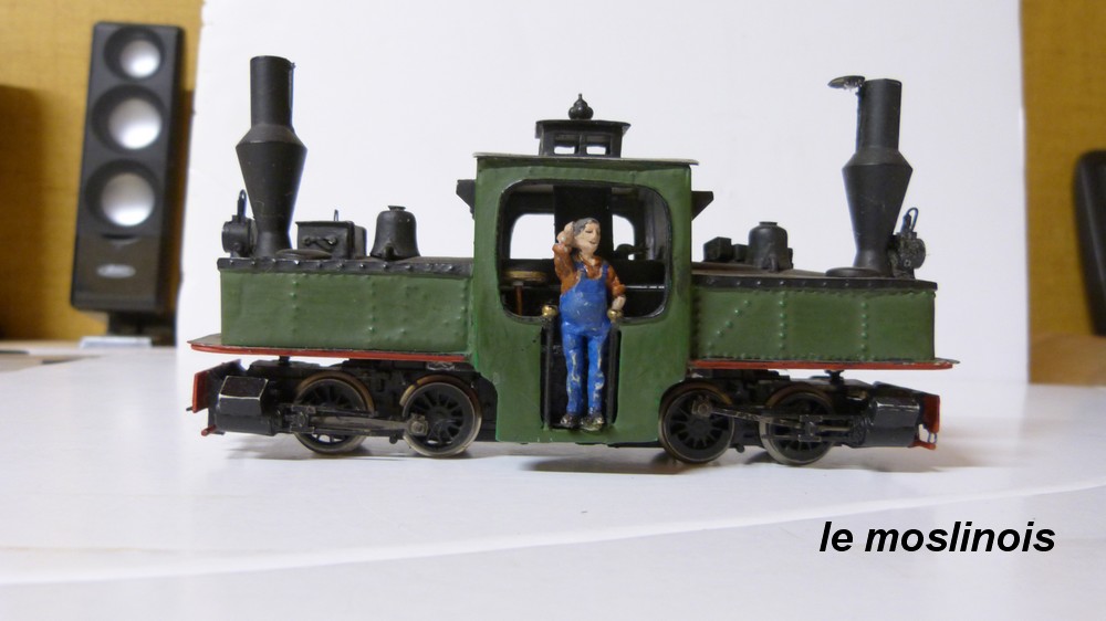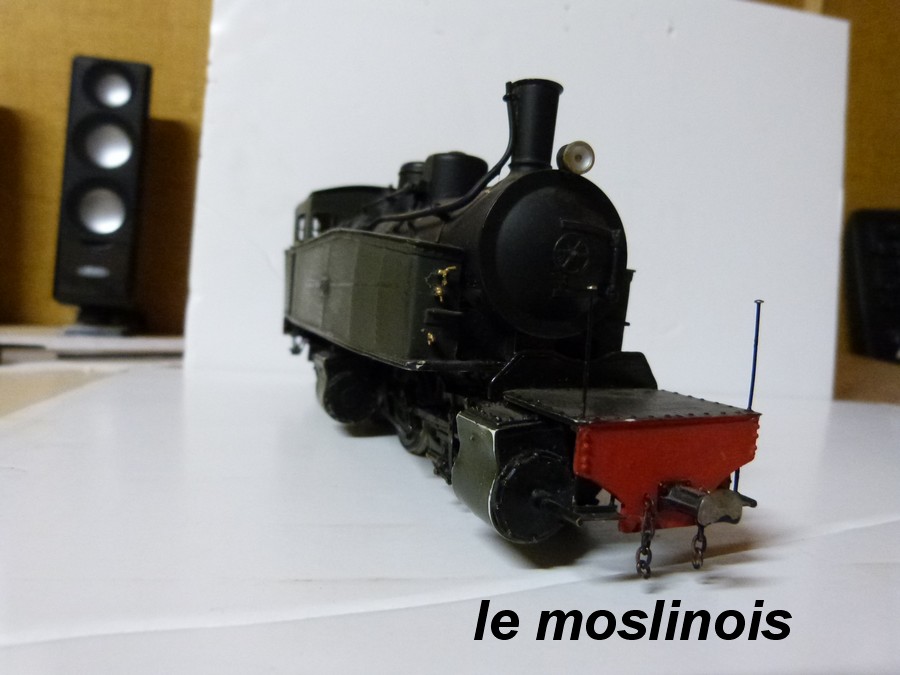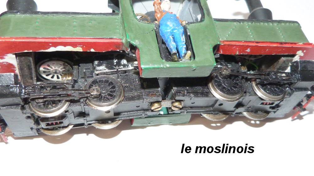 Ptit avancée ,j'ai mis des fils palpeurs sur les roues de la motrice,peinture des bielles en rouge ,sur le tender ,des rehausses ,du charbon ,un petit feu rouge,et une robe noir satin