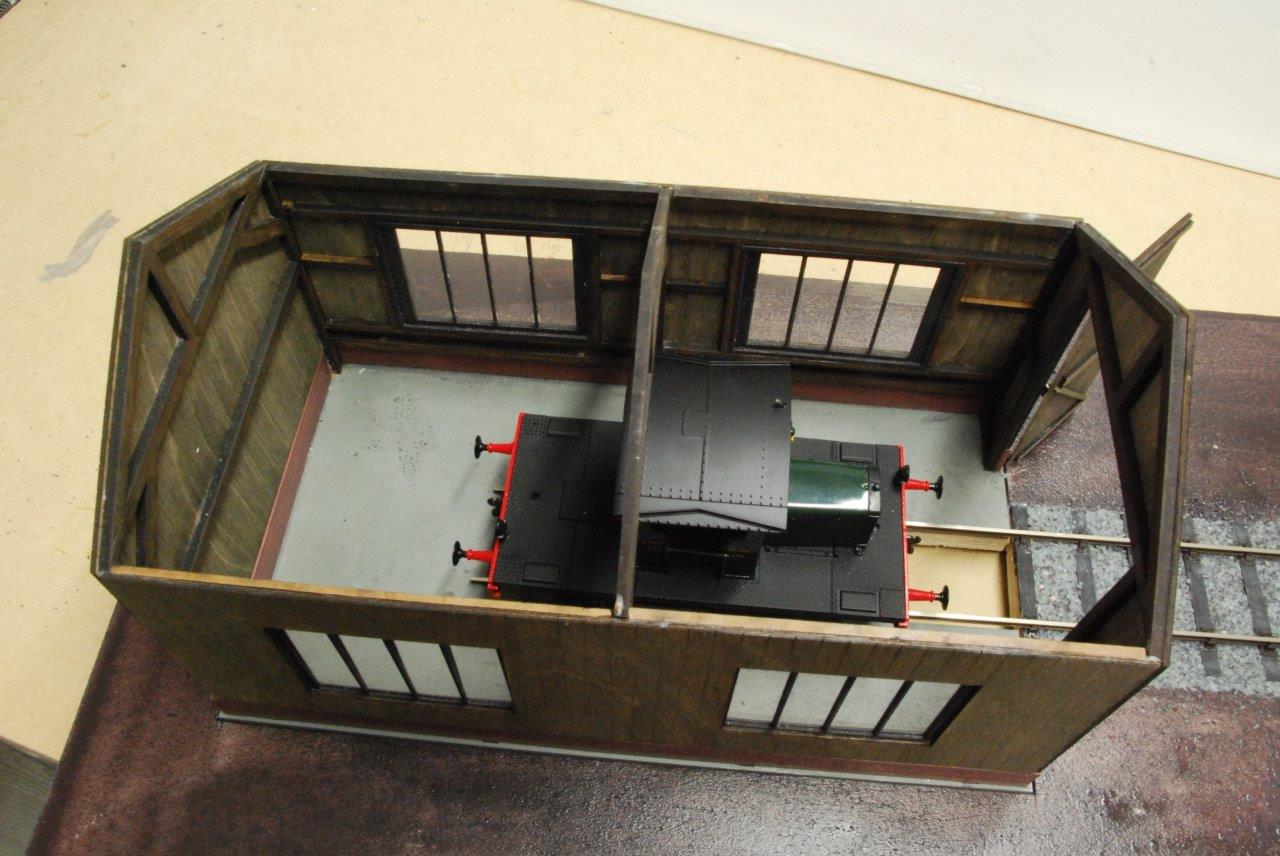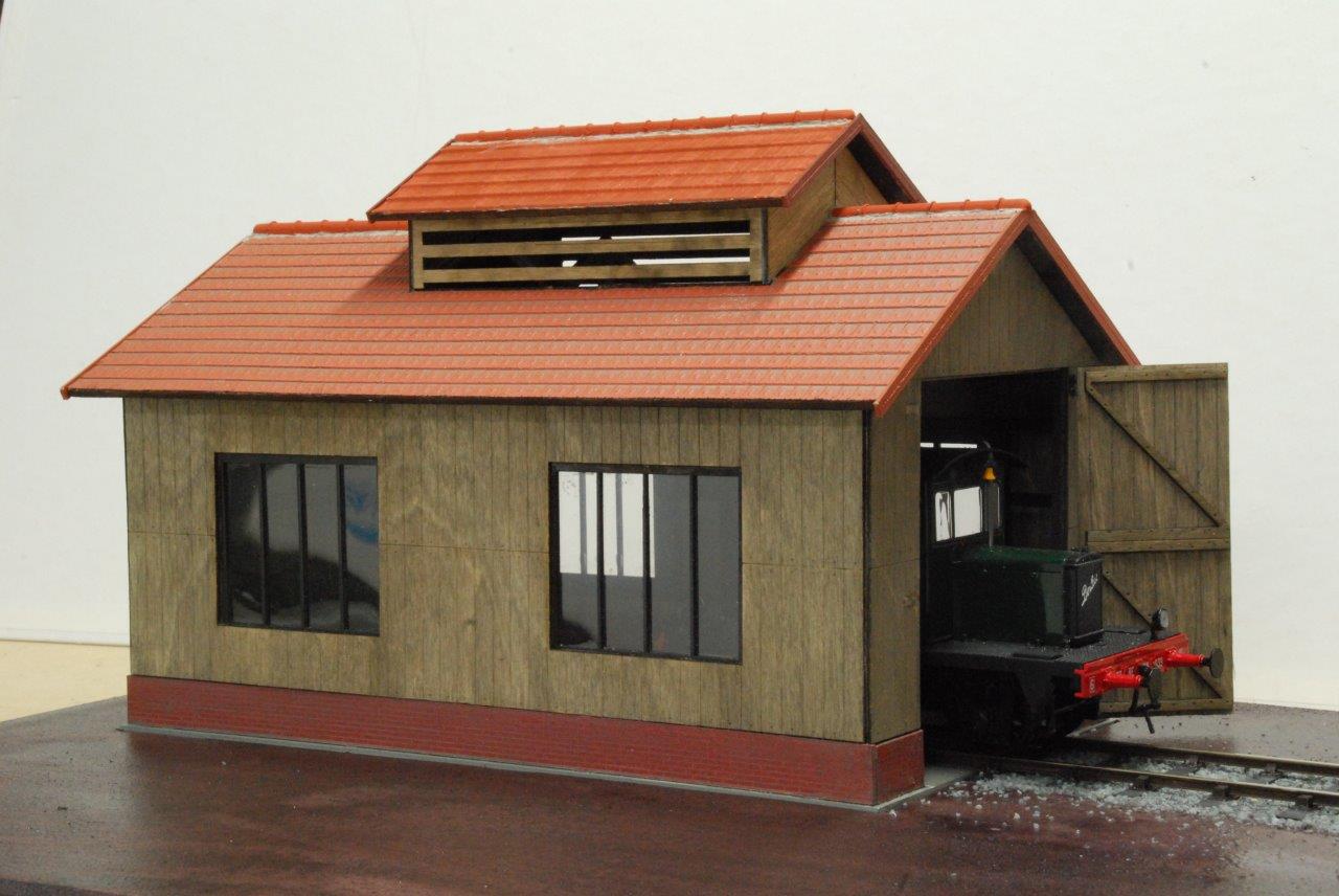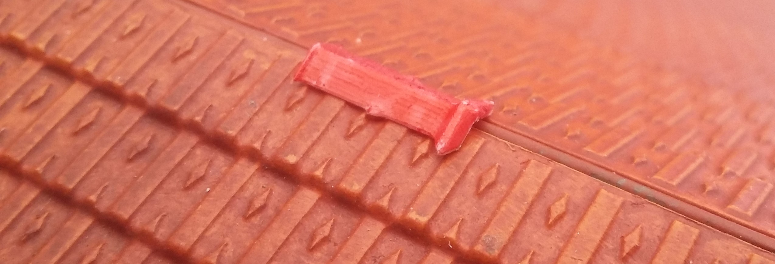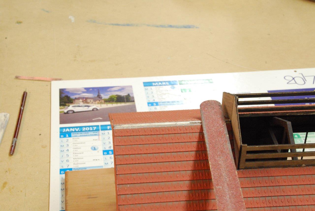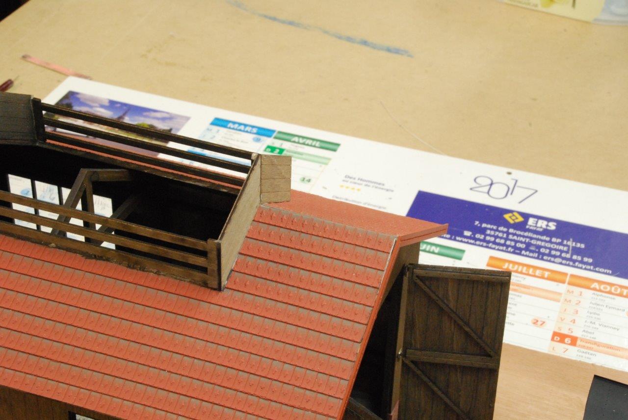 Les tuiles faîtières sont faites à partir de grappe de moulage épaisse, les jonctions sont des morceaux d’âme de conducteur de fil téléphonique coupé et collé à la colle cyanoacrylate. Une petite vue d'ensemble de l'édifice sur son diorama. J'ai ballasté, c'est plus deux fois facile qu'en H0