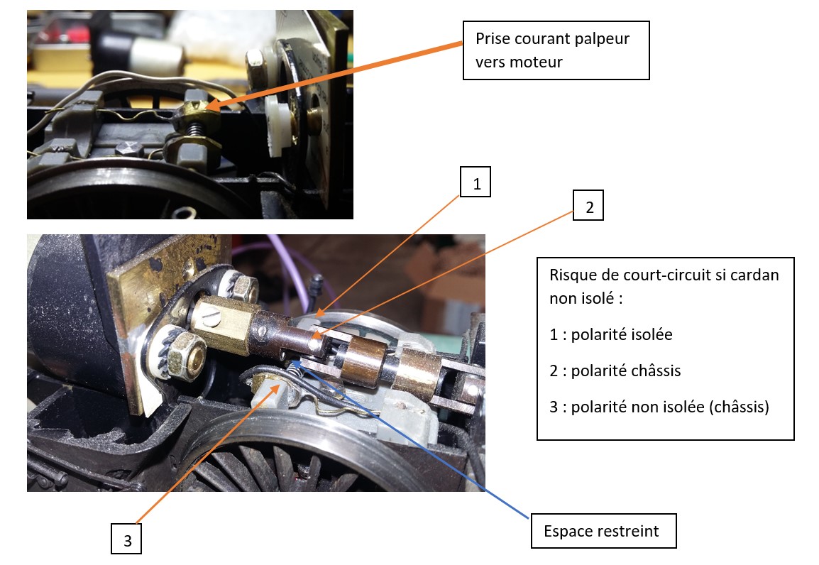 Que peut il se passer avec le moteur alimenté en continu ( le collecteur qui correspond à l'axe du axe cardan ) et la voie en pseudo alternatif : une 1/2 alternance sur le collecteur et sur le châssis moteur) et comment éviter des parasites éventuels sur les ordres DCC du fait du mélange du continu et de l'alternatif( A priori la vitesse et la redondance des trames DCC doivent s'en affranchir) par l'emploi de condensateurs ( ils sont déconseillés en digital : risque mortel pour le décodeur ).