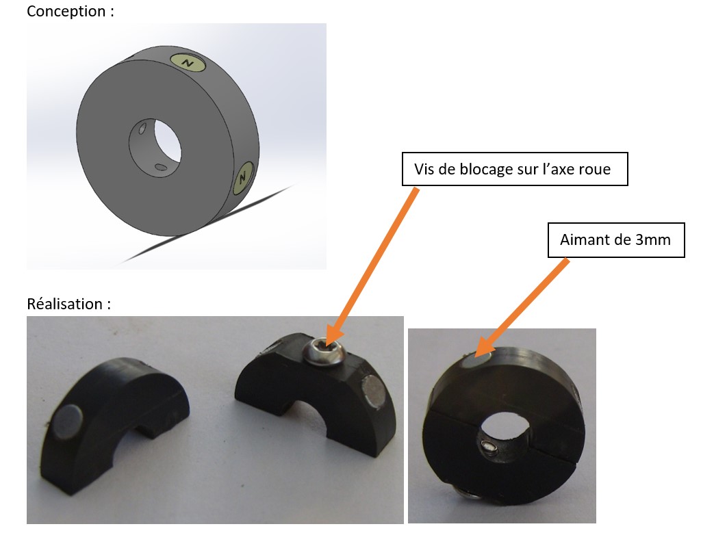 La contrainte majeure est le non démontage des essieux. Donc il faut envisager la réalisation d’un support en deux parties. Deux supports seront tournés et surfacés à la fraiseuse afin de réaliser les deux demi-supports qui seront percés au diamètre 3mm et assemblés par collage entre eux en position sur l’axe de la roue en faisant attention de conserver une rotation temporaire autour de l’axe de roue afin de peaufiner les réglages du décodeur. Un demi-support aura au préalable été percé et taraudé pour implanter la vis de réglage et de serrage.