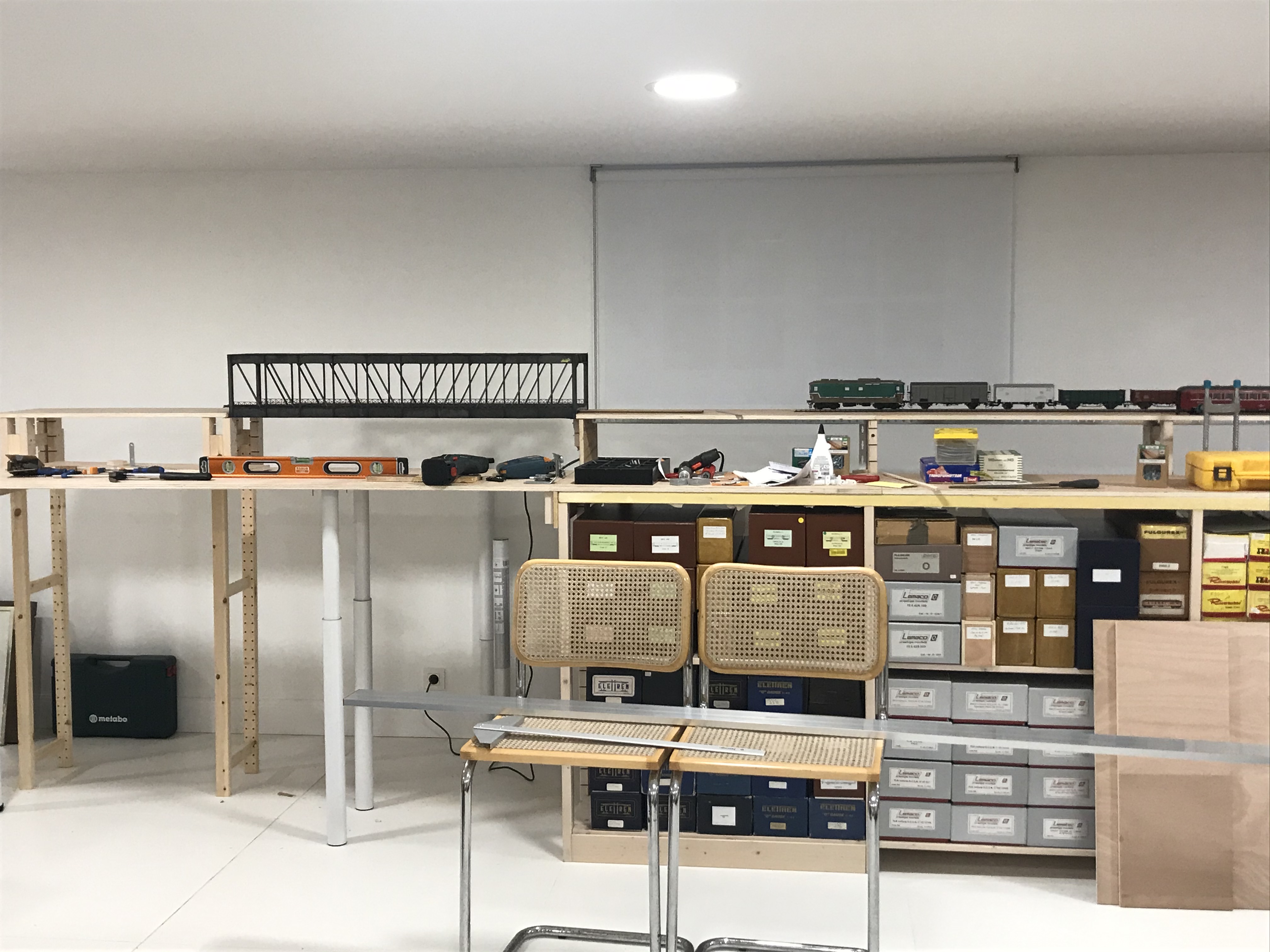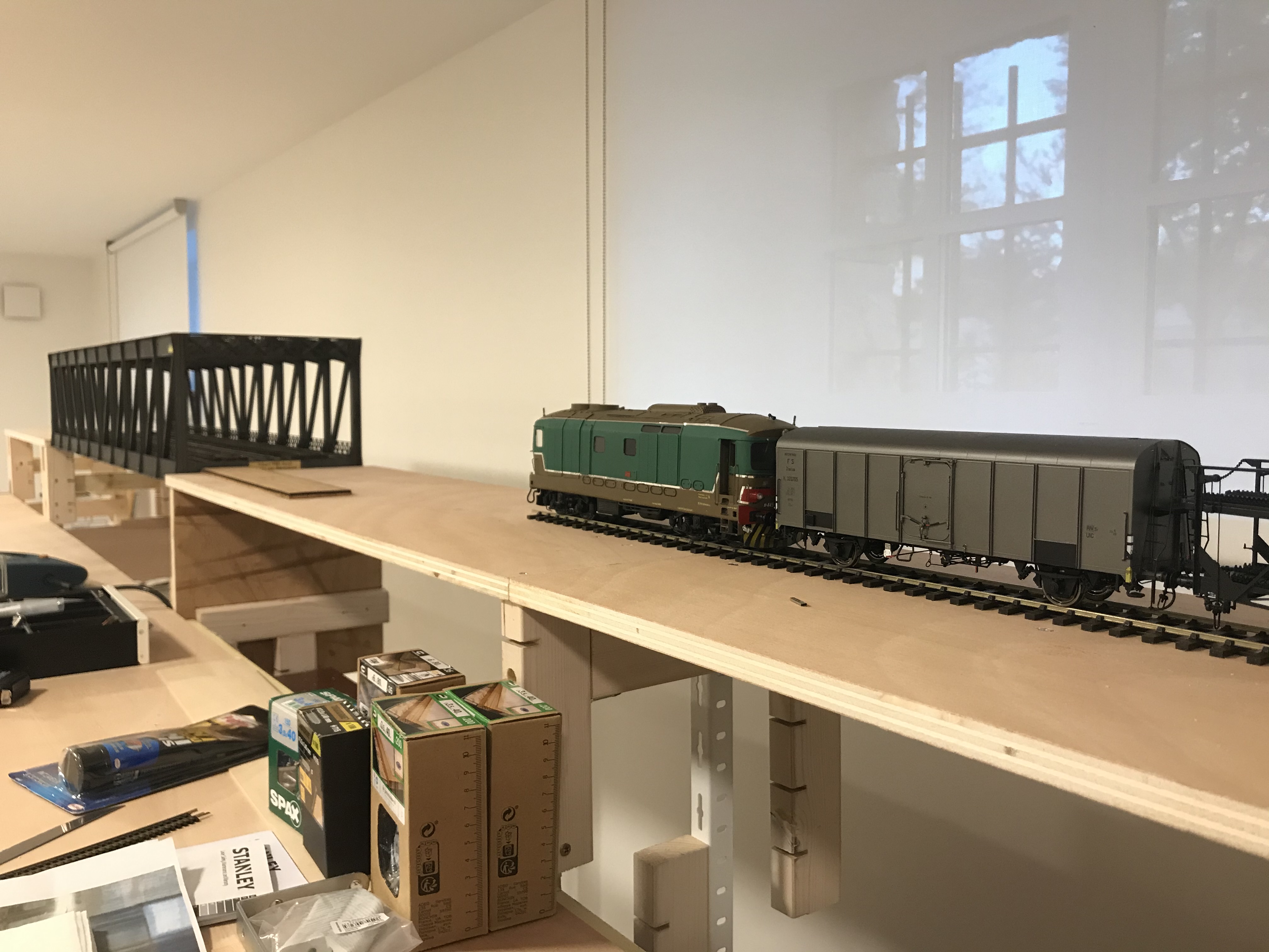 Je vais attaquer en suivant la plateforme de la gare (côté Nord de la salle) où les deux lignes se rejoindront. Je pense terminer par les courbes de raccordement entre les deux tronçons rectilignes.