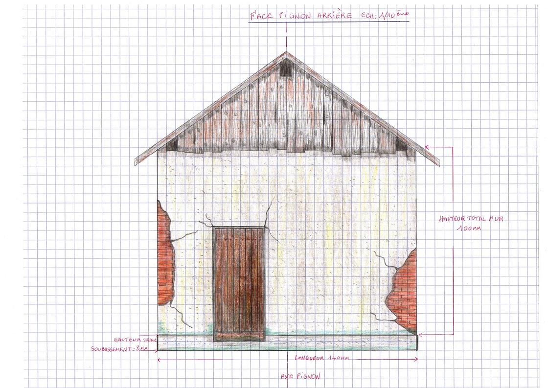 Le pignon principal sur la porte je n'ai pas fait figurer les charnières, elles seront bien sur reproduites en laiton bruni & peint.