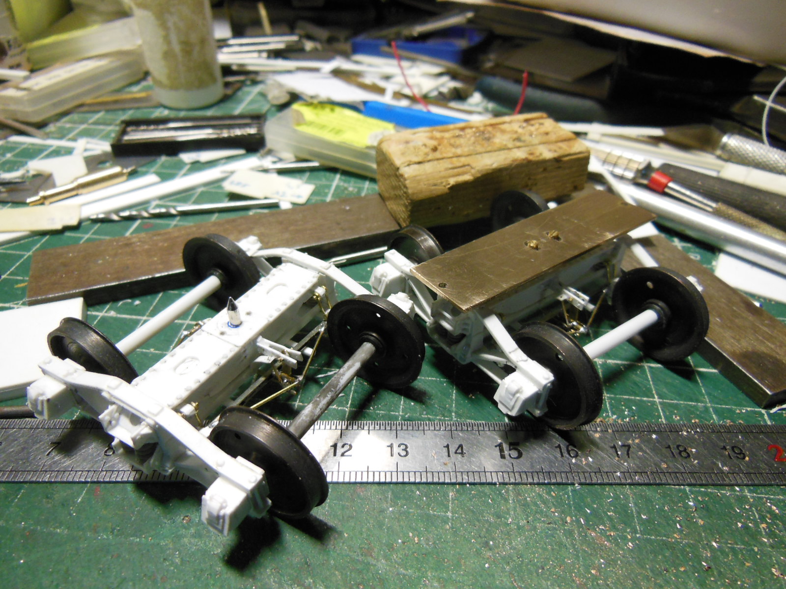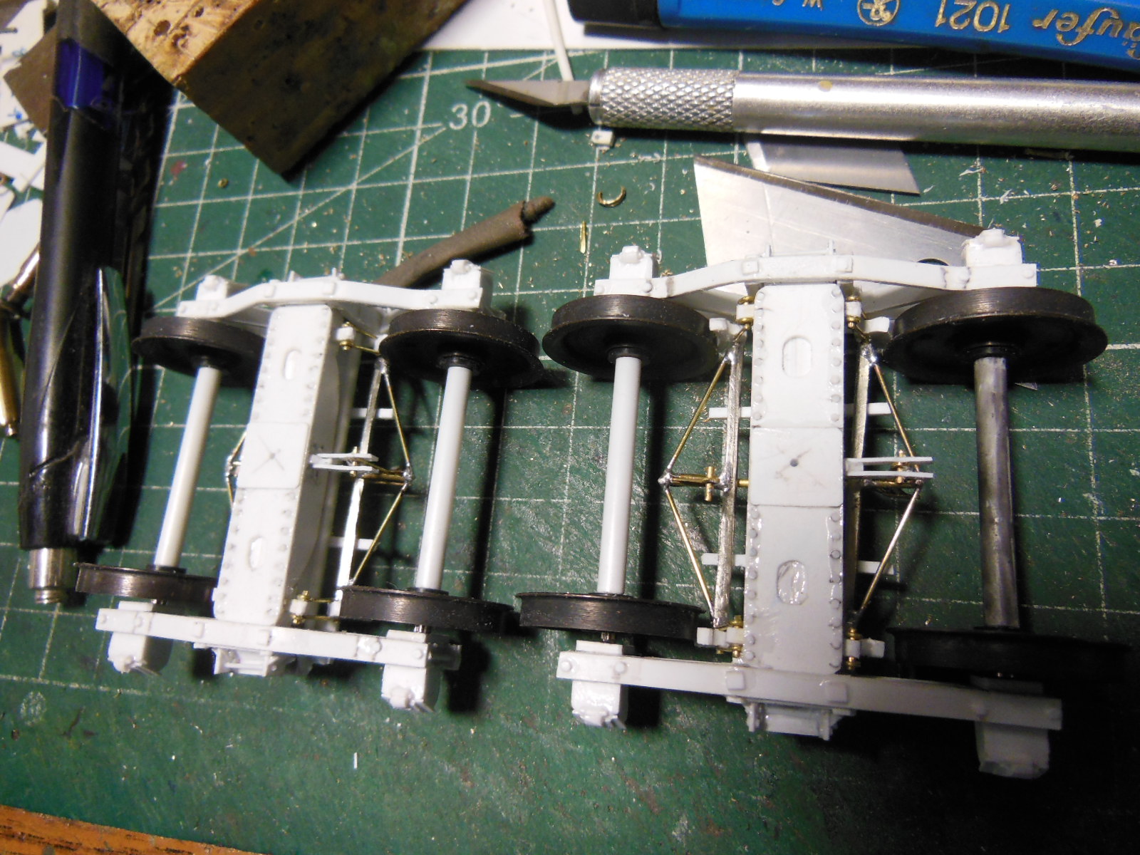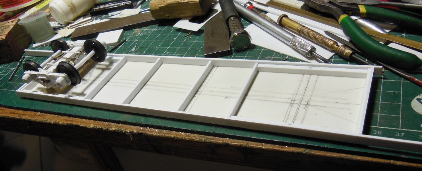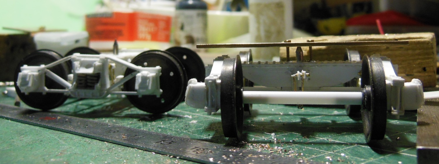 Puis les longerons extérieurs recoupés après le collage, et les supports pour les bogies.