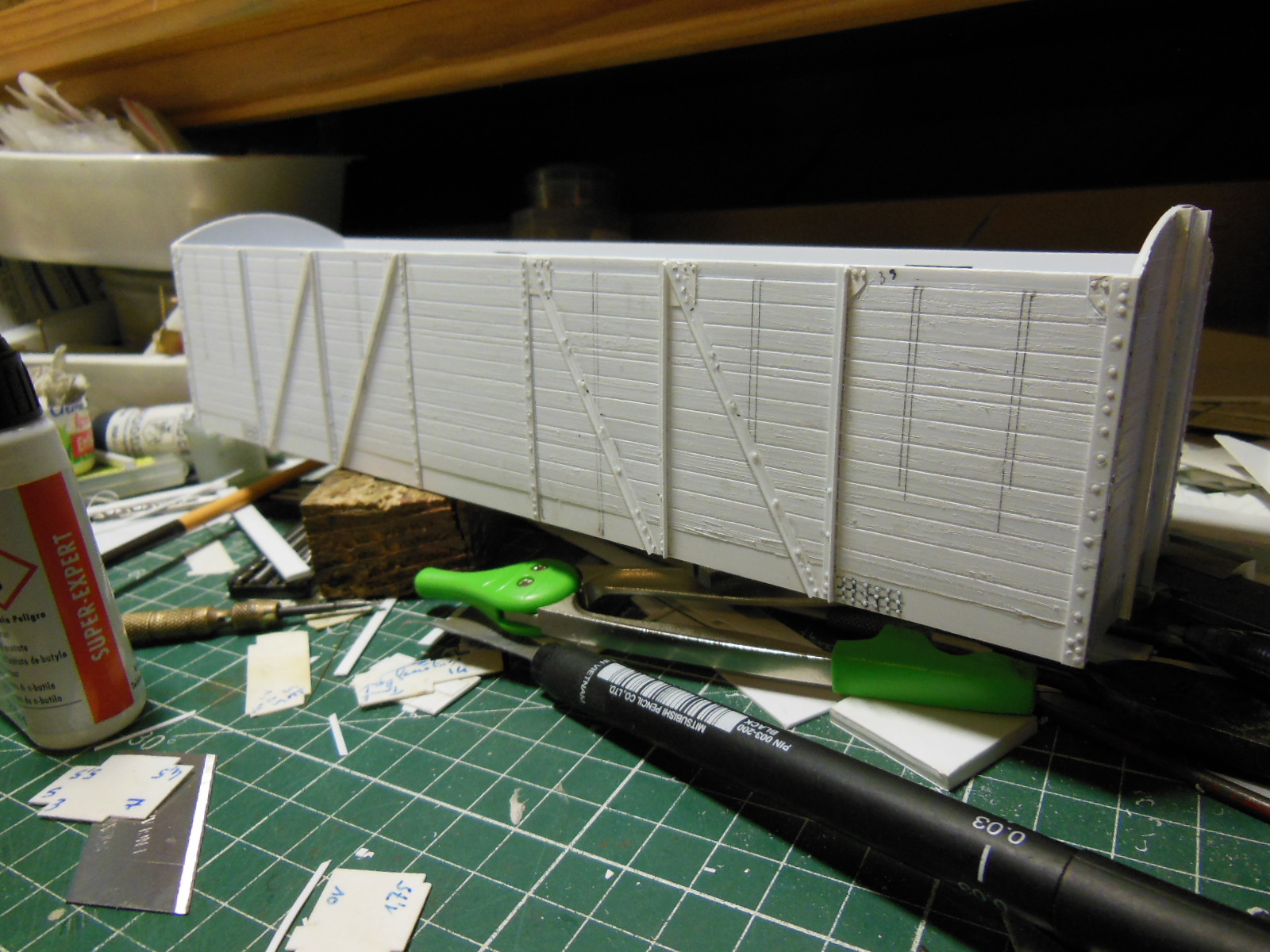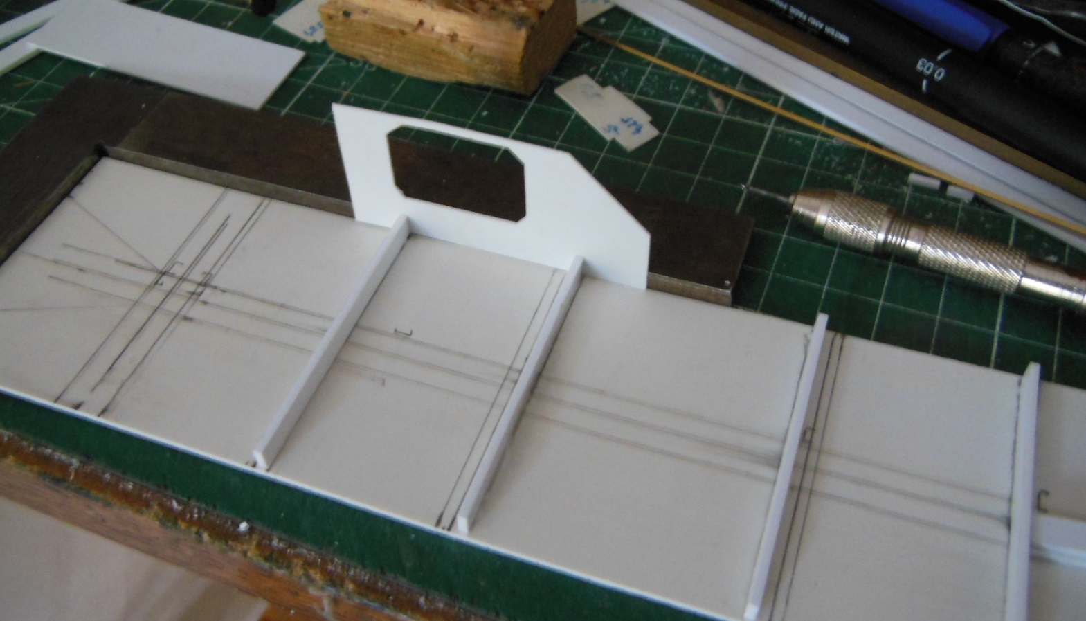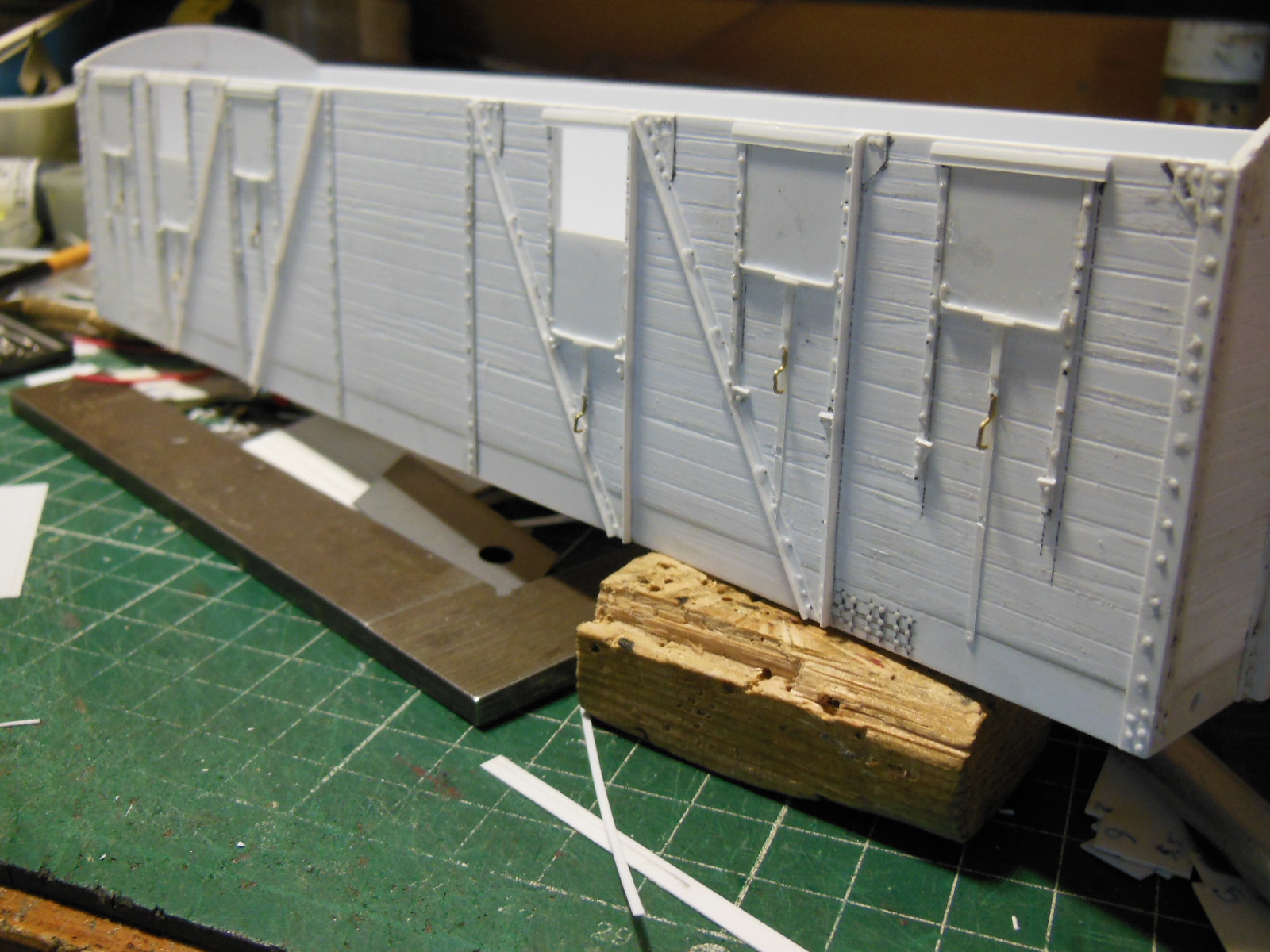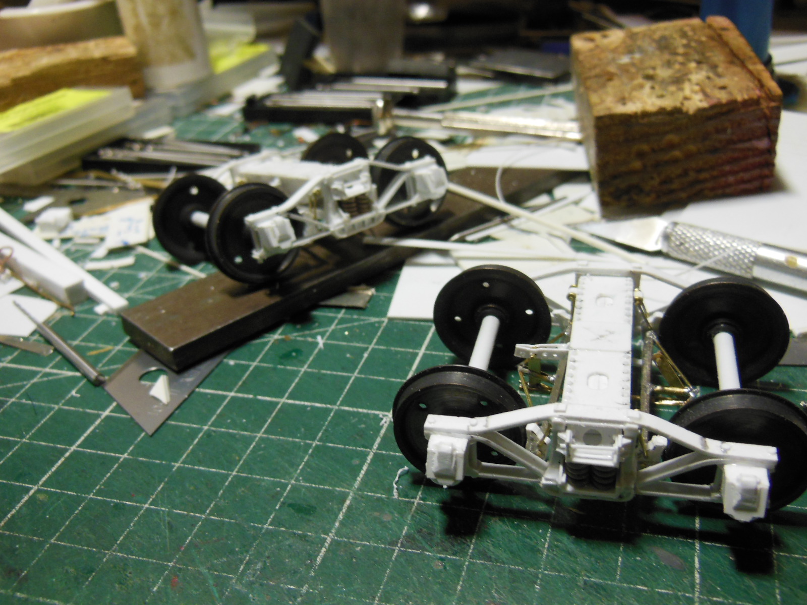 Puis les longerons extérieurs recoupés après le collage, et les supports pour les bogies.