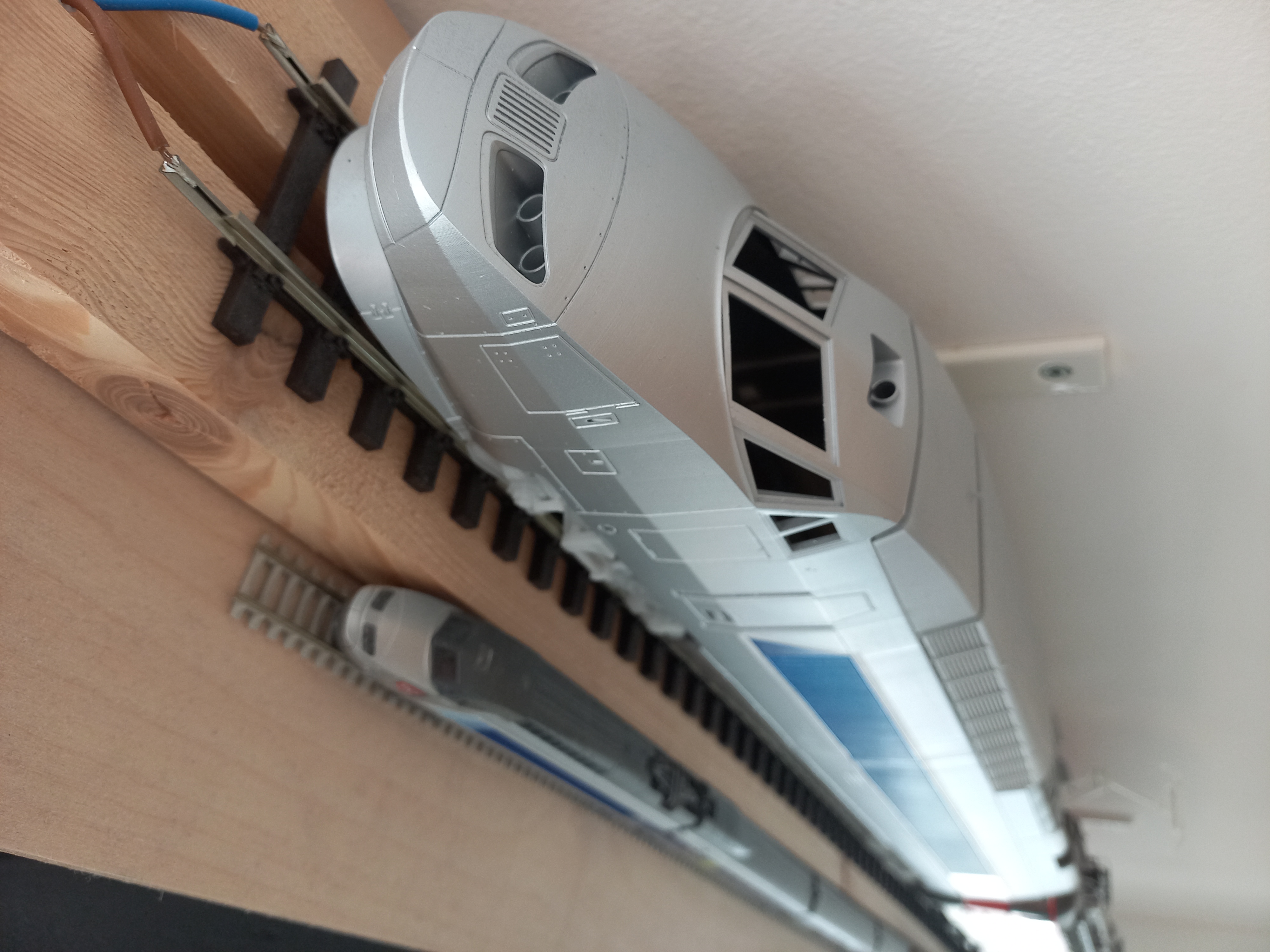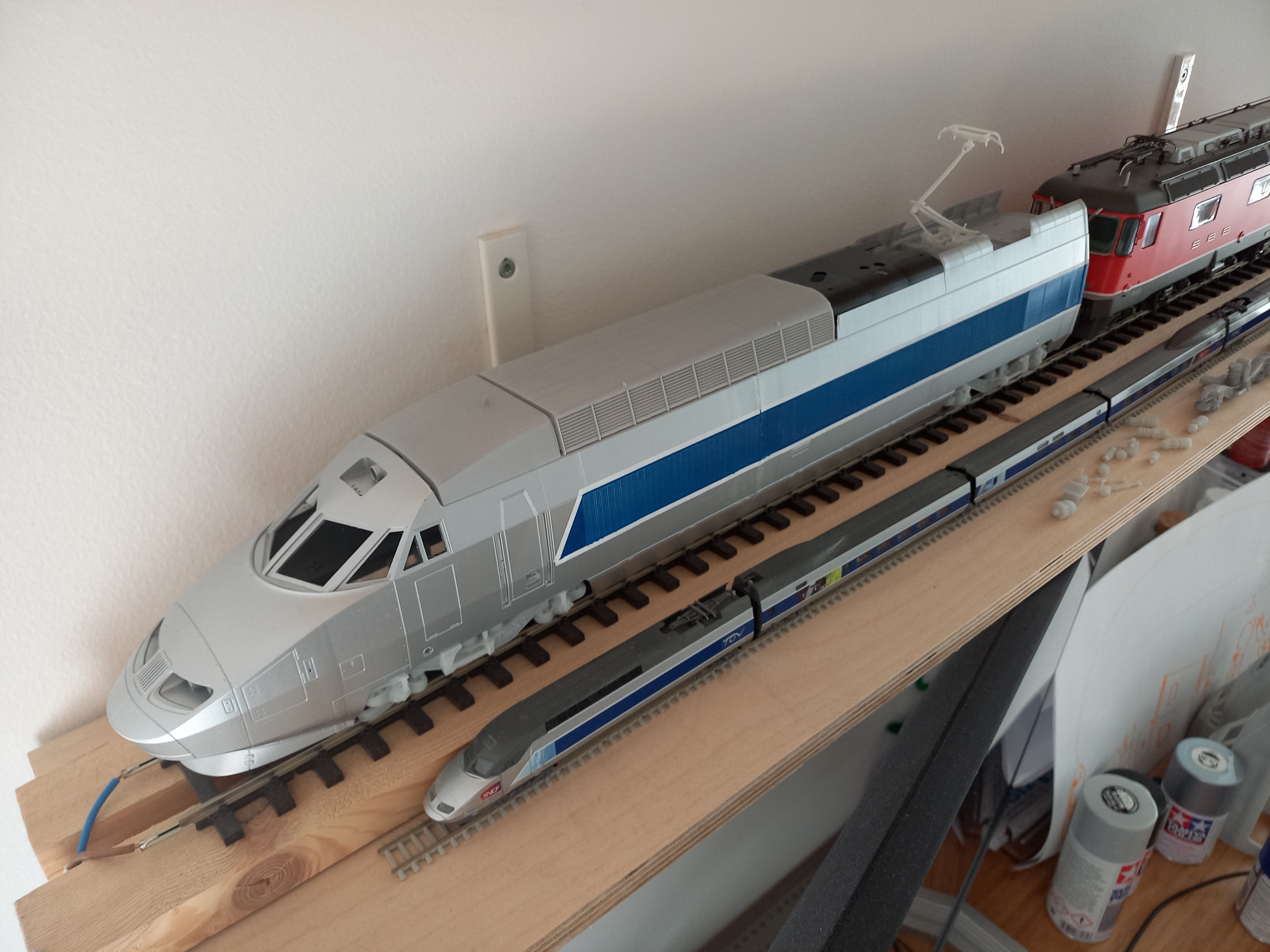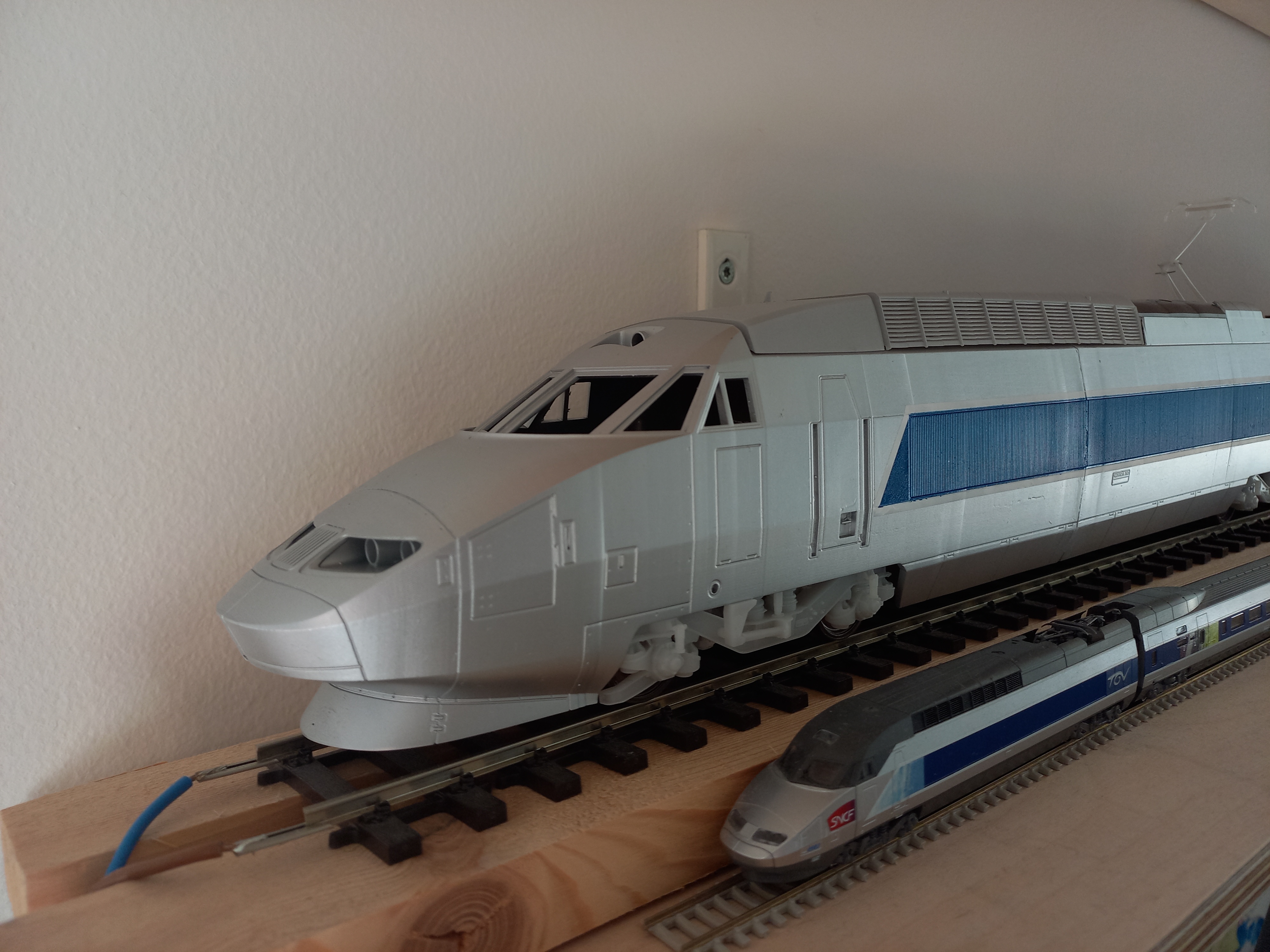 J'essaye de faire deux motrices, deux premières voitures et une régulière, à peu près la configuration de 1991 du record de vitesse sur la LGV Atlantique...en ce qui concerne les détails spécifiques de cette rame modifiée...pas encore sûr de ma décision. C'est encore moins bien documenté que les rames normales!
