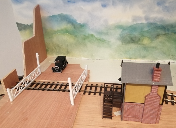 Bon, c'est juste posé provisoirement : il faut peinturlurer les barrières, et puis goudronner la route, patiner les rails, faire un plancher sur la voie ... etc ... :siffle: