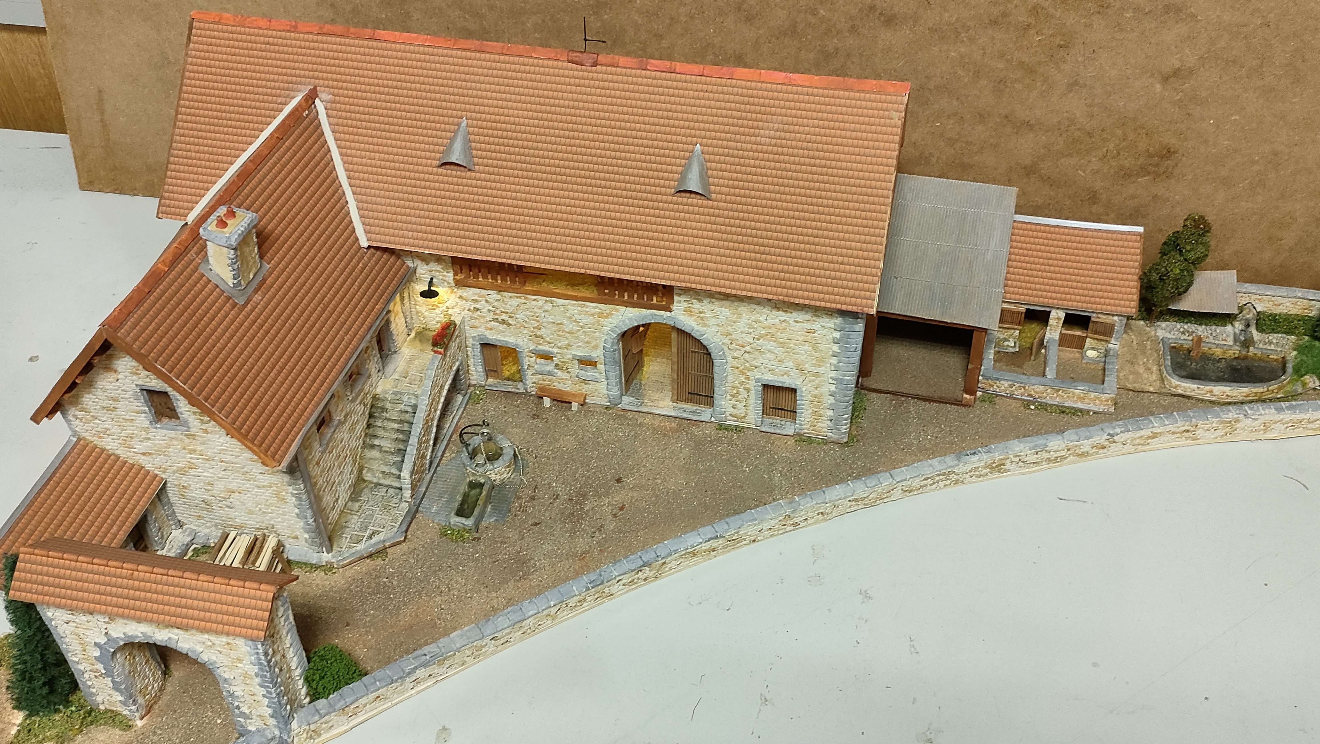 Le chemin de fer serpente dans la campagne, voici ma ferme à l'échelle zéro.