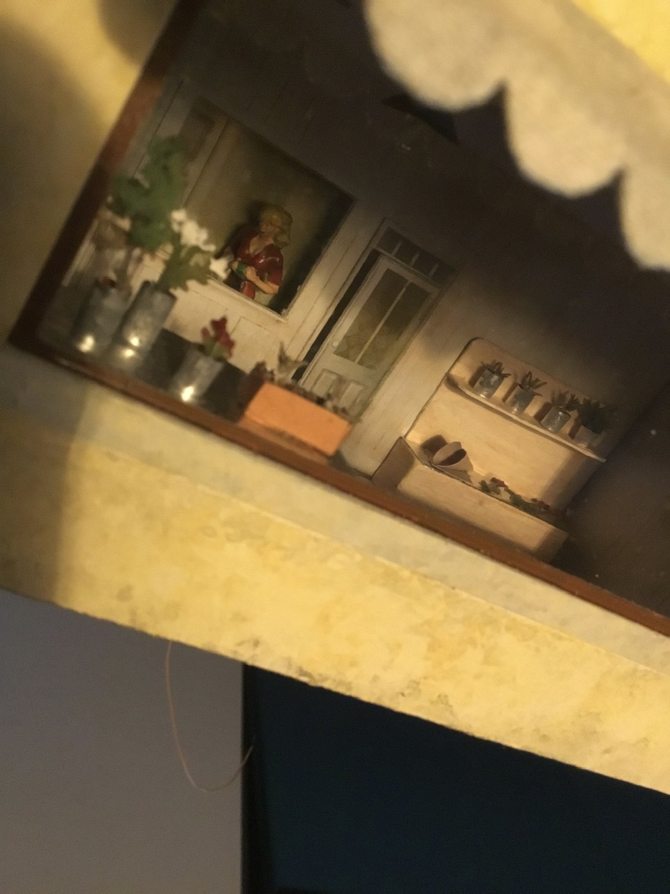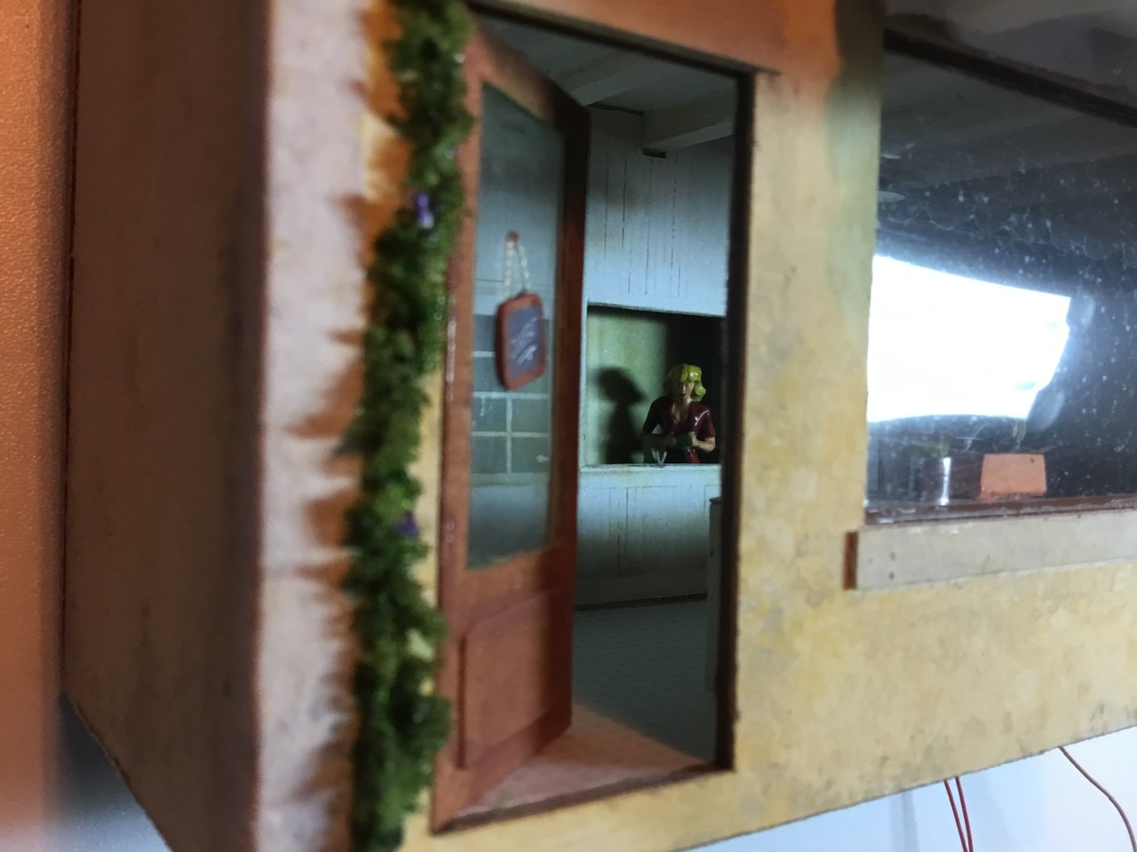 Je vais en profiter pour recâbler les lumières qui n’ont pas supporté les démontages. L’aménagement intérieur fait par Alice est détaillé et comporte un trompe l’œil pour l’arrière boutique, ce serait dommage de le laisser dans le noir.