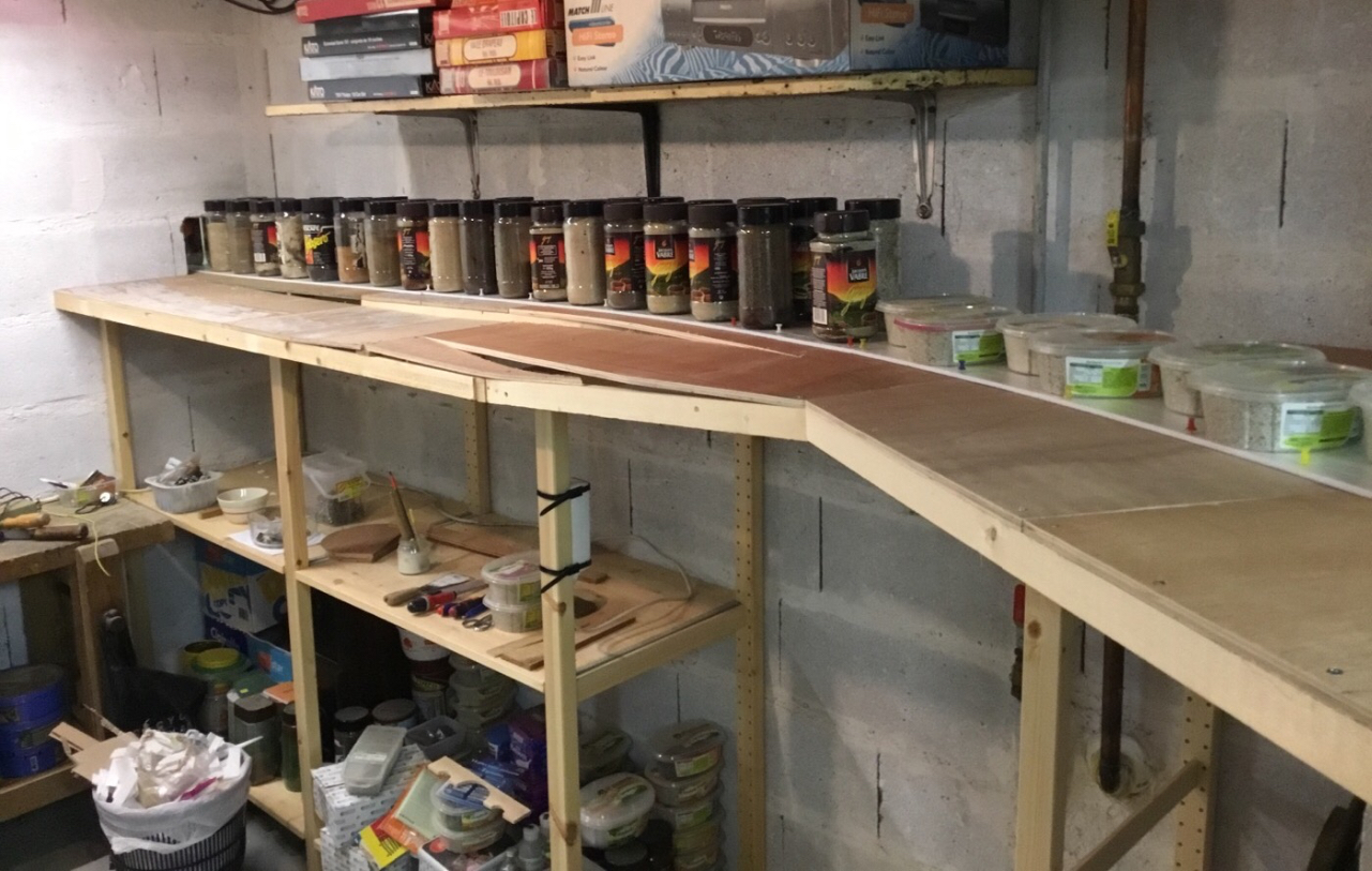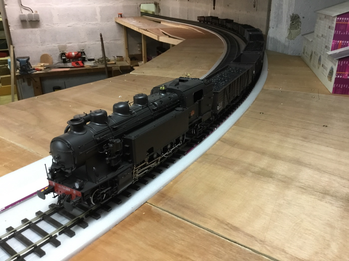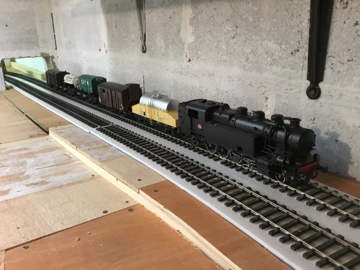 Une entrée de tunnel s'adossera au mur et une ligne droite d'environ 1,40m servira de transition avant d'attaquer la rampe en courbe. Dans cette pièce, j'ai deux contraintes: je dois garder un module démontable pour accéder librement à la chaufferie et je dois monter la gare de 15cm par rapport au plan zero pour laisser le passage libre des voies principales qui vont boucler le réseau dans la suite du projet...mais ça n'est pas pour tout de suite!