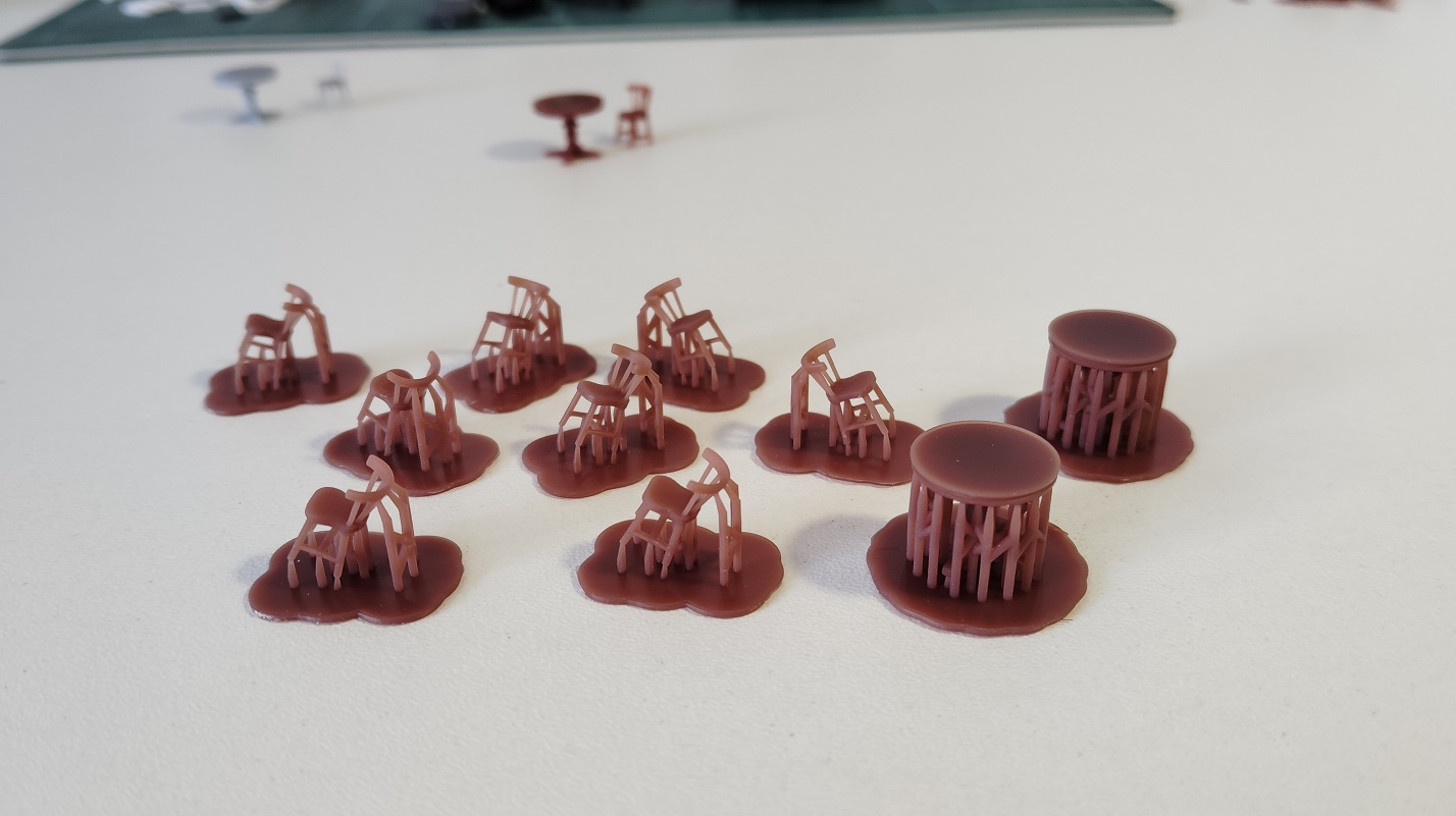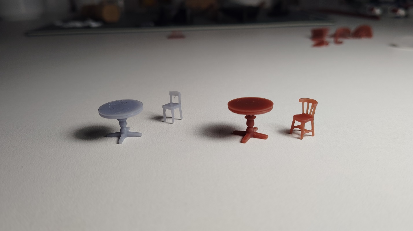 Les tables & les chaises à dossiers incurvés pour le Saloon. La table & la chaise de gauche sont des pièces de chez www.galopin-modeles.com.