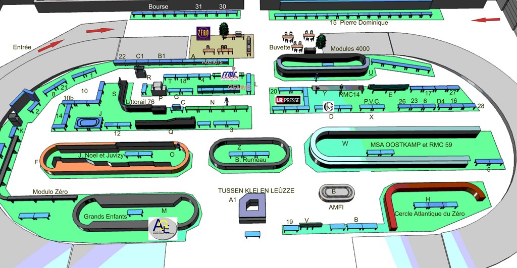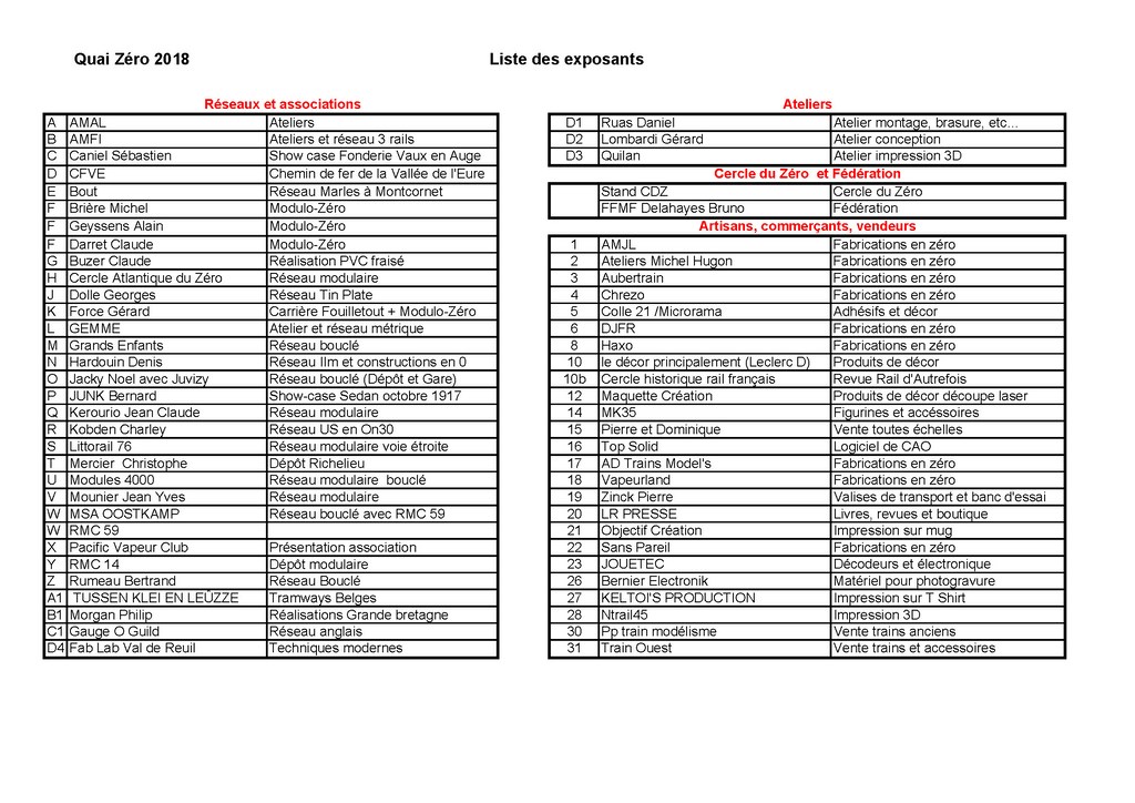 Voici donc le plan et la liste. Normalement tout est figé, mais il reste un peu de place et j'attends une ou deux confirmations, avec peut-être (n'en déplaise à certains) un réseau en HO et un en N. Il faut bien montrer au public qu'il n'y a pas que le zéro.