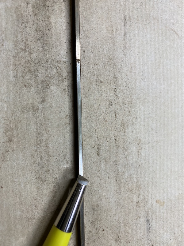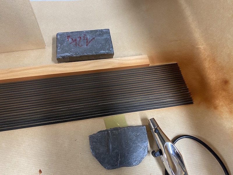 Les rails sont tenus bord à bord par une baguette carrée en bois à l’arrière, bloquée par des morceaux de plomb, et à l’avant par deux petits carrés laiton bloqués de la même manière.