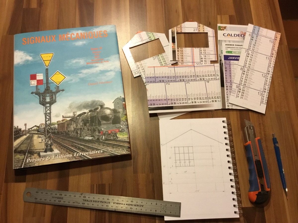 Mais avant tout je vais commencer par un poste d'aiguillage pour protéger les circulations. Travail à l'ancienne classique: livre de référence (l'excellent ouvrage de D.Wurmser) réglet cutter et calepin pour croquis. C'est parti !